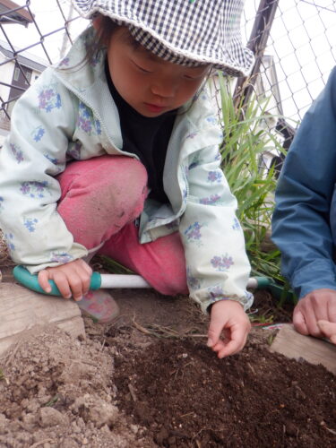速足で保育園に戻って、さっそく畑に植えていきます。