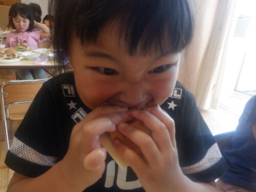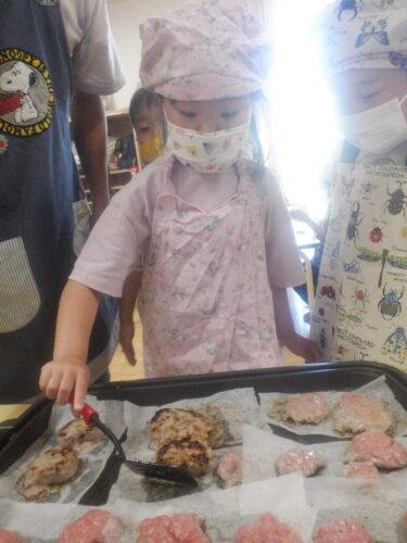 ④最後は、ハンバーグ、好きな具材とソース(?!)をバンズにはさめたら・・・。