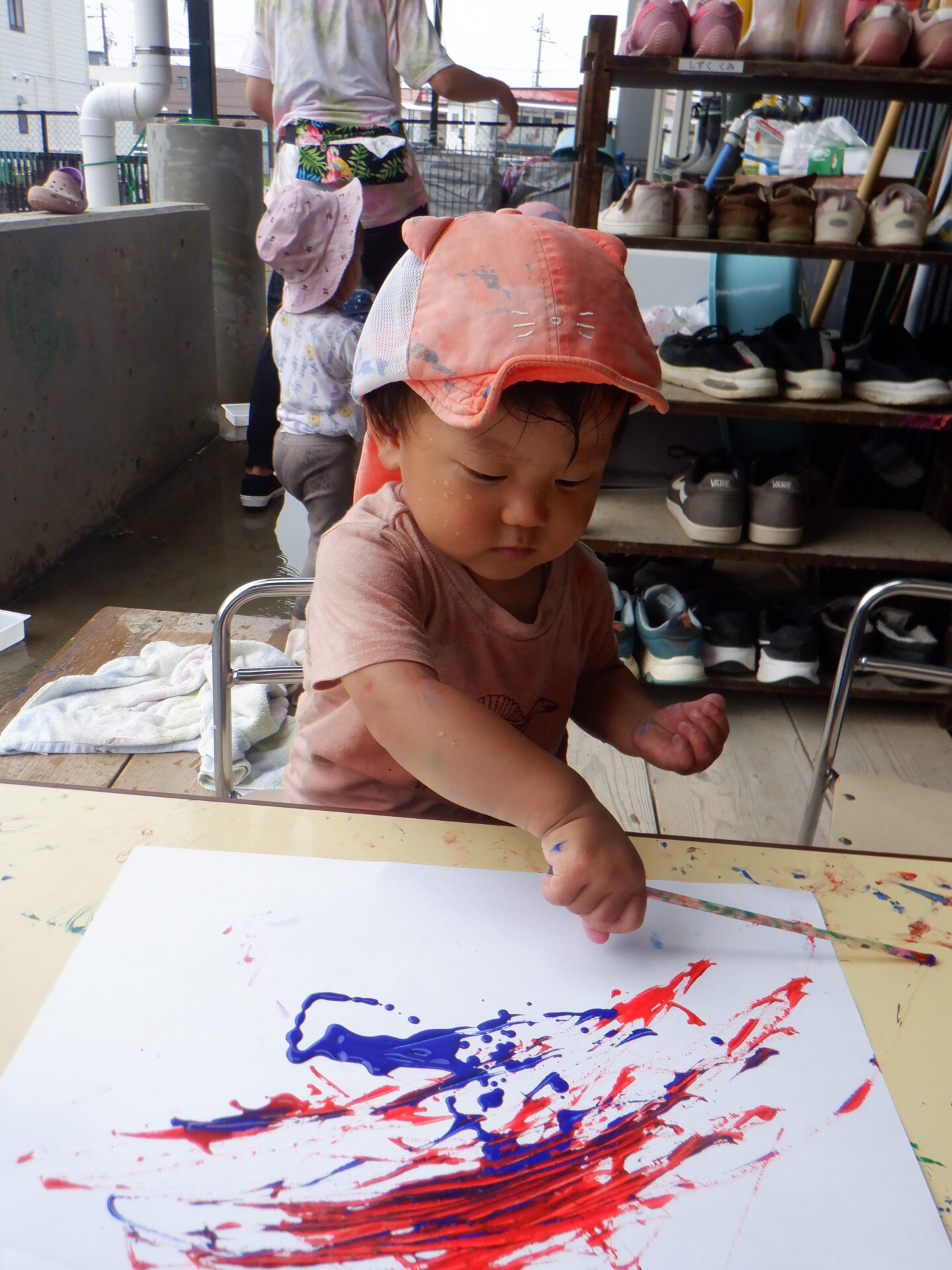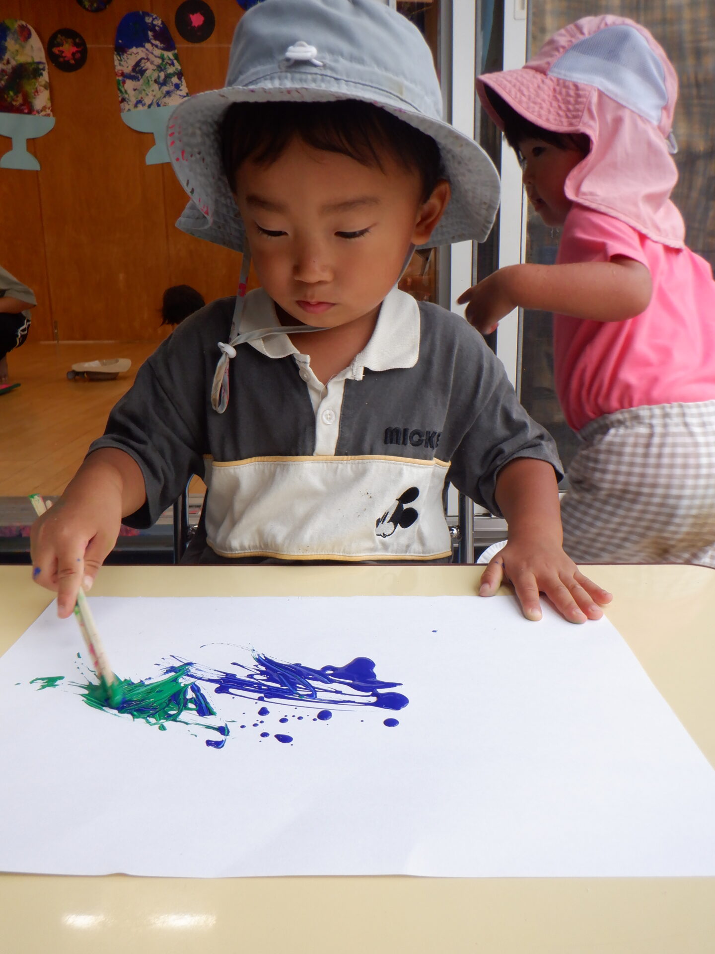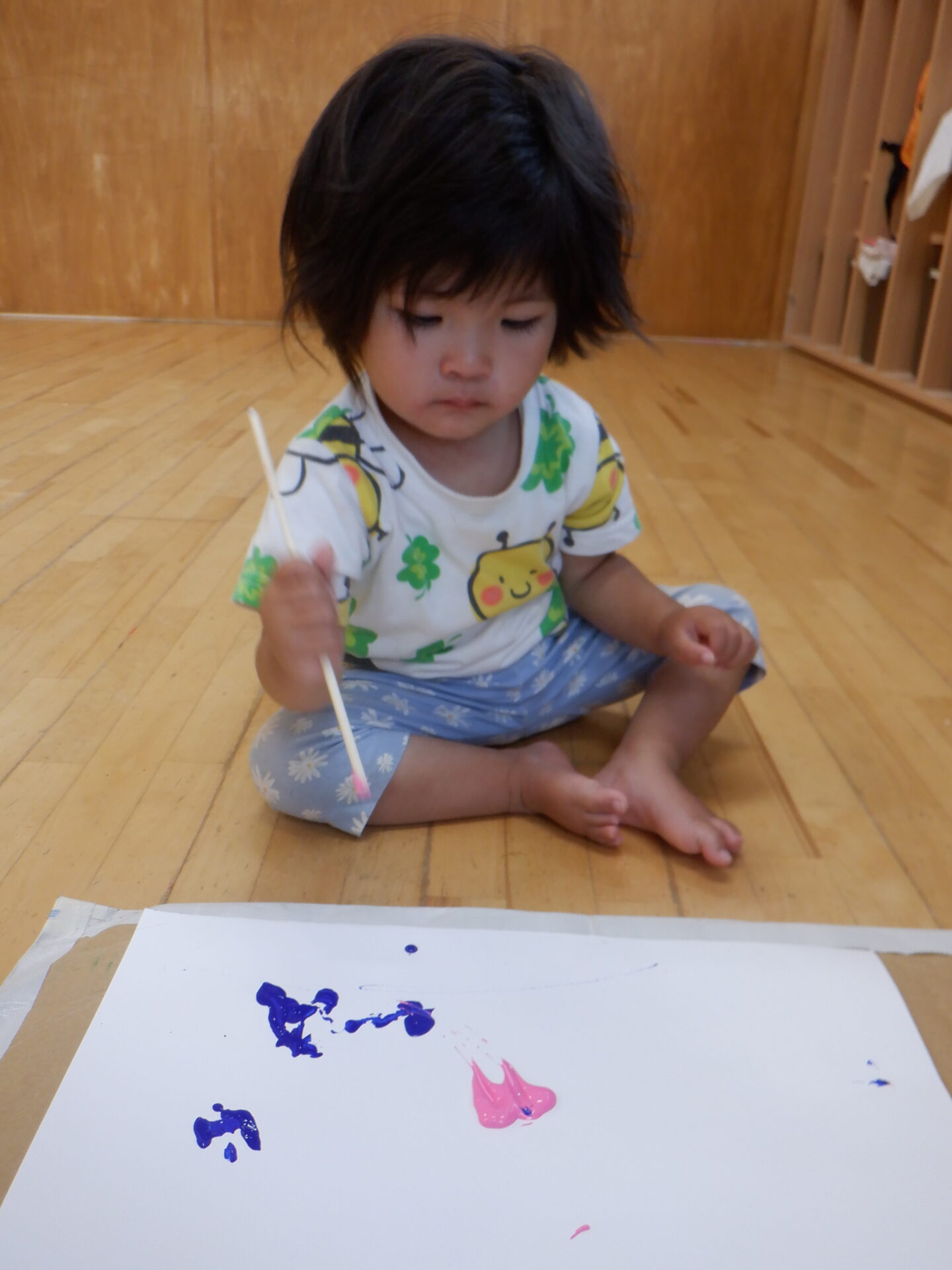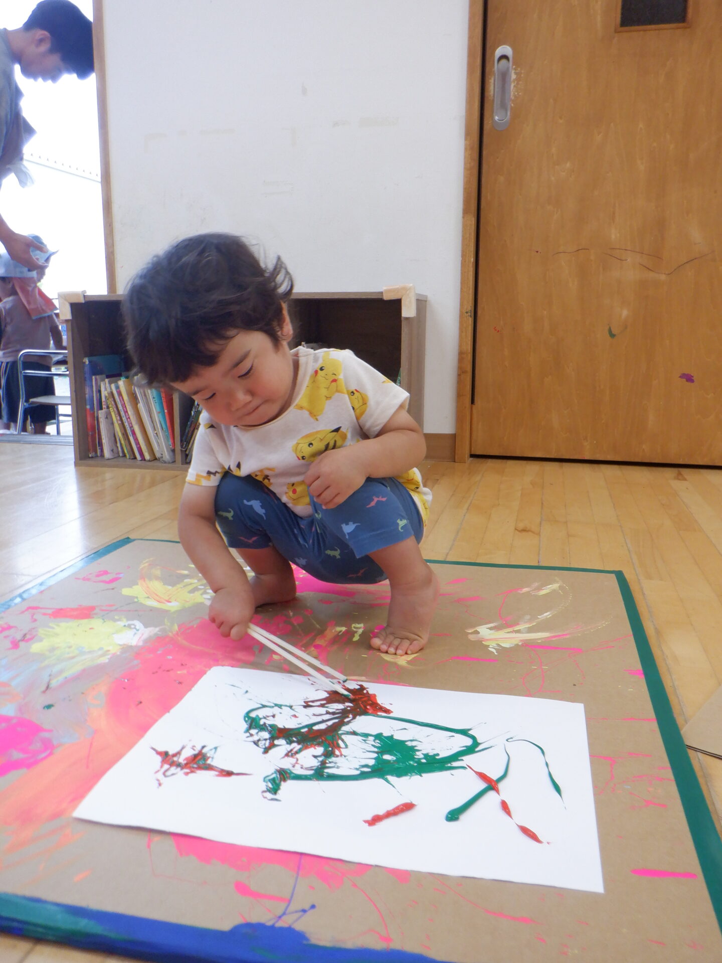 2024.07.16 しずく組(1歳児) ブログ やめられない。 割り箸を使って色遊びをしました。 自分で好きな色を選んで横に伸ばしたり、ちょんちょんと絵の具をつけてみたりすると・・・。 素敵な模様がどんどんできて、なかなかやめられなくなった子ども達です。 色が混ざっていくのも楽しい!! 一覧へ戻る