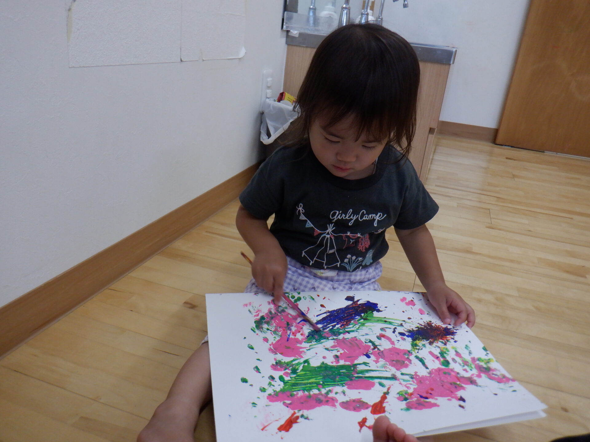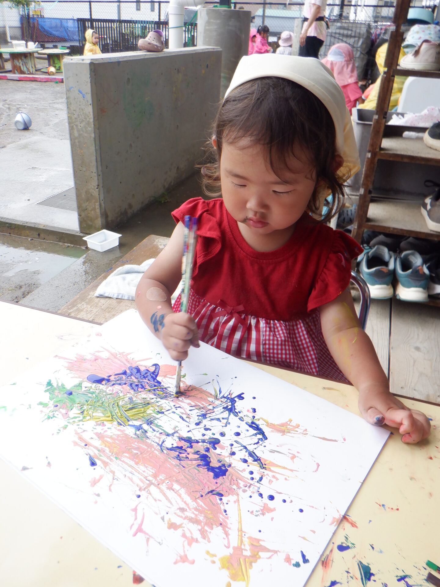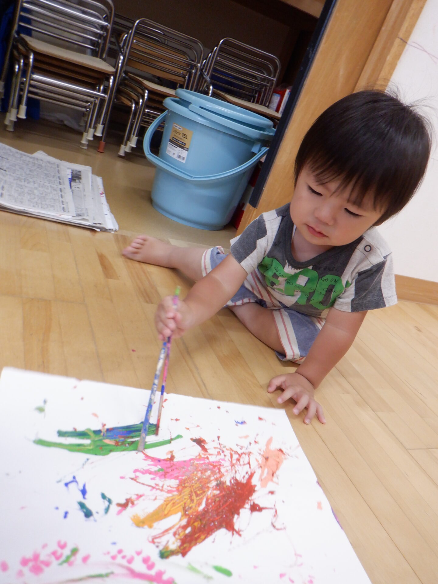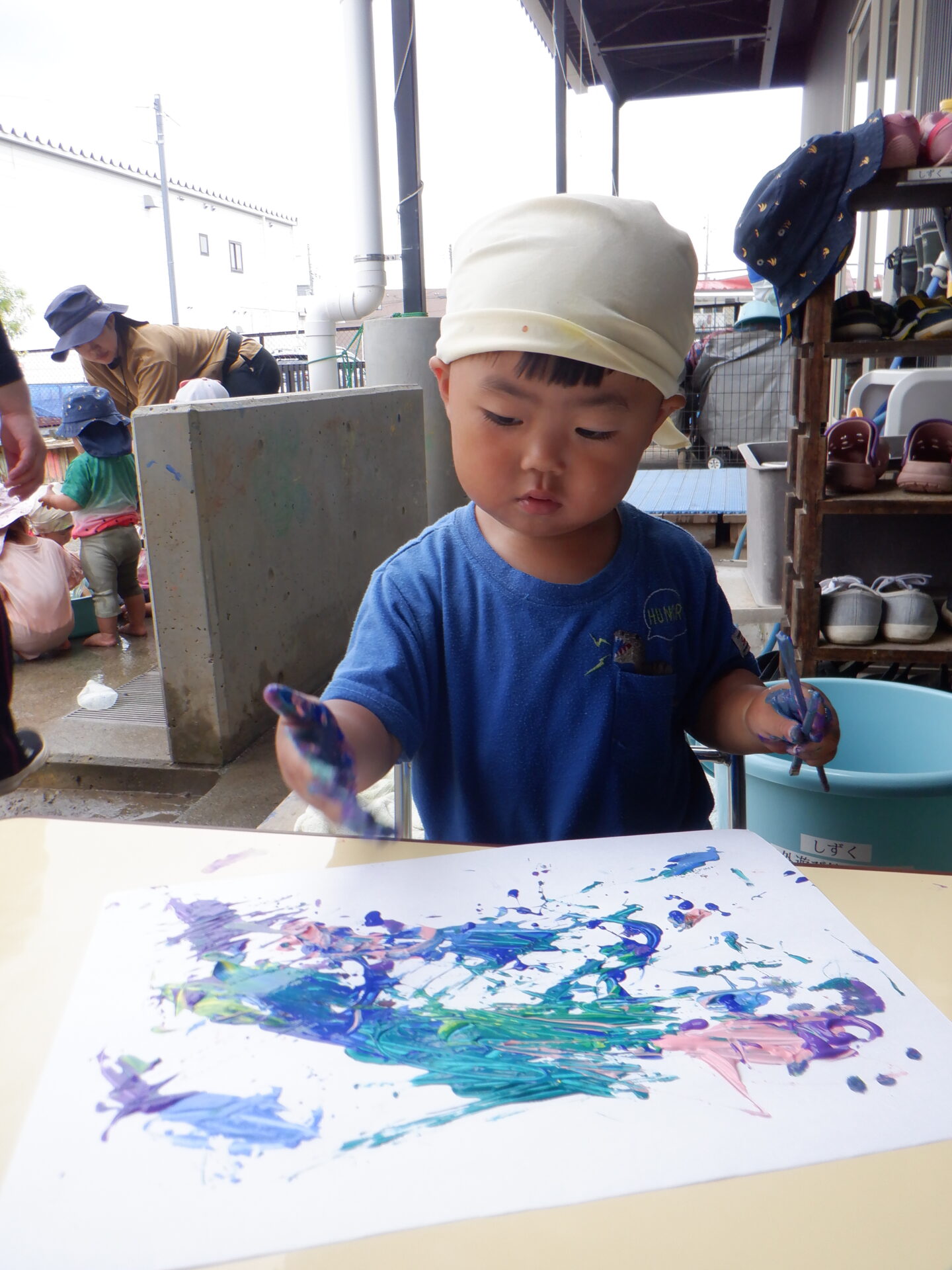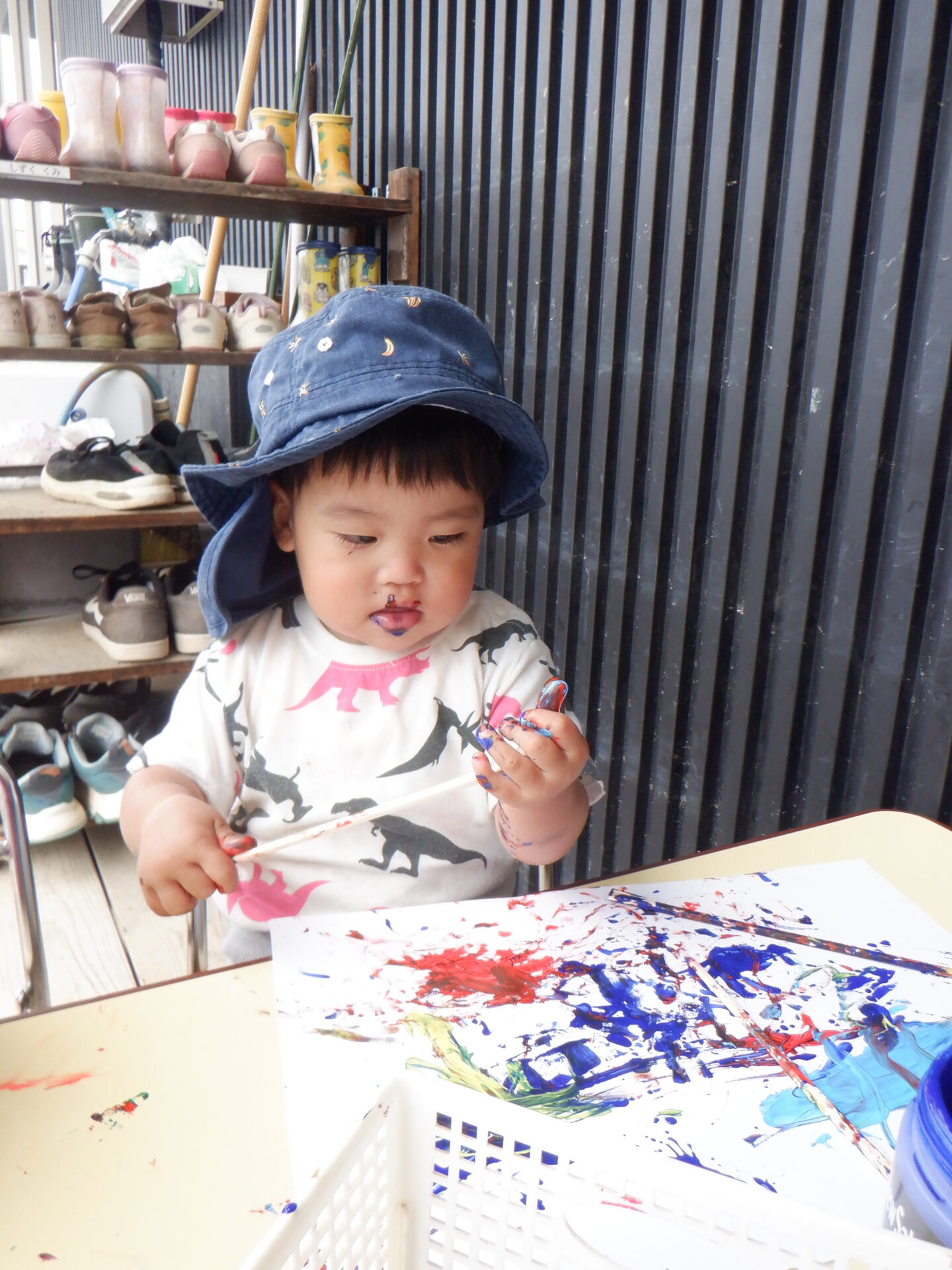 2024.07.16 しずく組(1歳児) ブログ やめられない。 割り箸を使って色遊びをしました。 自分で好きな色を選んで横に伸ばしたり、ちょんちょんと絵の具をつけてみたりすると・・・。 素敵な模様がどんどんできて、なかなかやめられなくなった子ども達です。 色が混ざっていくのも楽しい!! 一覧へ戻る