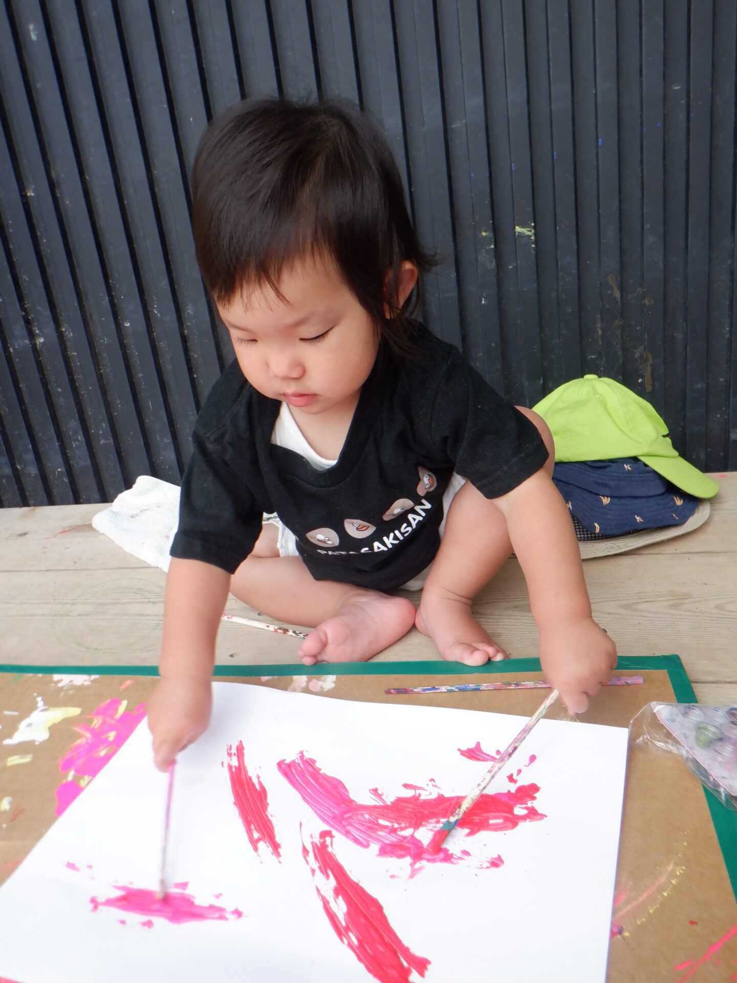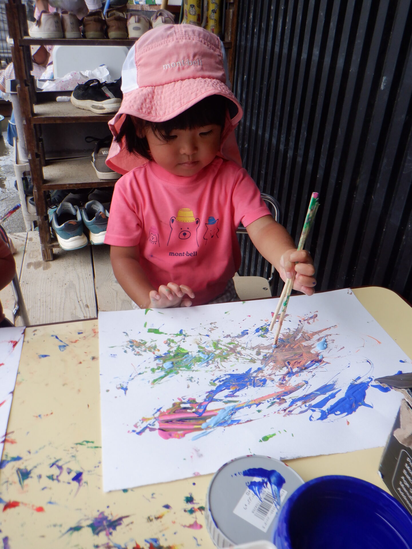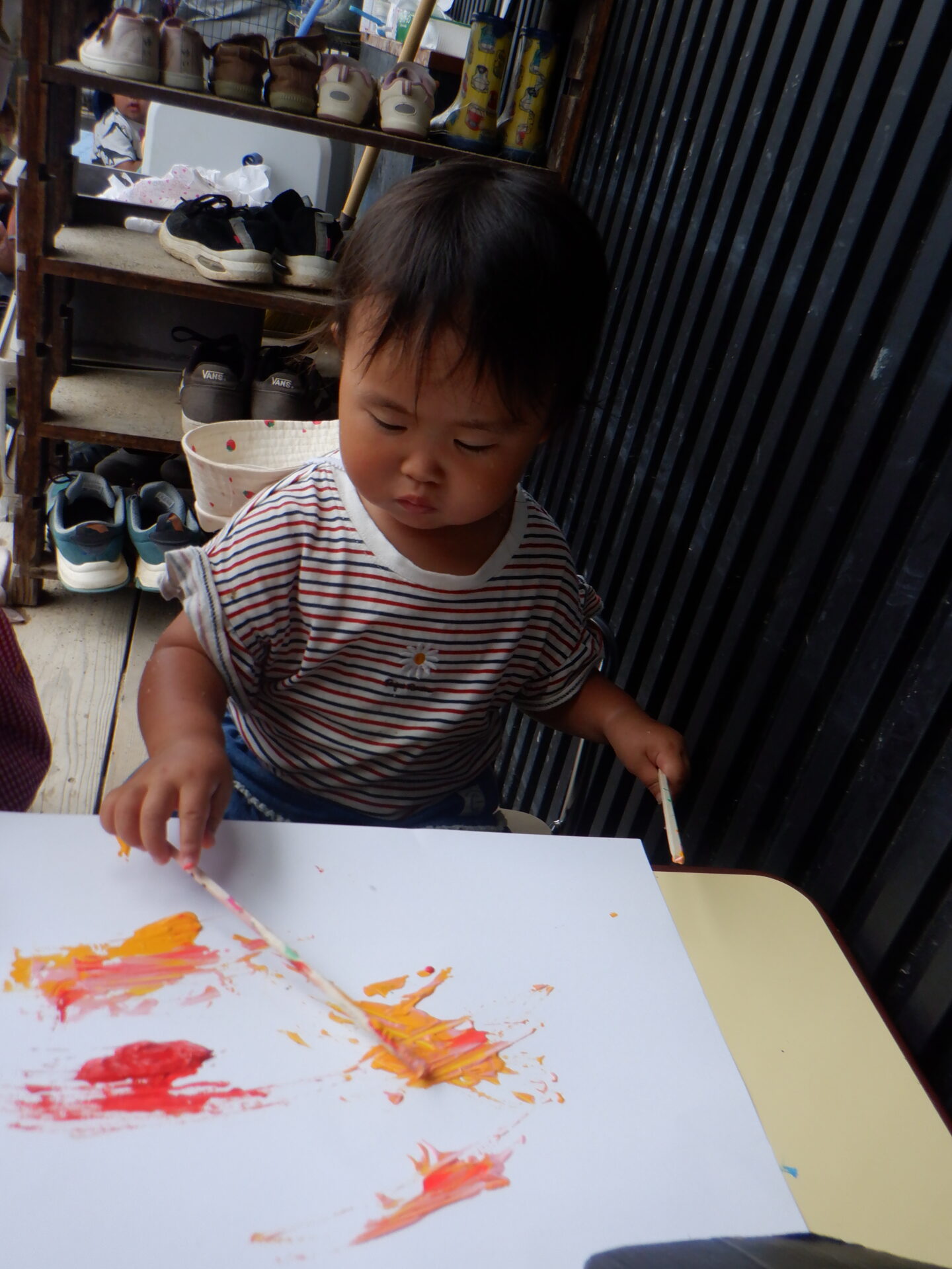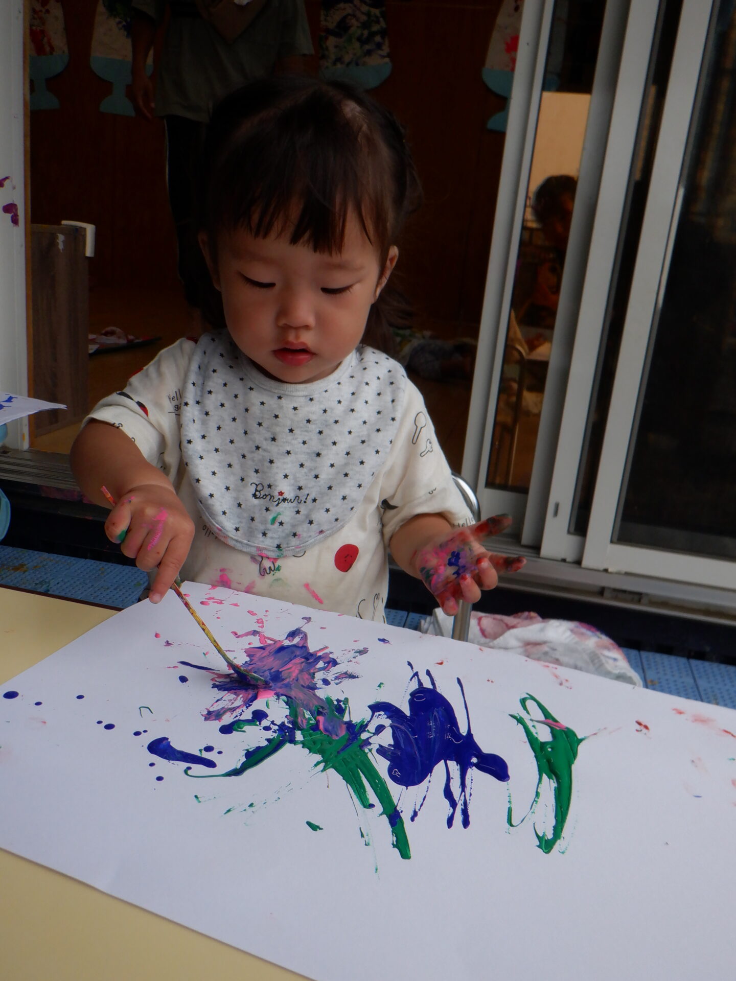 2024.07.16 しずく組(1歳児) ブログ やめられない。 割り箸を使って色遊びをしました。 自分で好きな色を選んで横に伸ばしたり、ちょんちょんと絵の具をつけてみたりすると・・・。 素敵な模様がどんどんできて、なかなかやめられなくなった子ども達です。 色が混ざっていくのも楽しい!! 一覧へ戻る