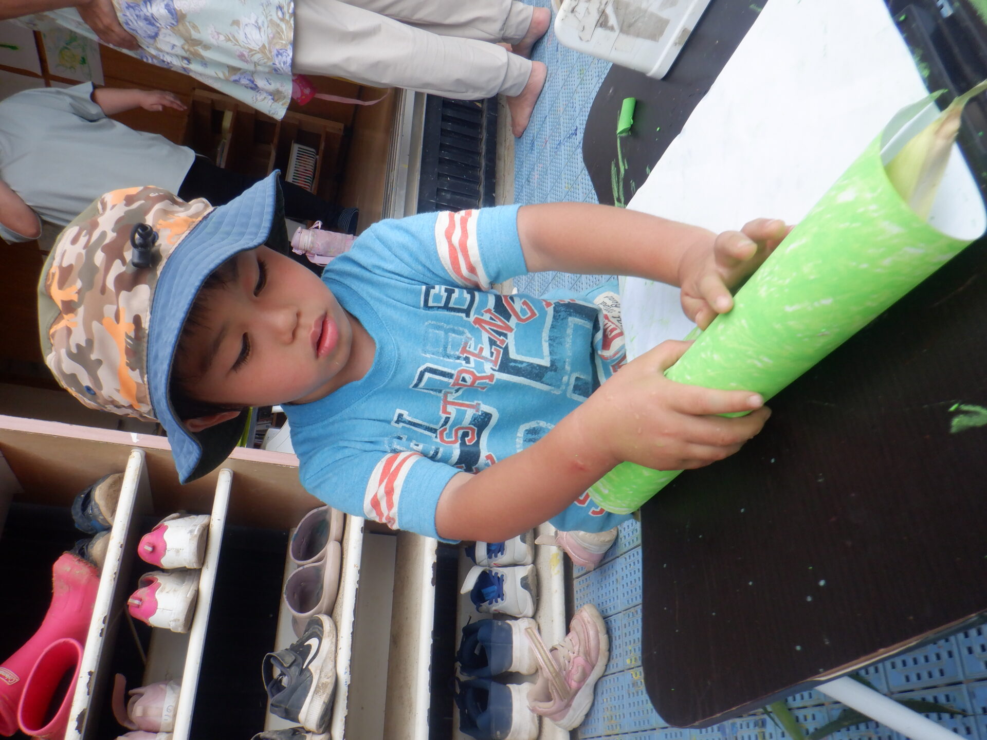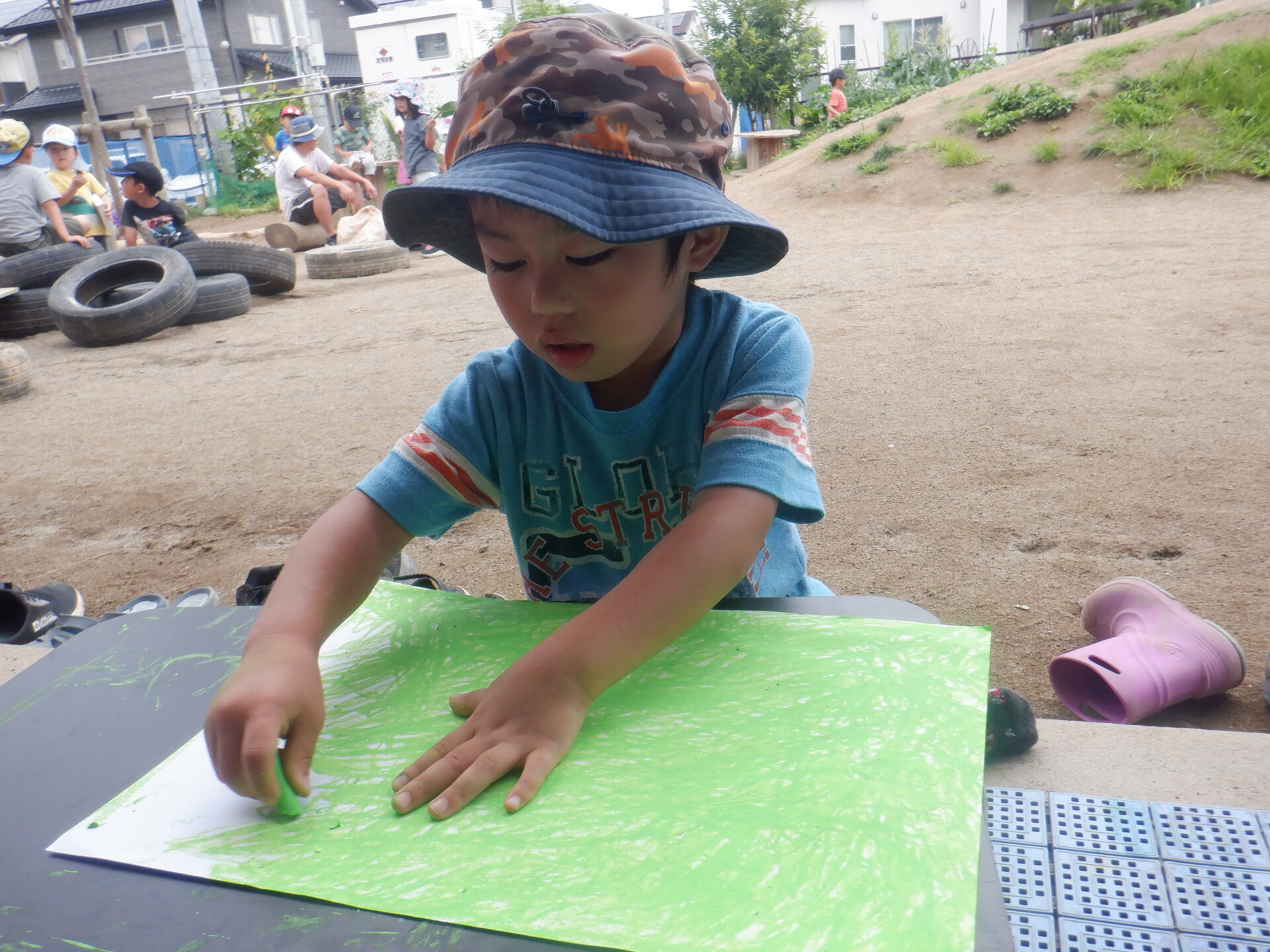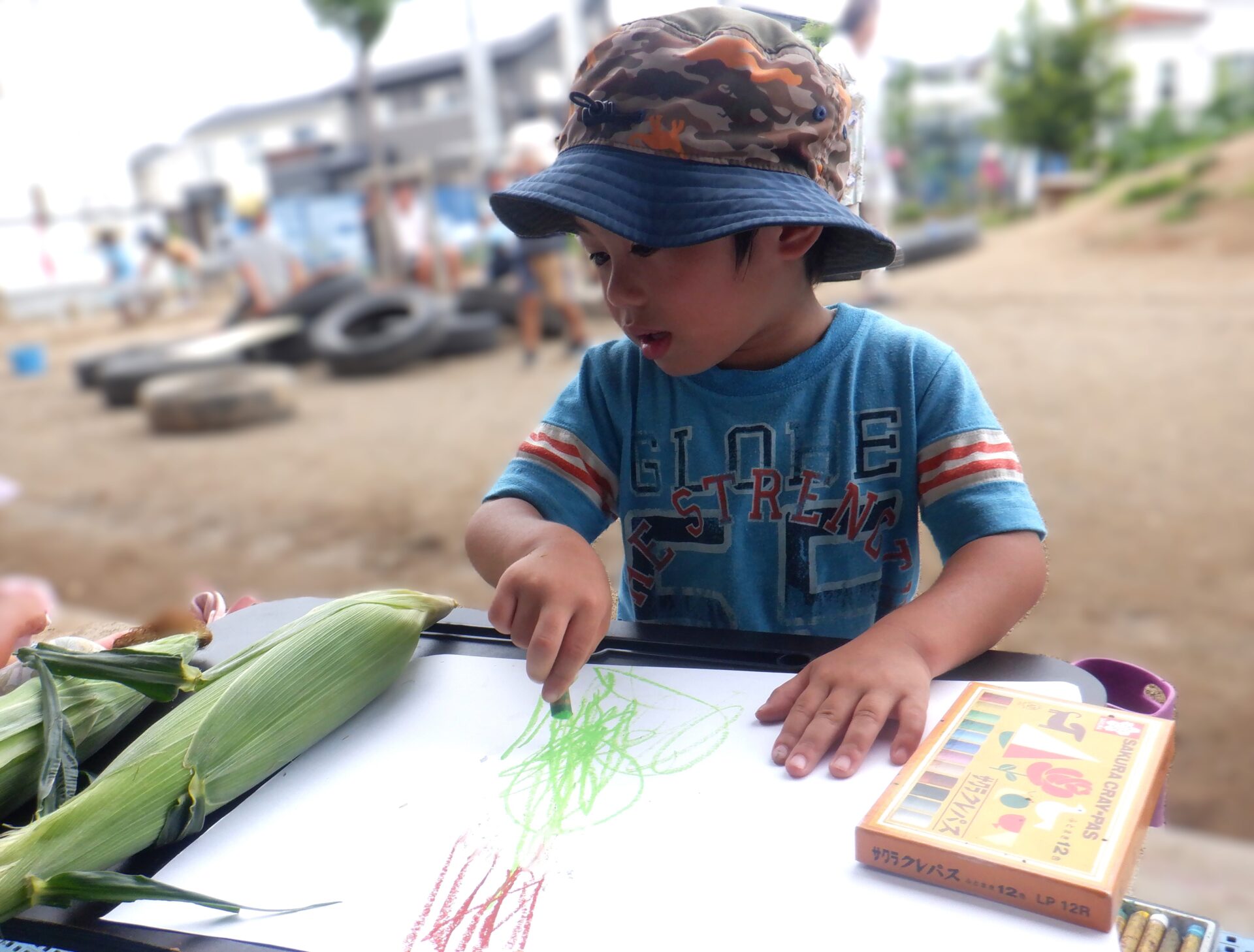 描くだけでは物足りなくなり、画用紙いっぱいにクレヨンを走らせ、収穫したとうもろこしを・・・。
