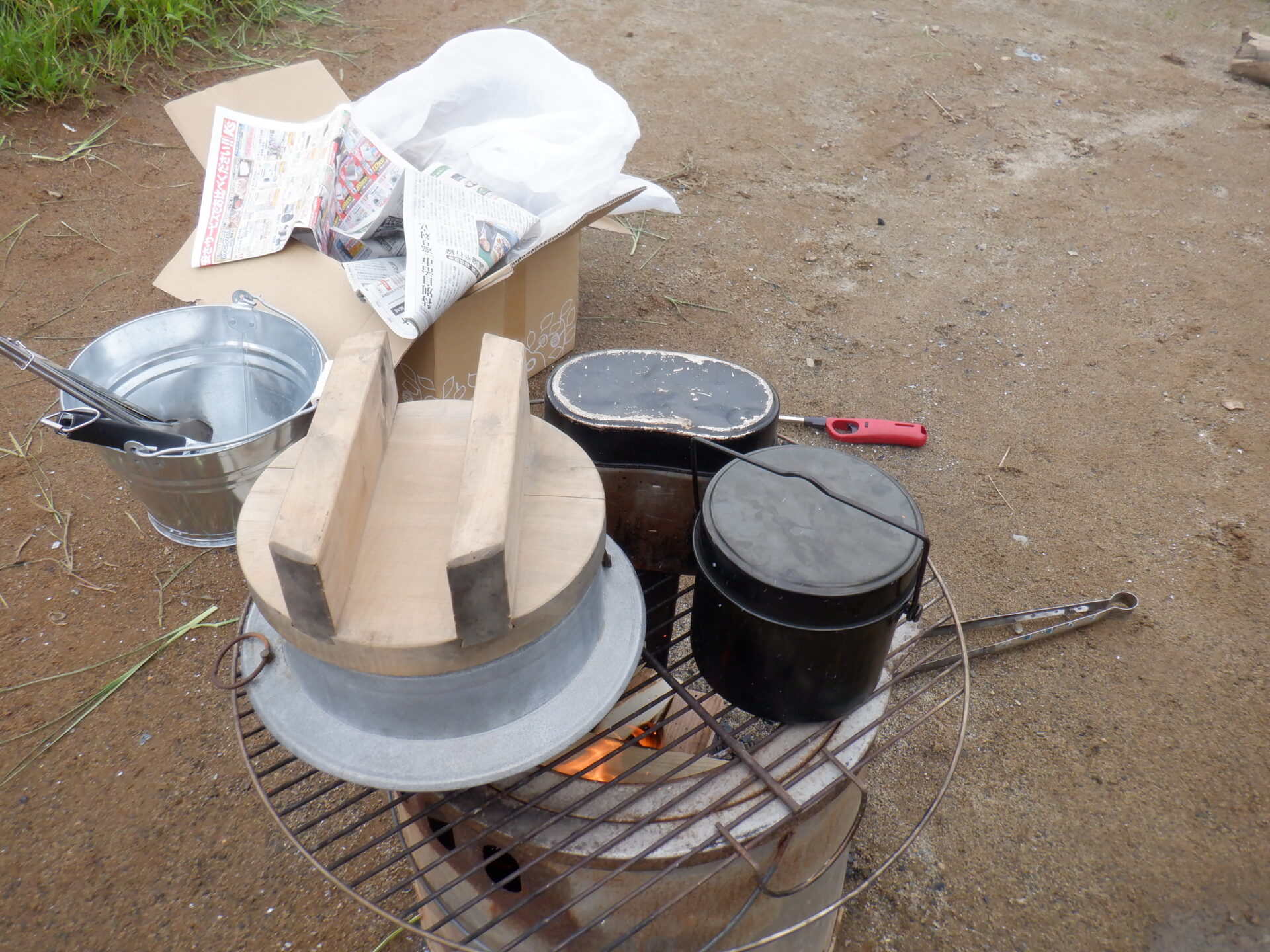 キャンプの余韻を楽しむために、飯盒と釜でお米を炊き…。