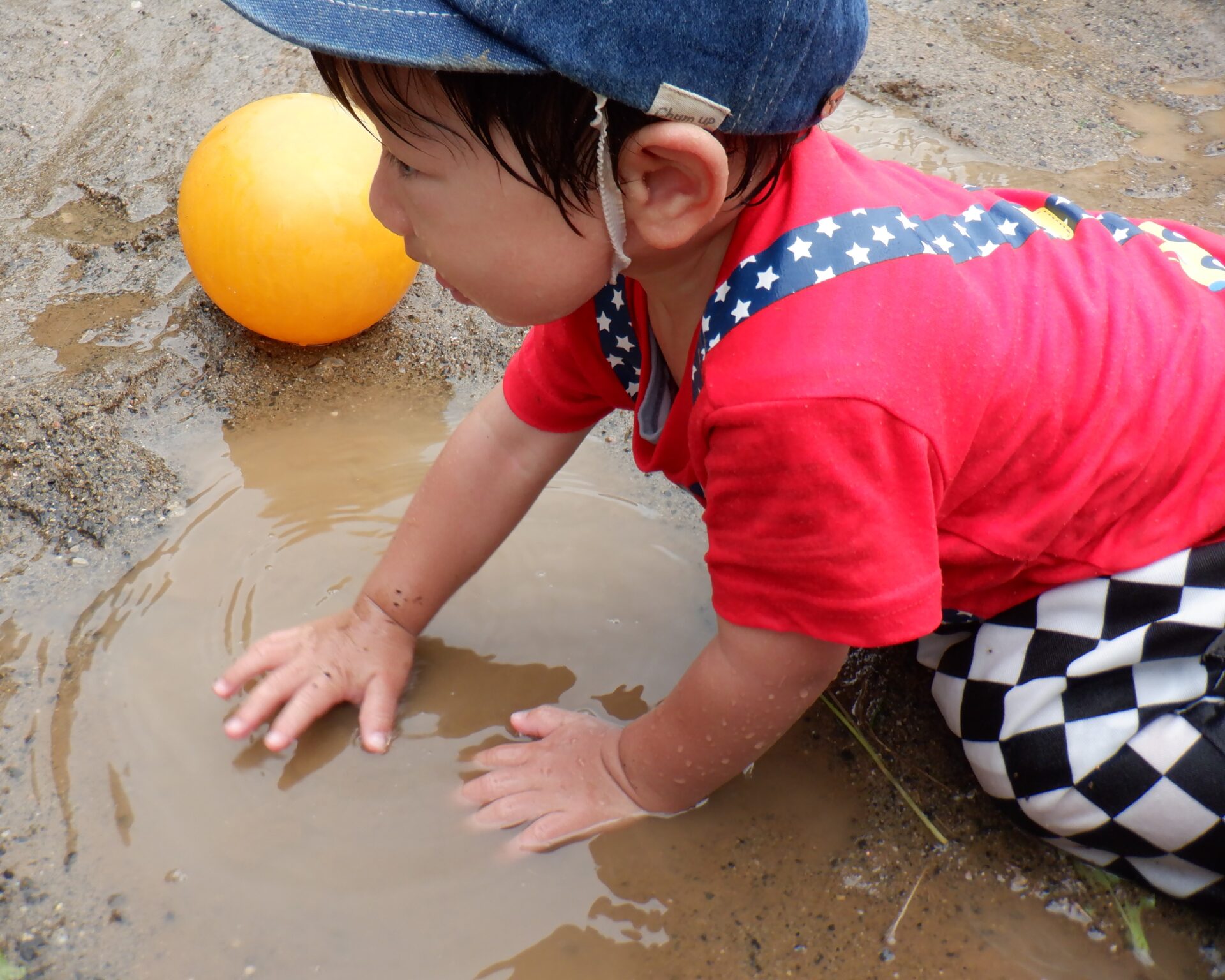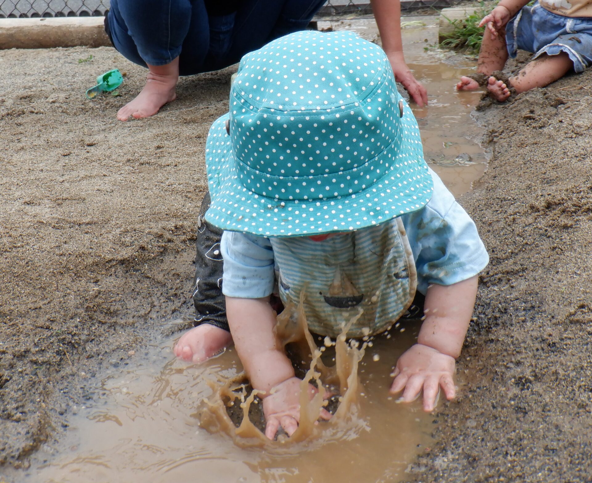 水や泥などに自分のペースで触れながら、様々な感触を全身で楽しむ子どもたちです!