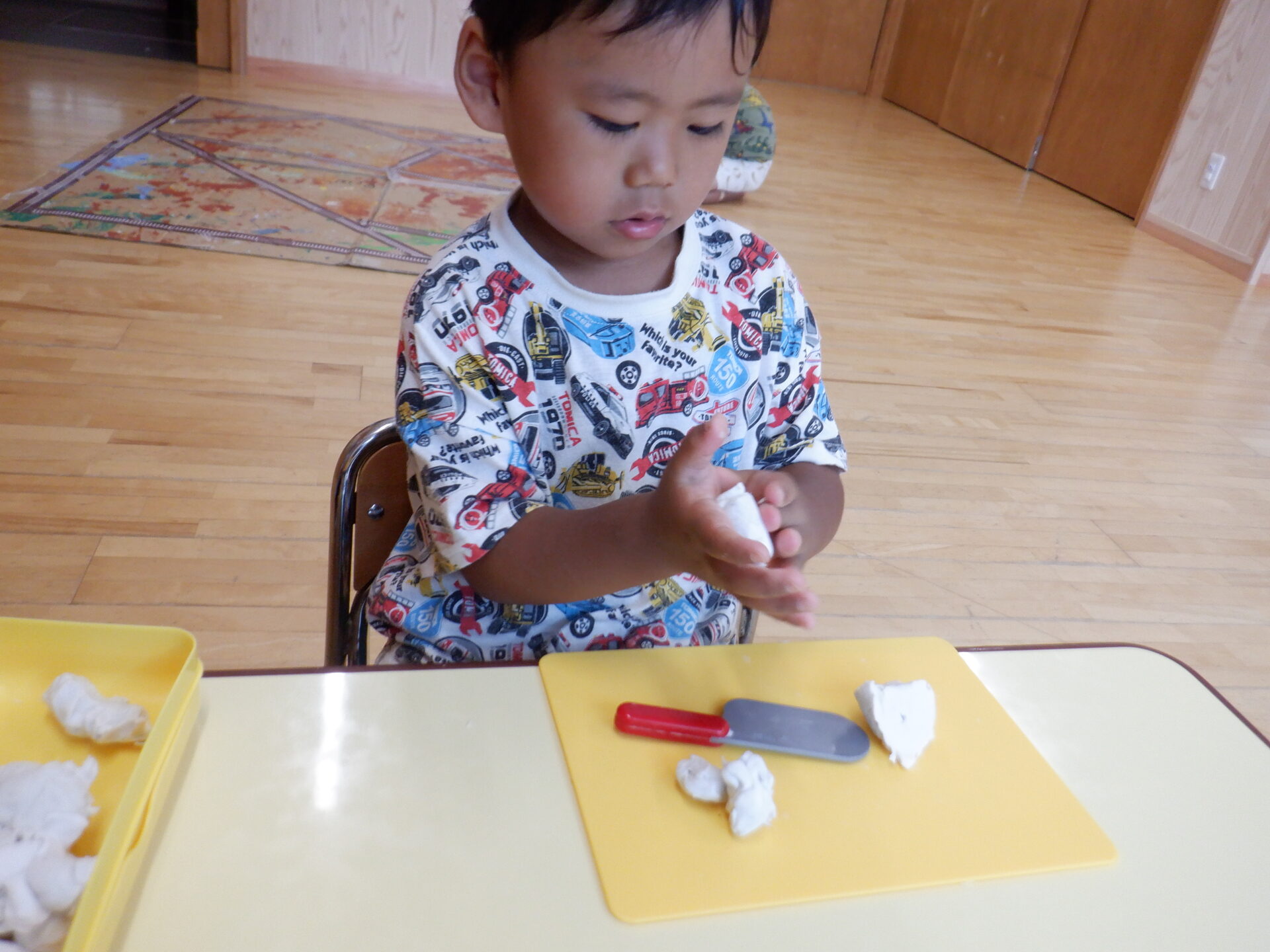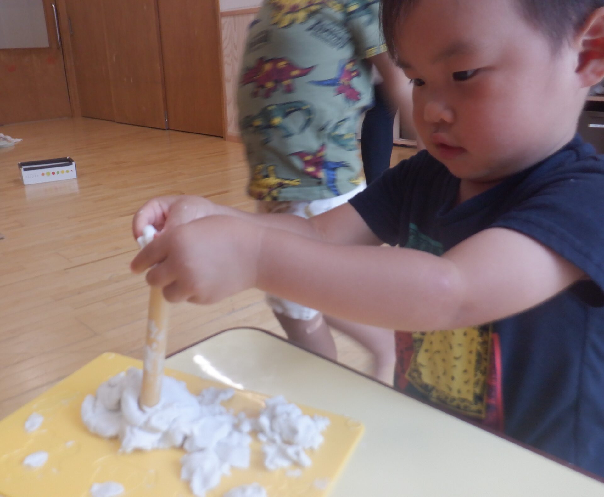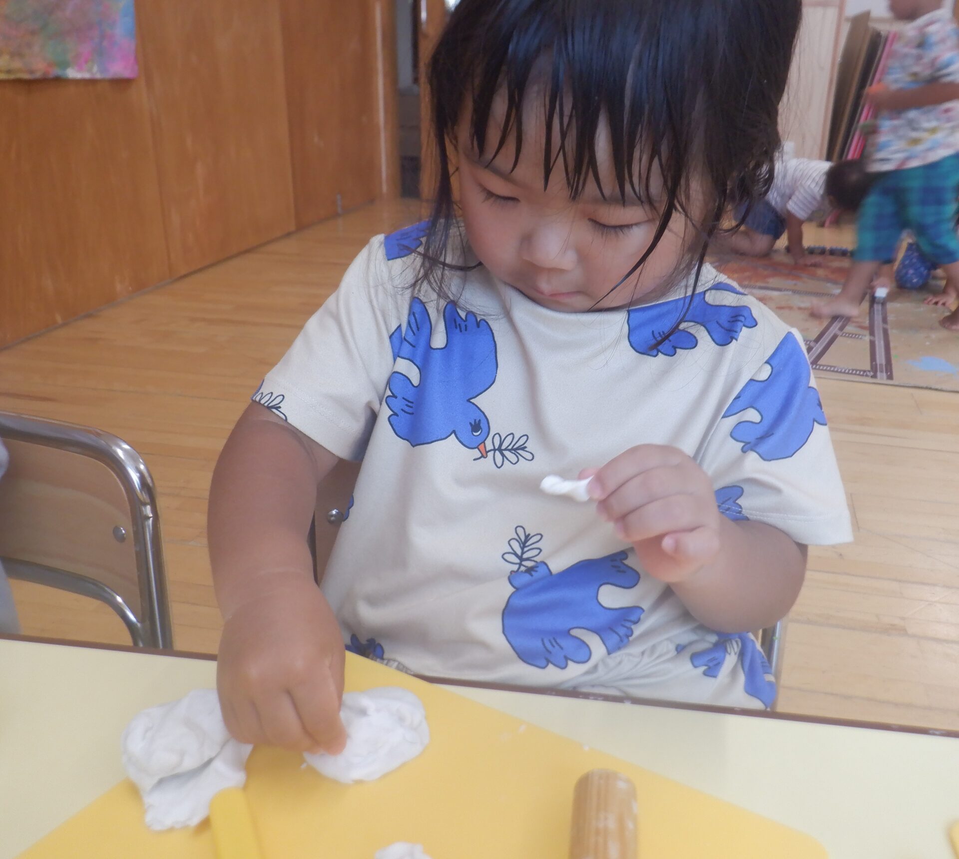 粘土を丸めたり、小さくちぎったものを飾りつけしたり、道具を使ってみたり・・・。