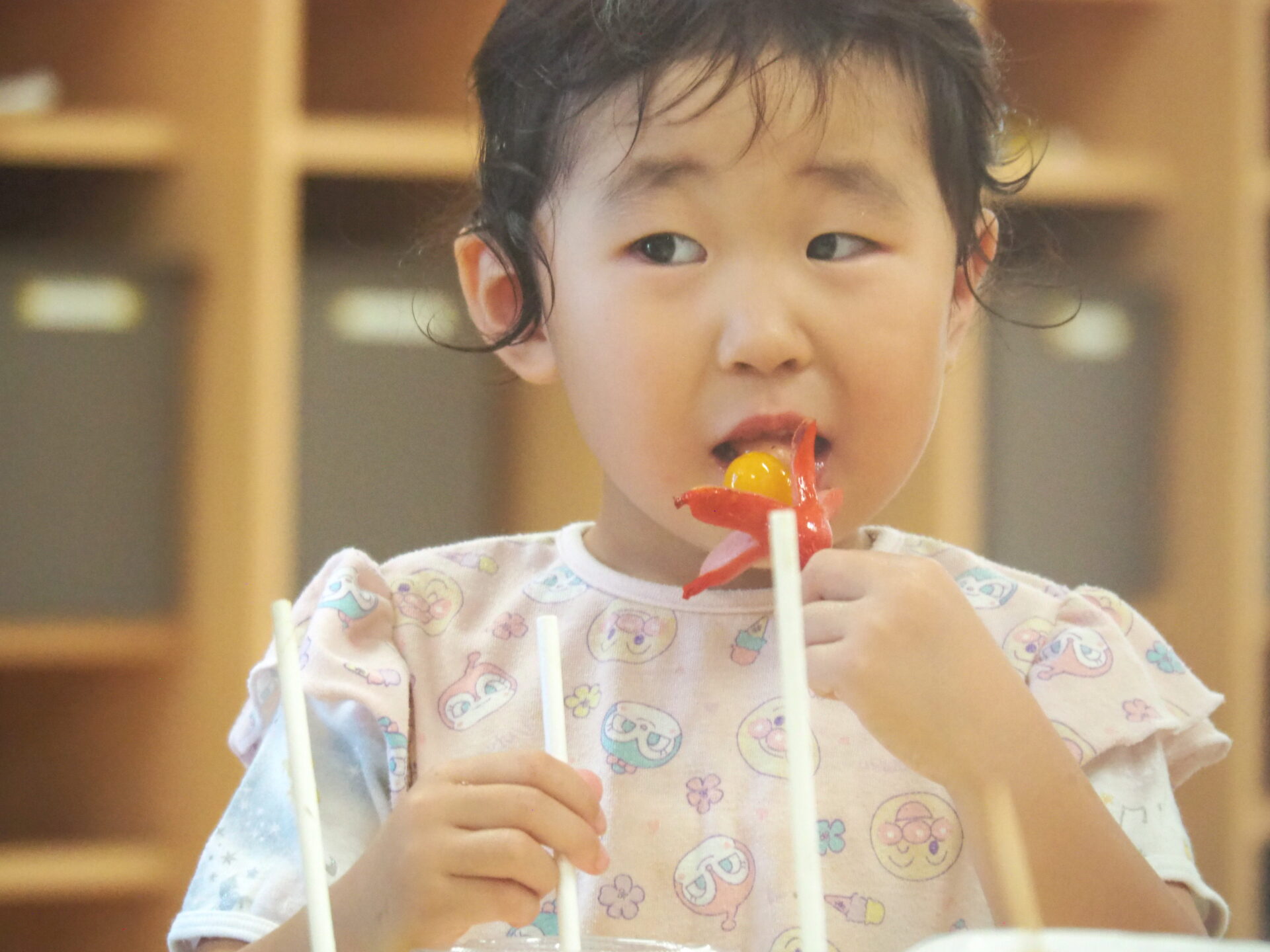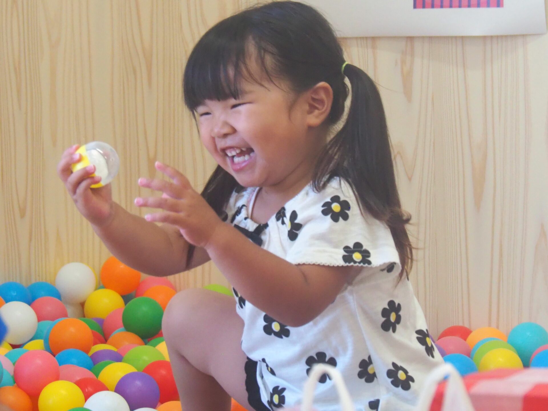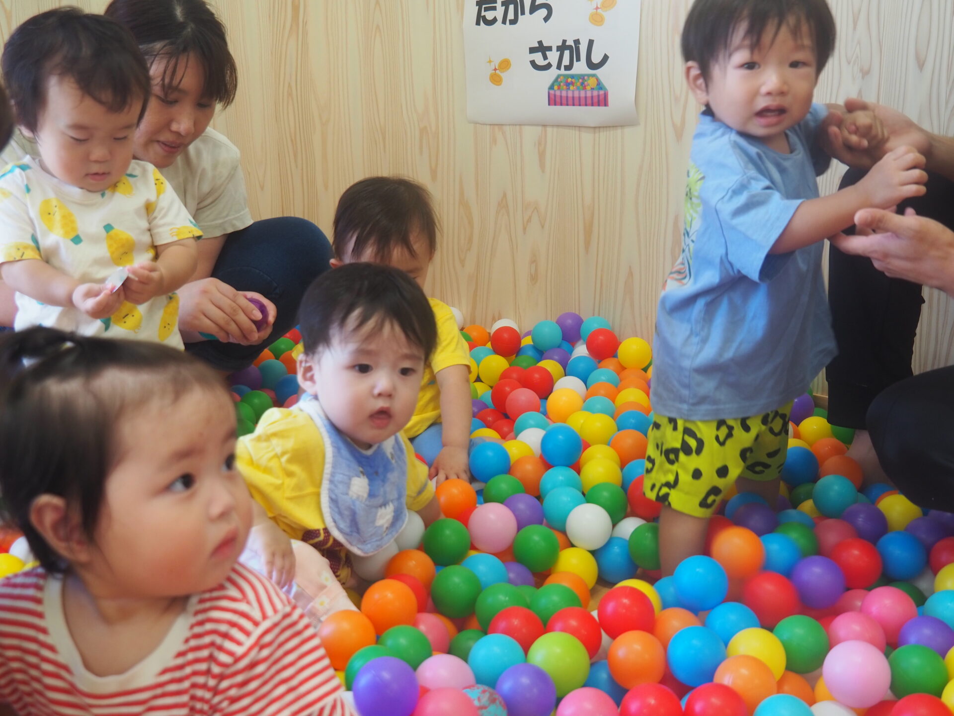 ①ボールプールで宝さがし(食べ物引換券が入っているよ!)