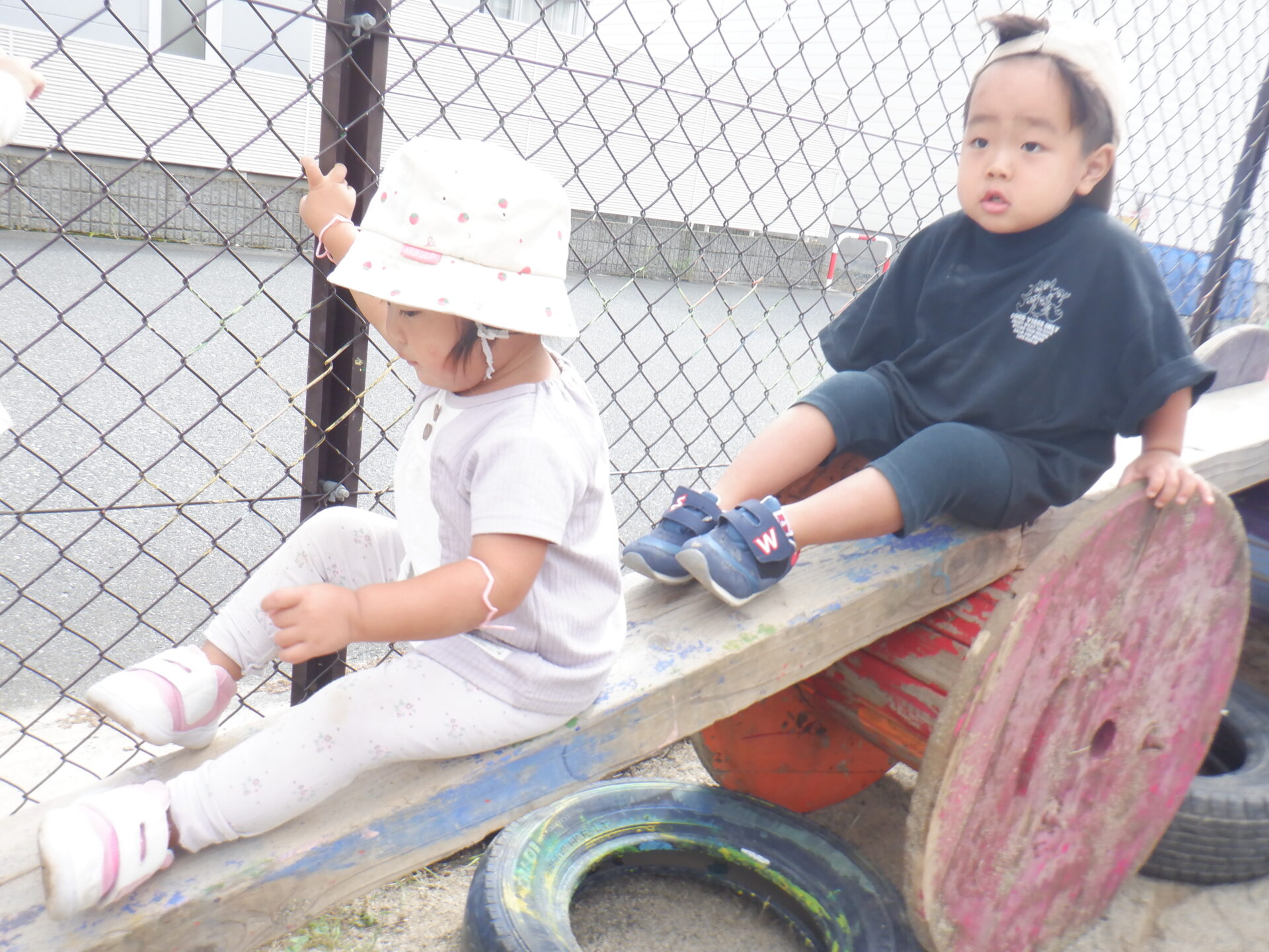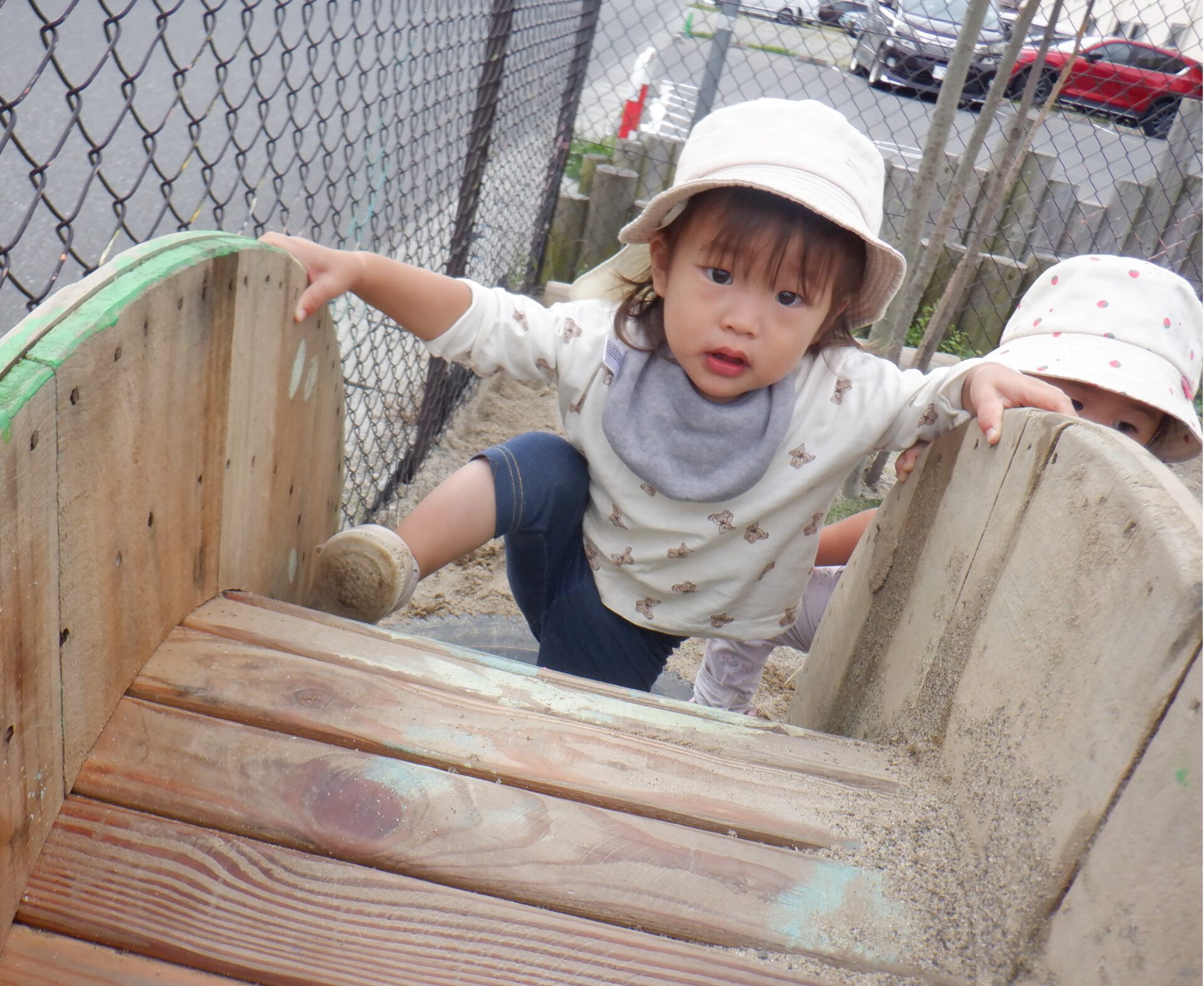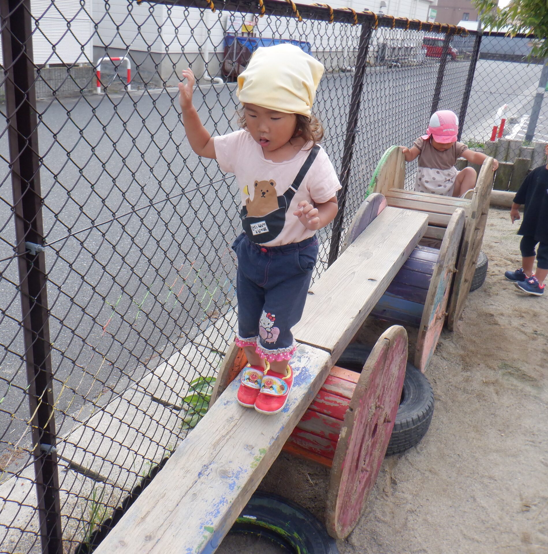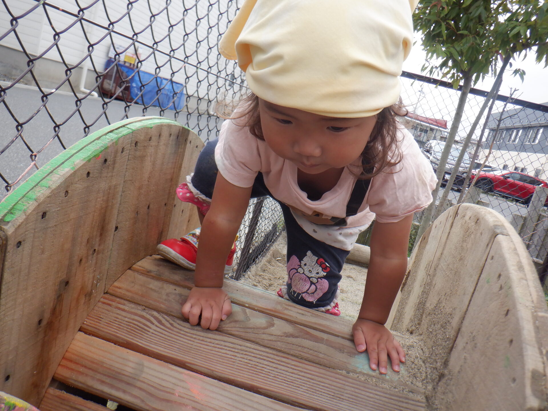 斜面はバランスを取りながら歩いて渡ってみたり、お尻で滑って渡ったり、様々な渡り方を楽しんでいます。