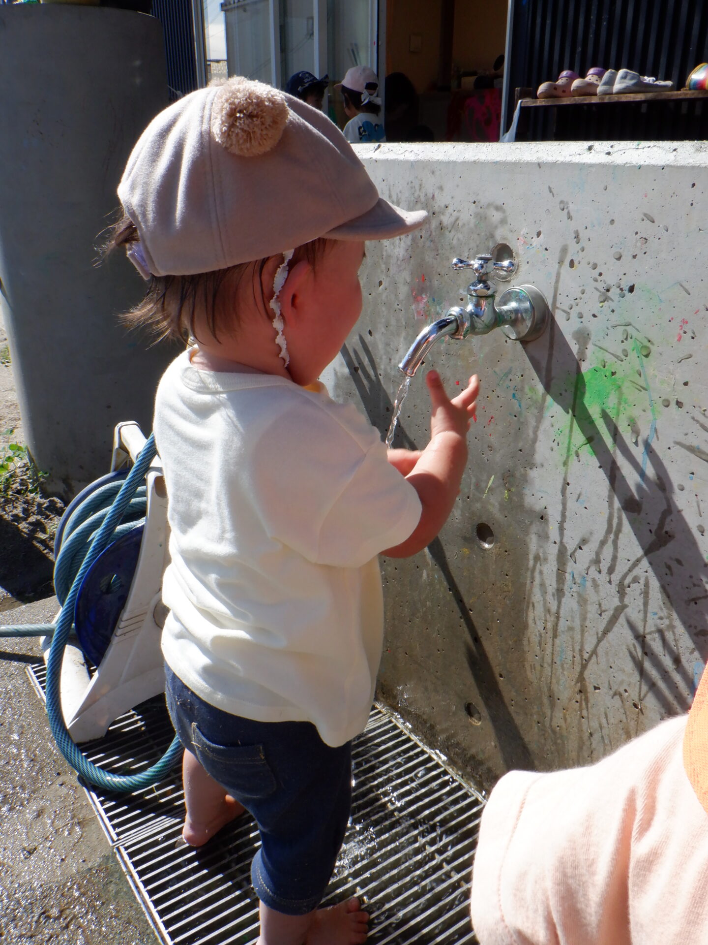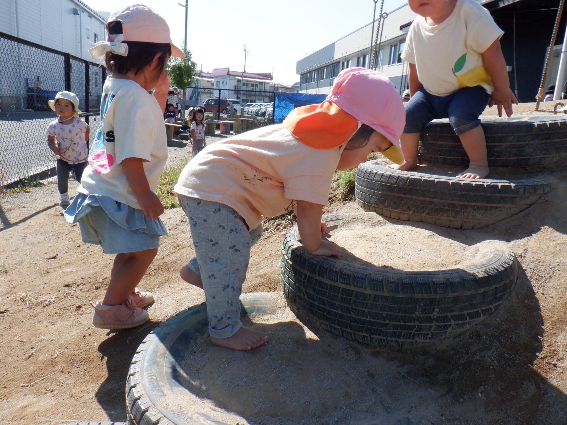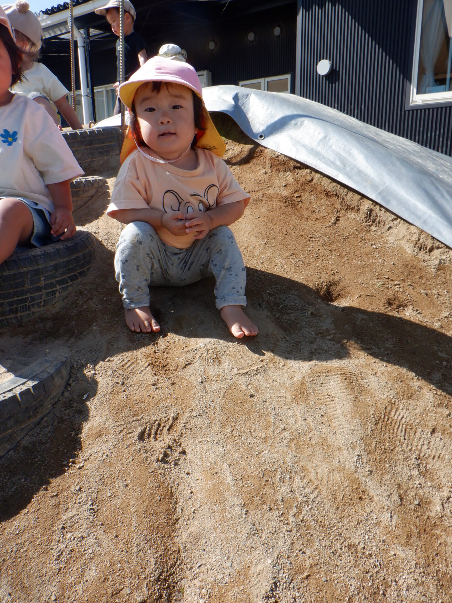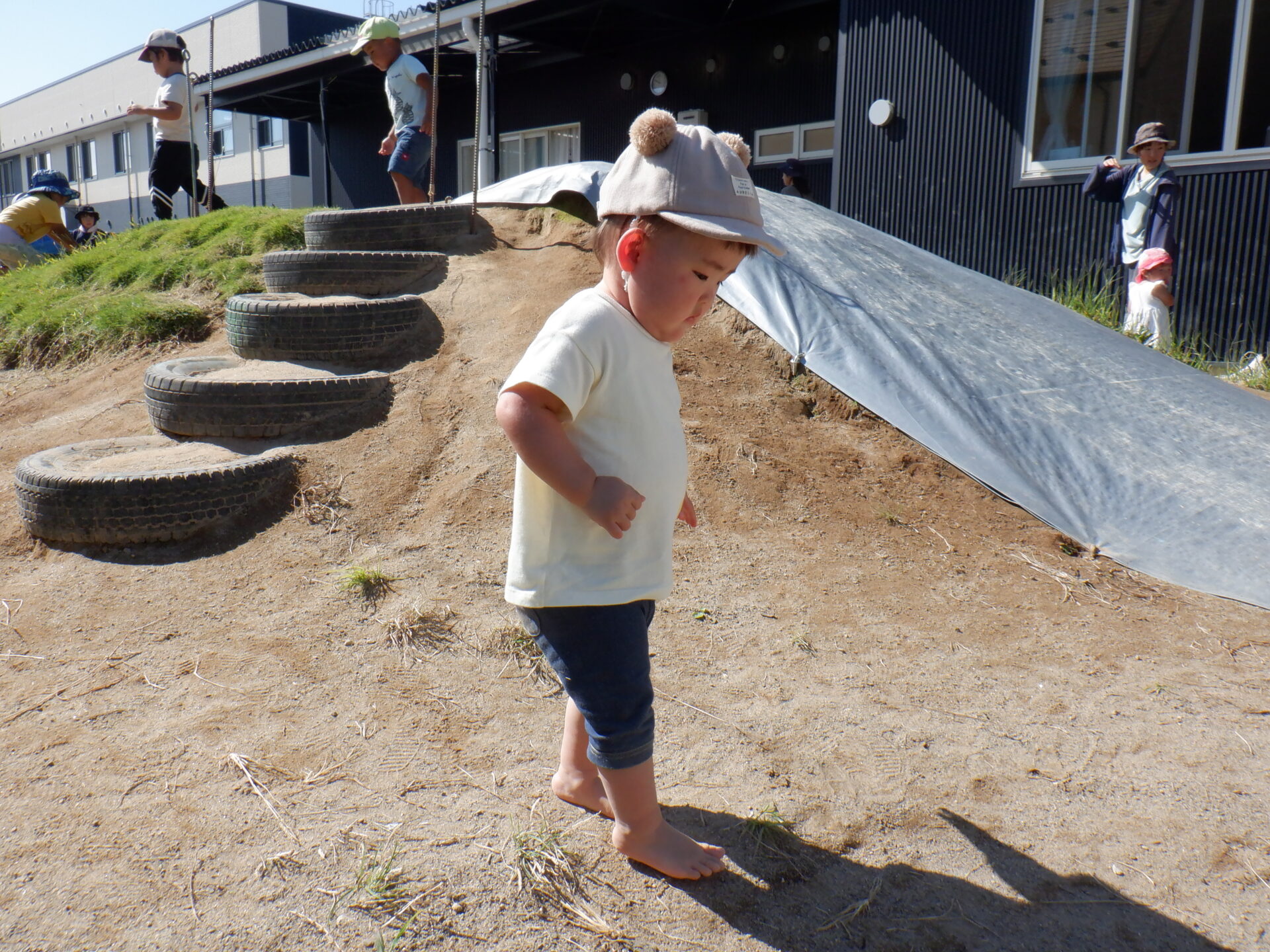 園庭へ出ると、築山に登ってみたり、歩いて園庭散策をしてみたりと、それぞれ好きな遊びを楽しんでいます!