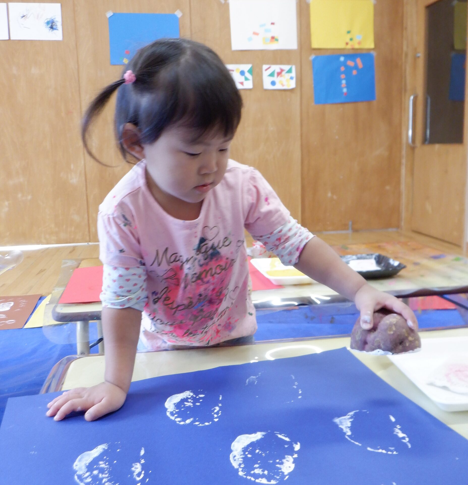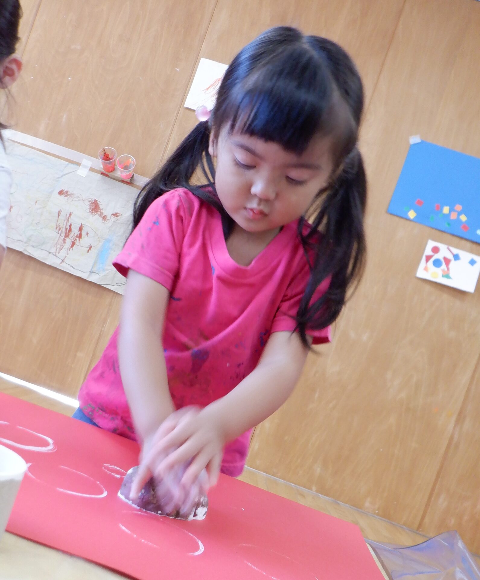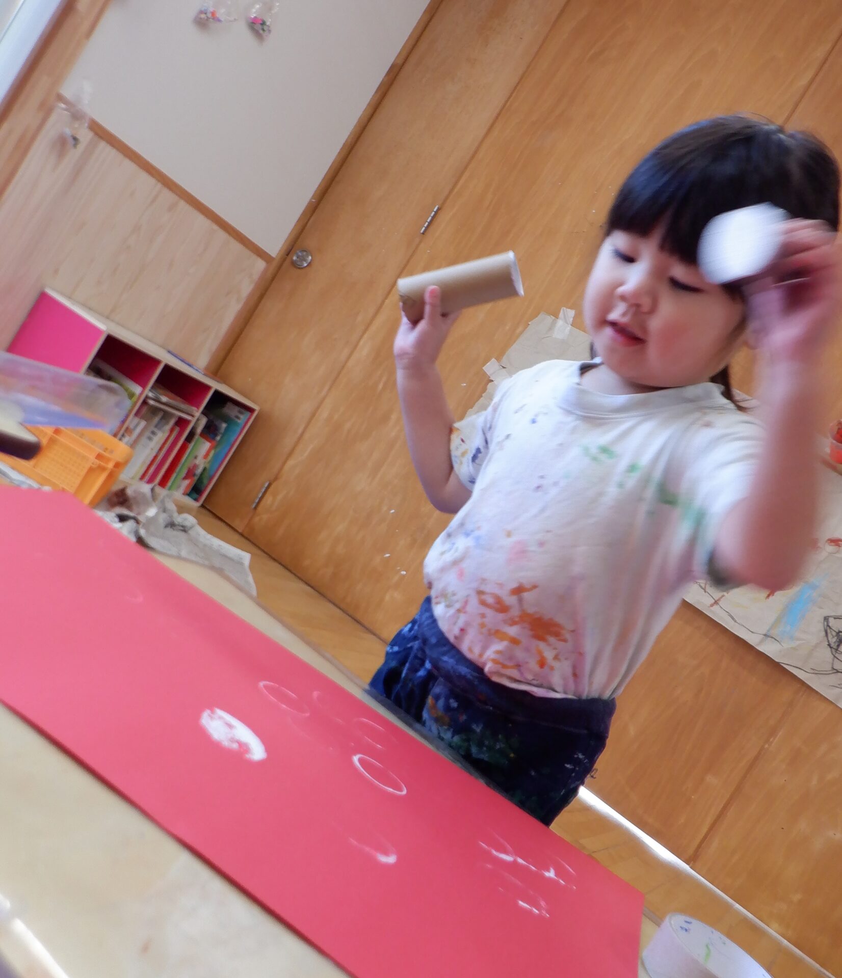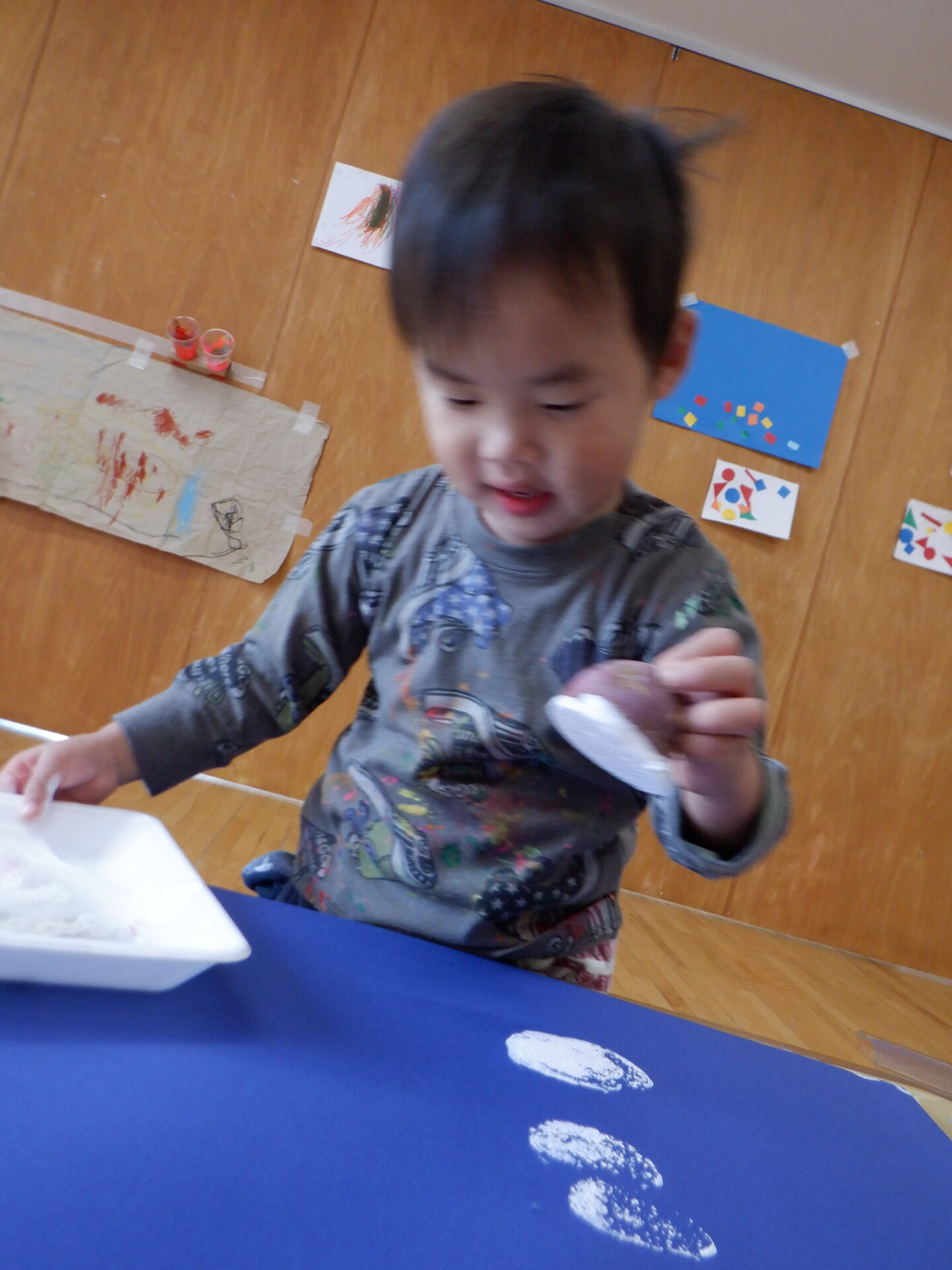 絵の具を付けて、画用紙にギュッと押し付けてみたり・・・。
