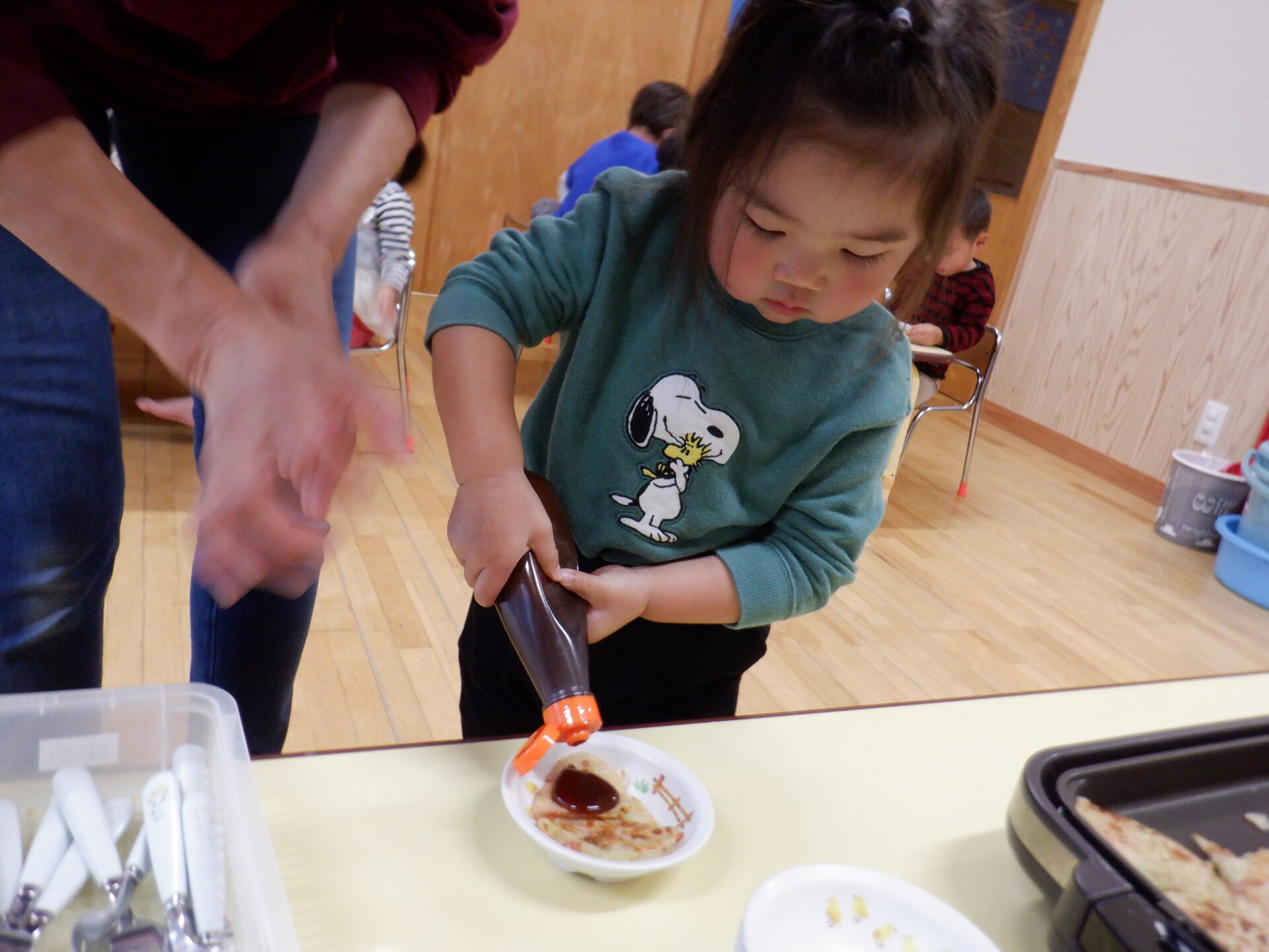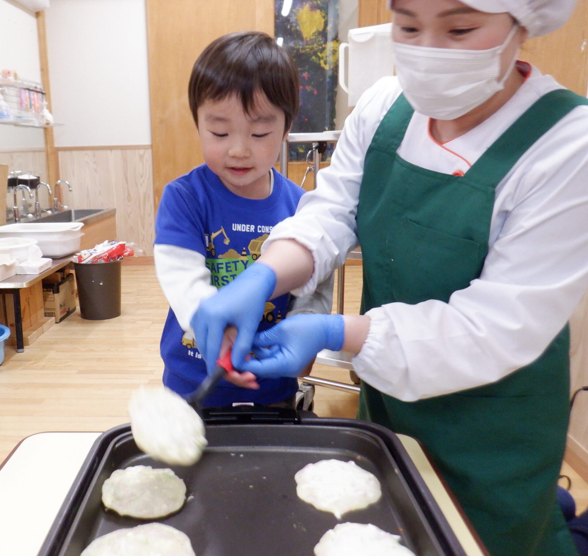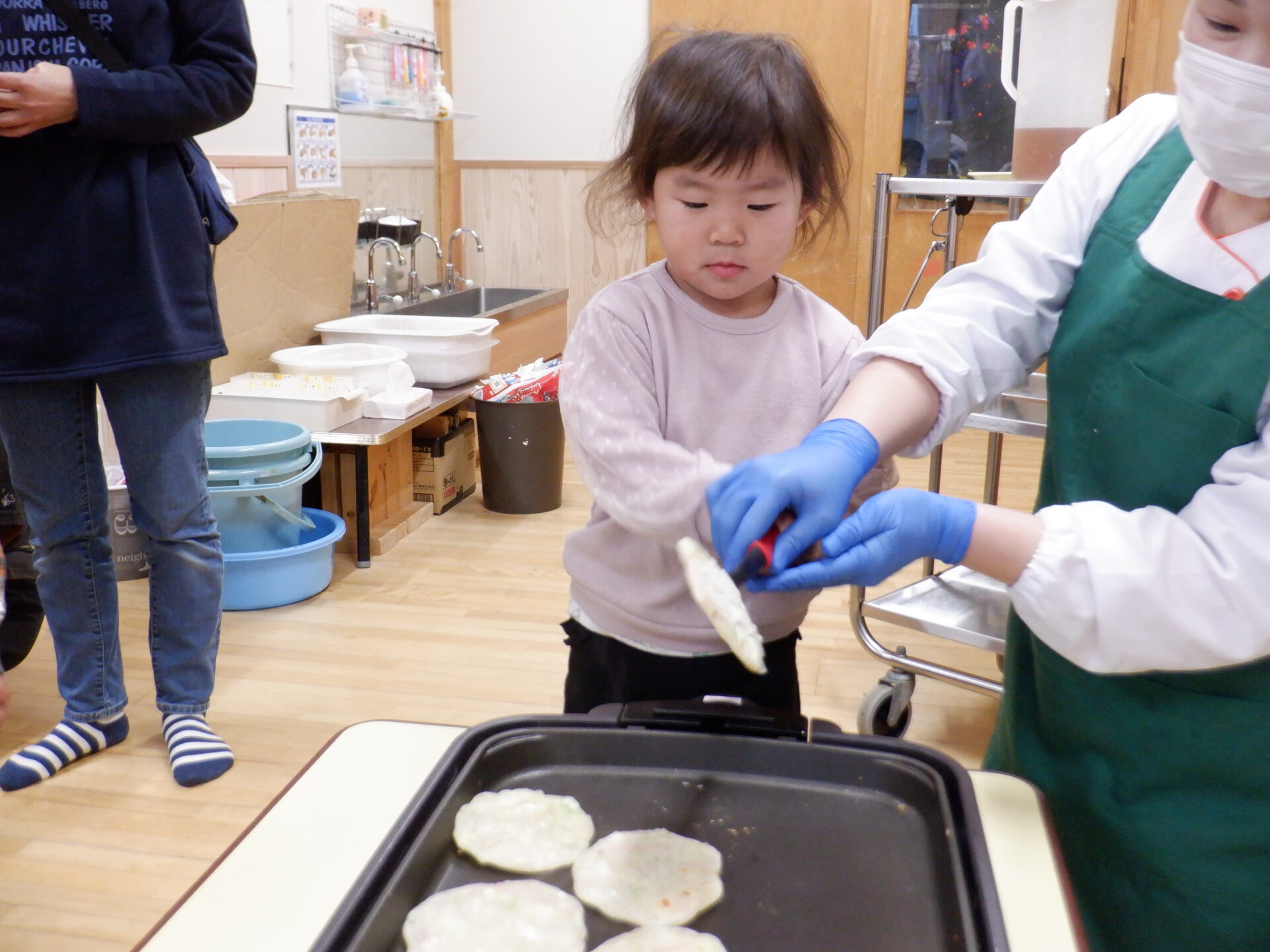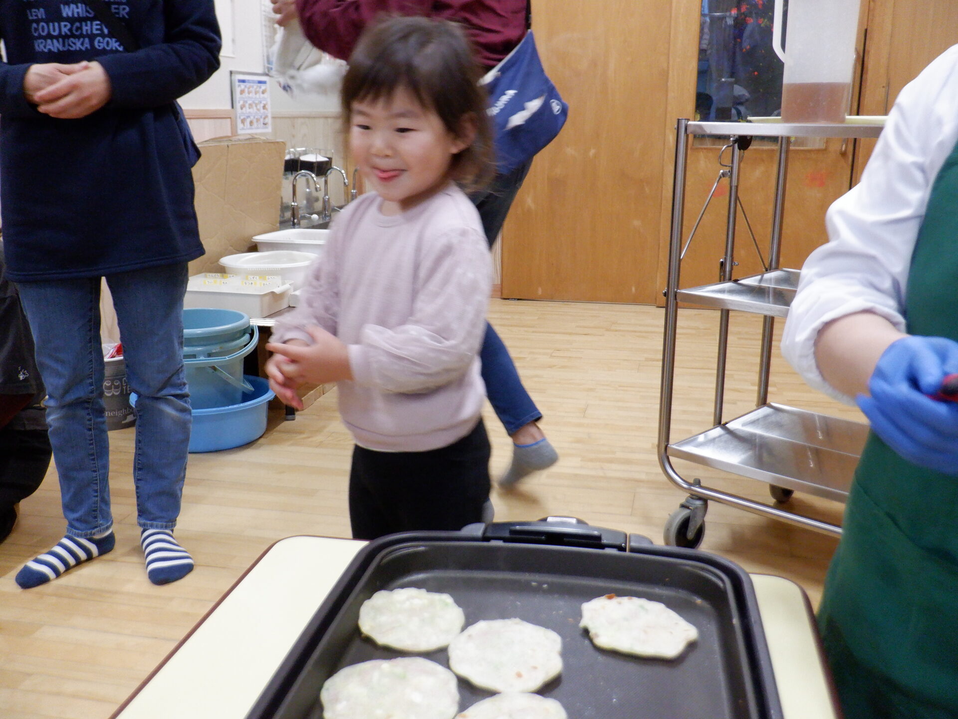 1枚ペロリと食べた後はおかわりを焼くのをお手伝いしました。