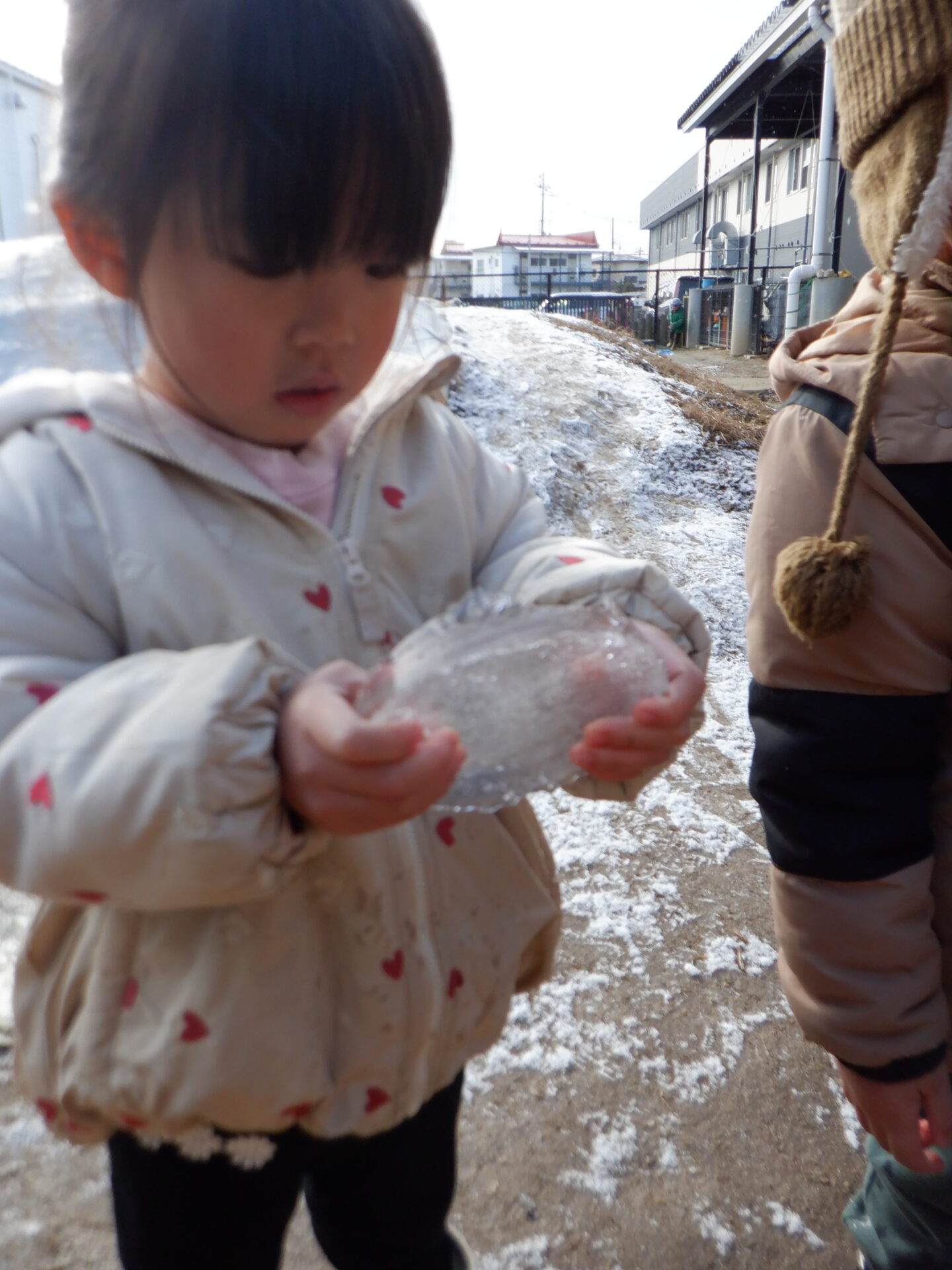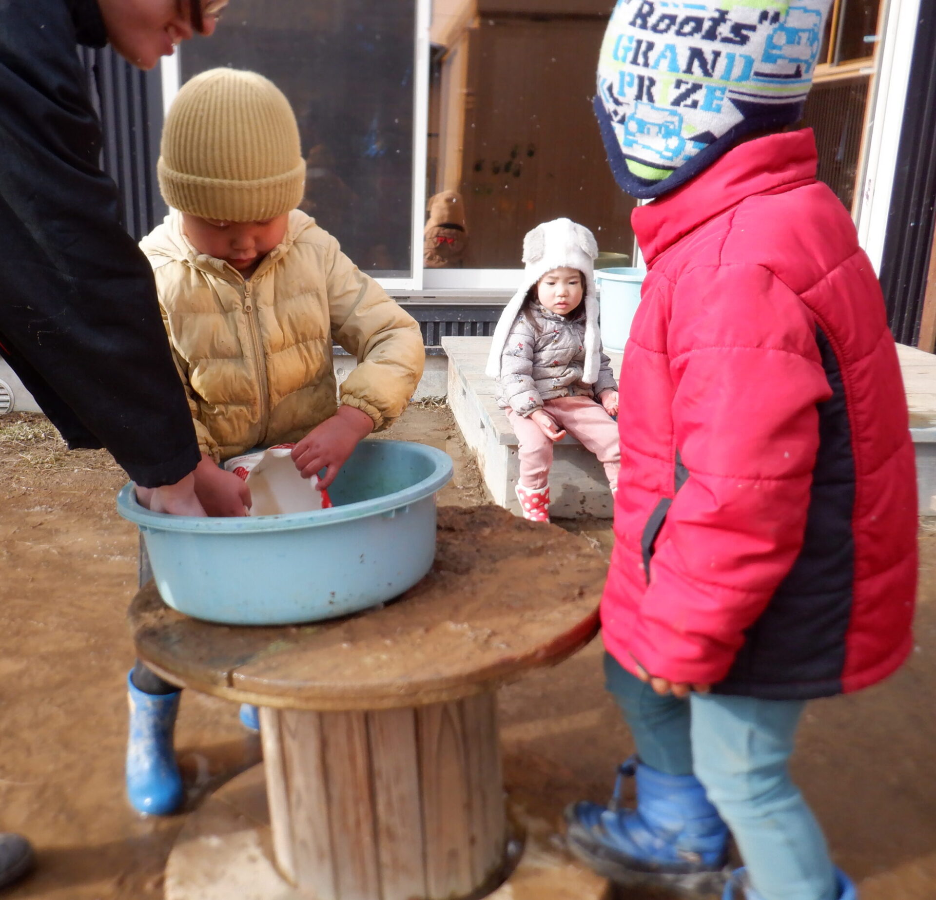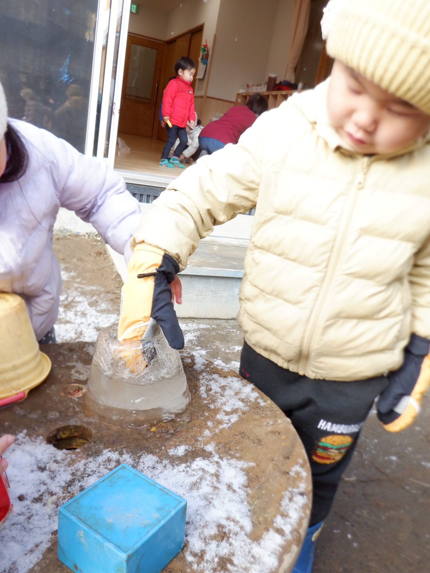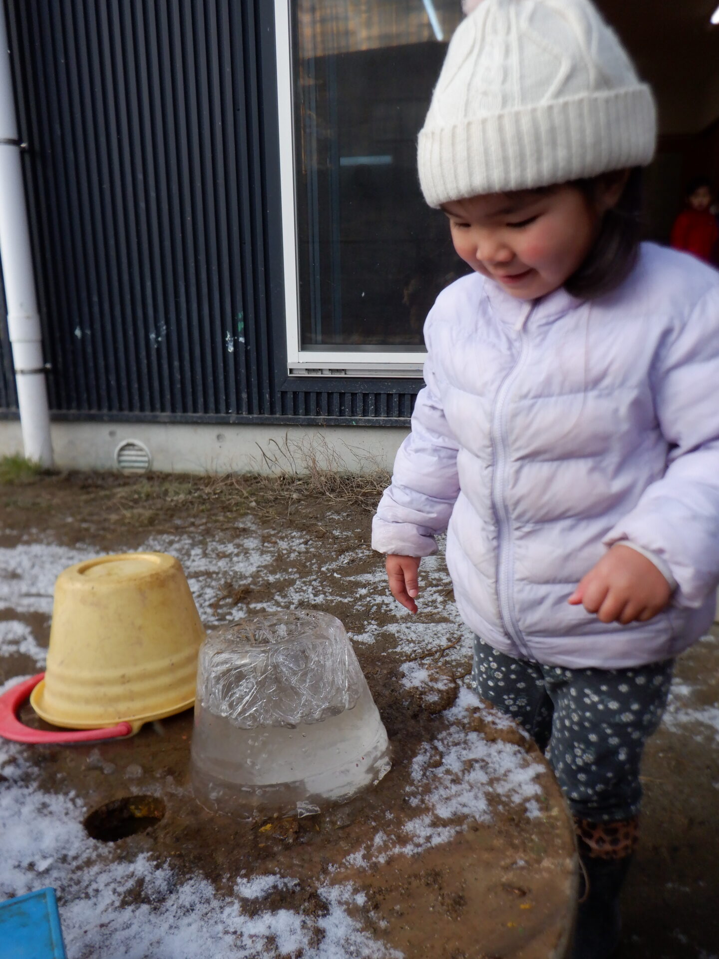 水を入れた容器を外に置くとどうなるか、実験をしていましたが何も変わらず…。