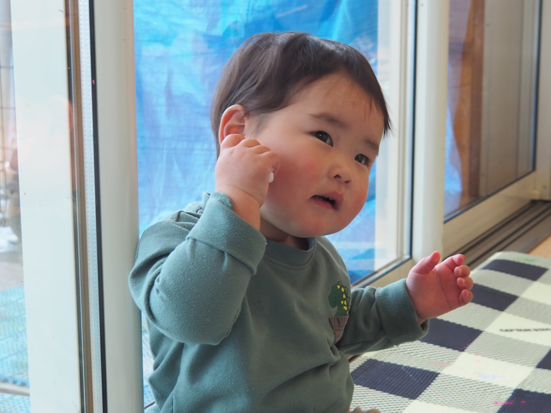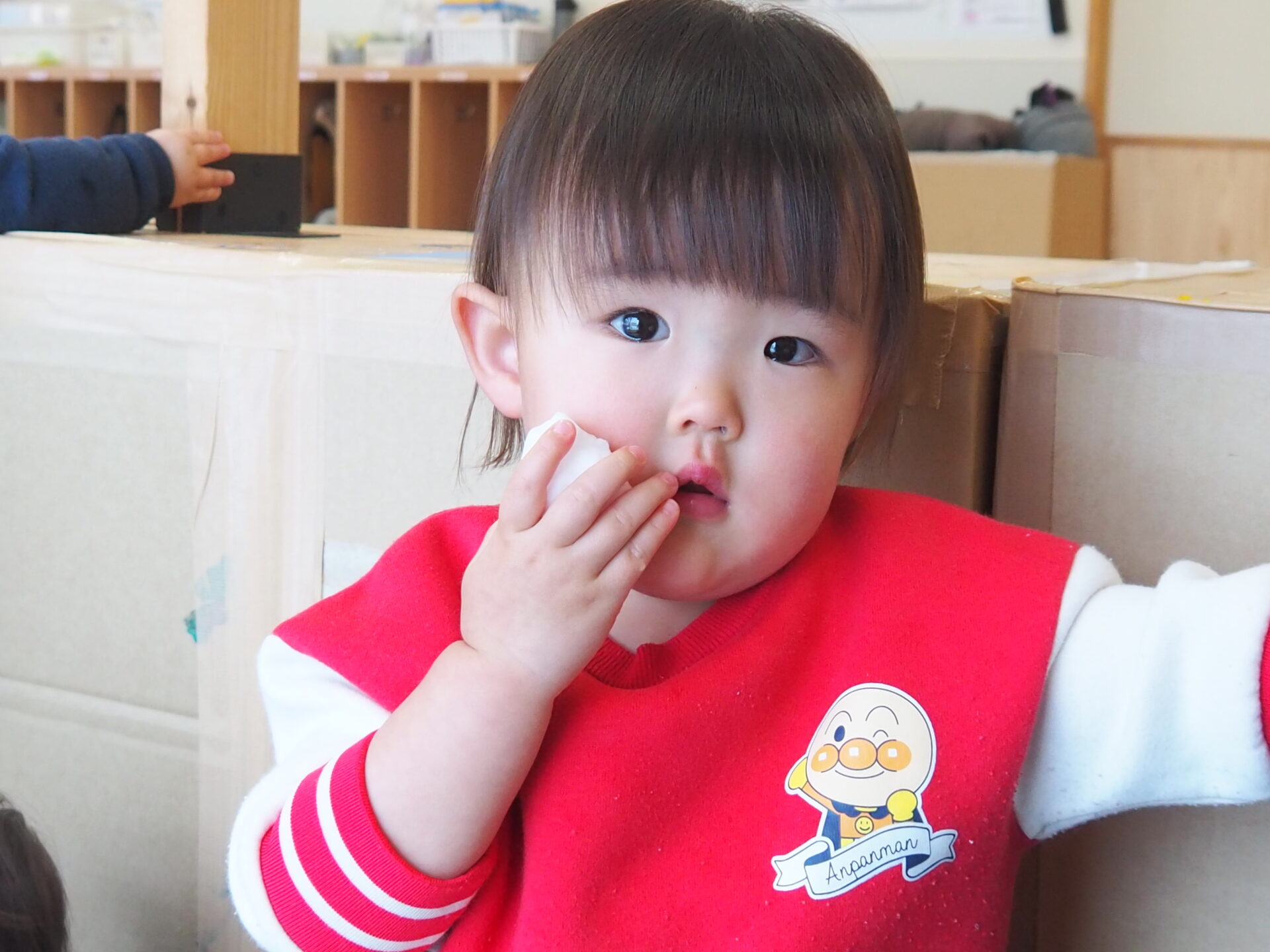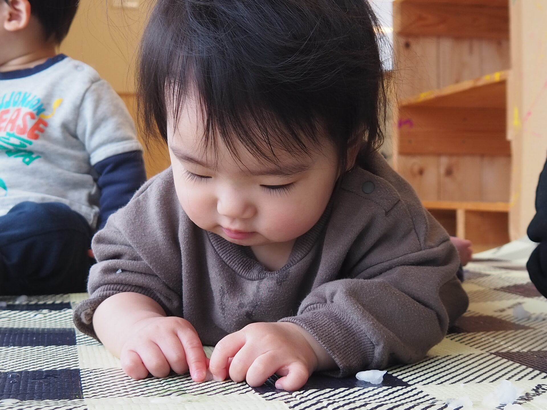 お部屋の中で”雪遊び”をしているのは、あい組さん(0歳児)。