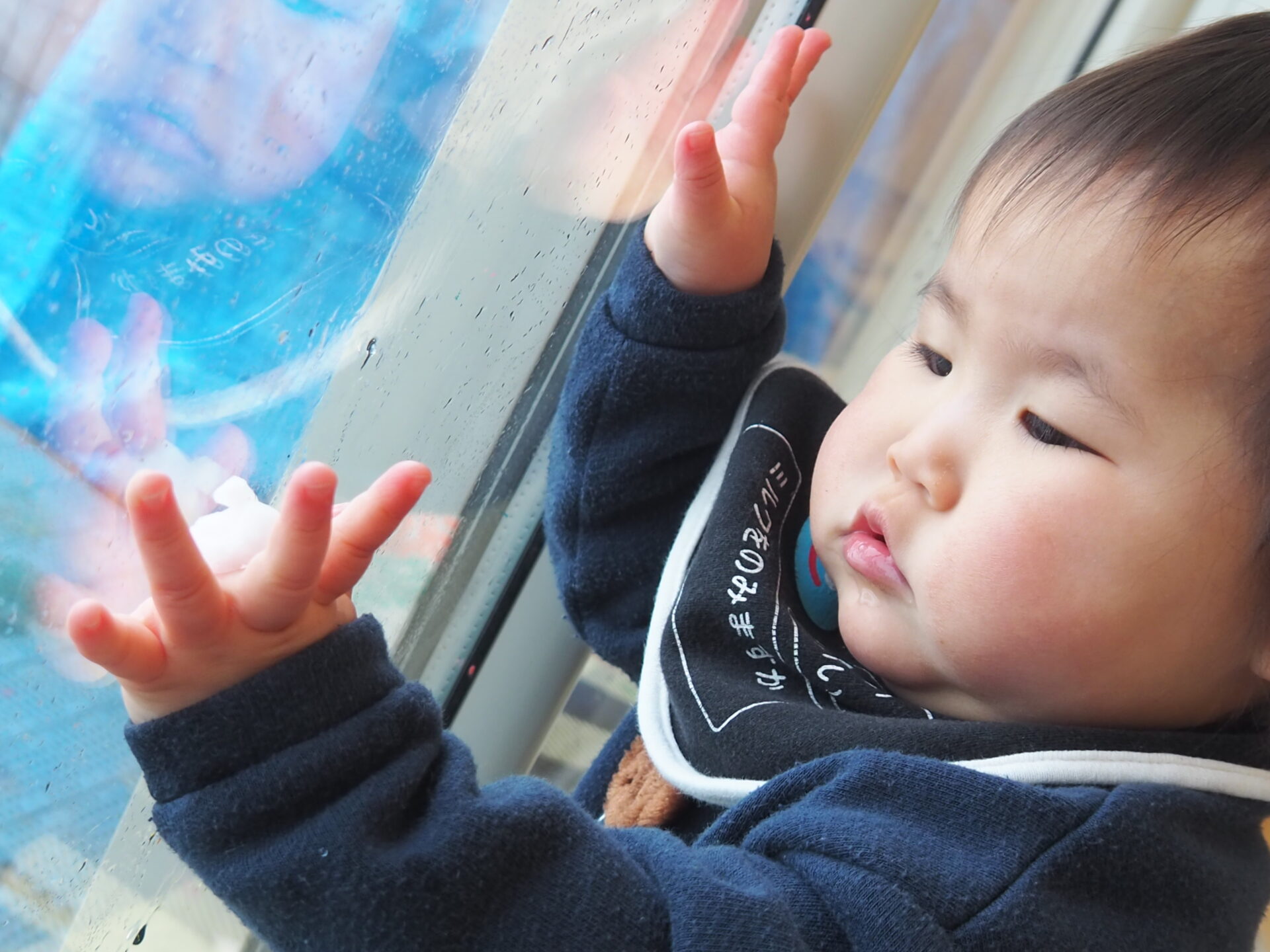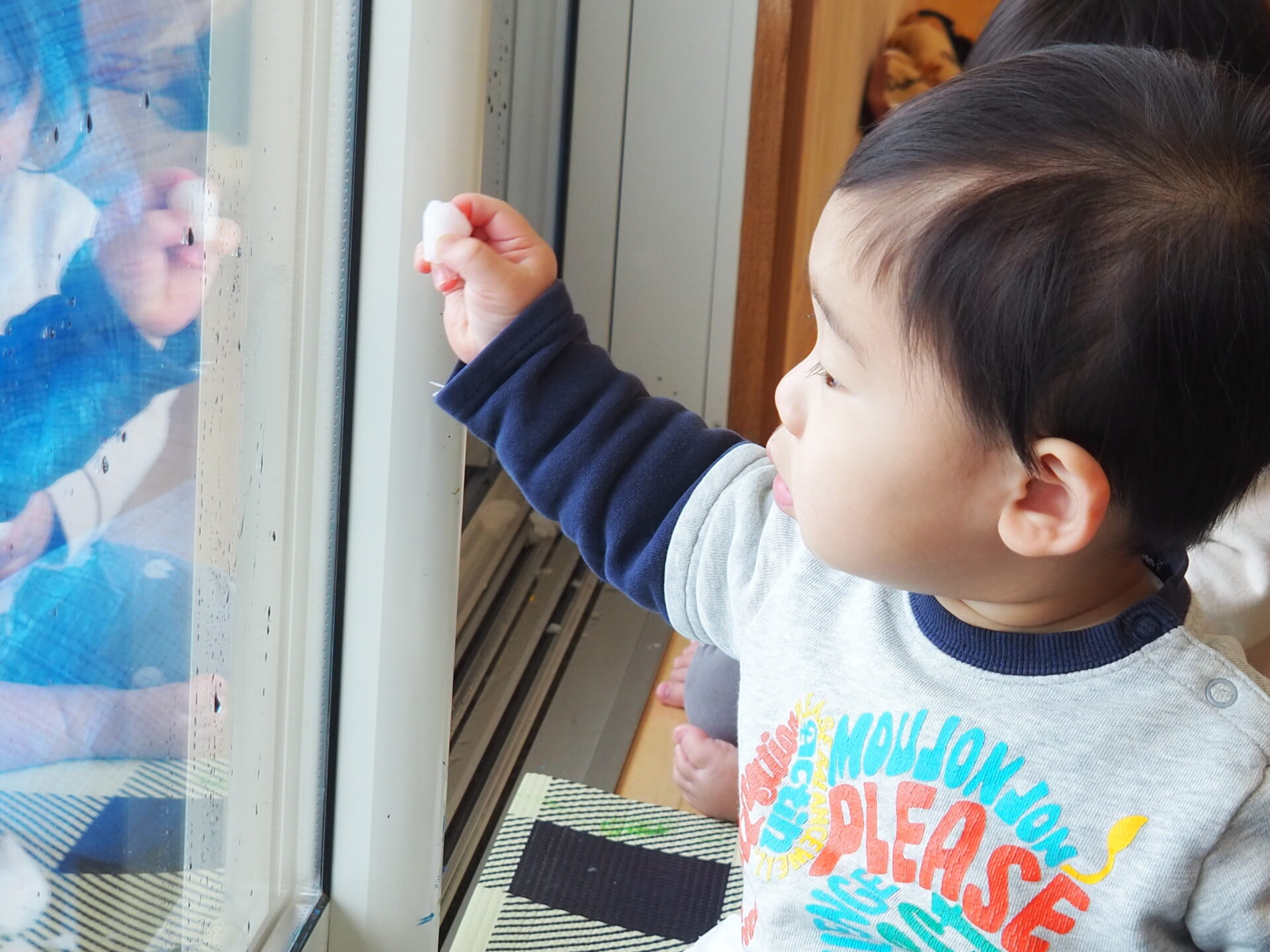 窓に付いた雪が溶けて、ツーっと落ちてくる様子に夢中な子。
