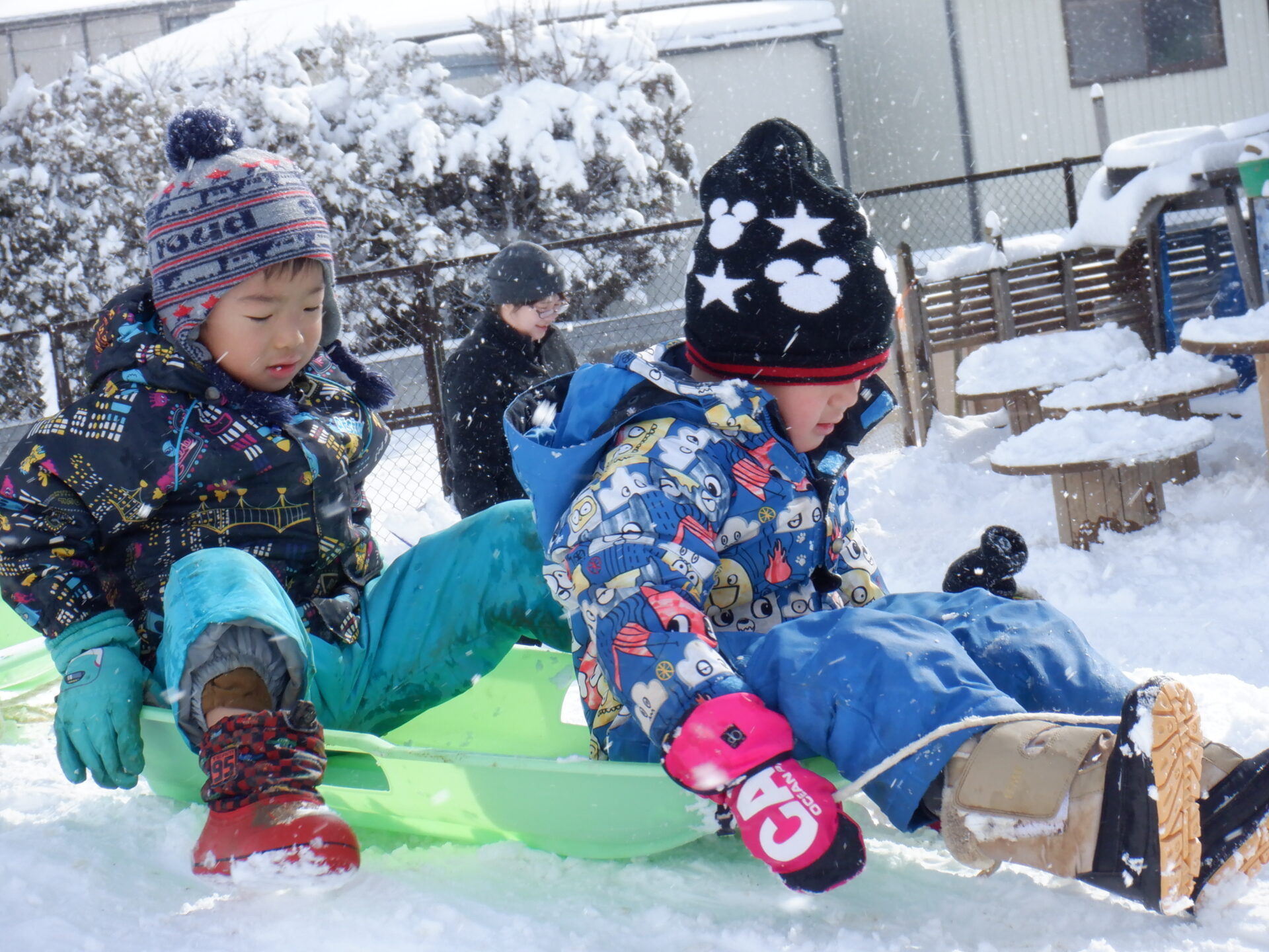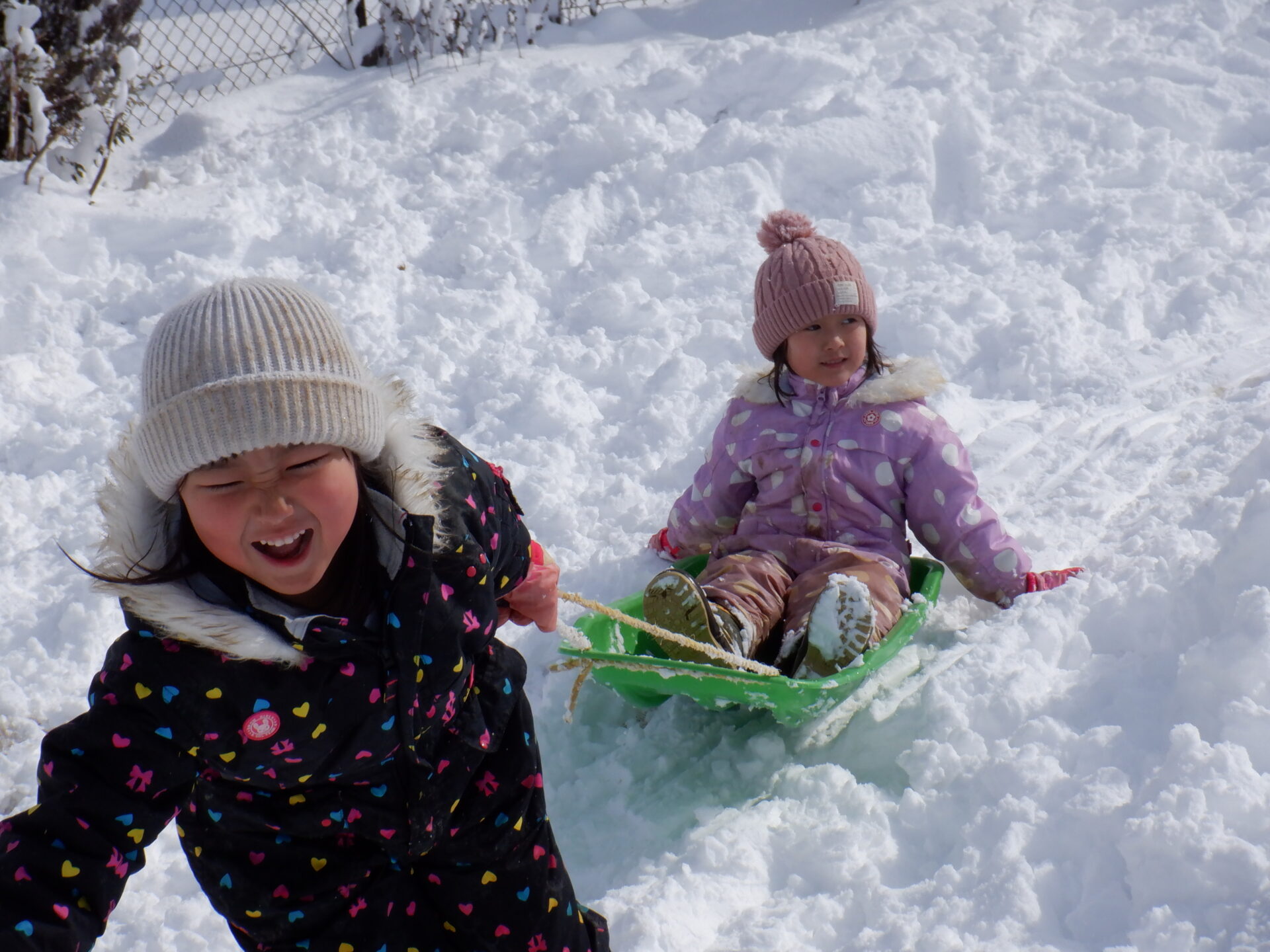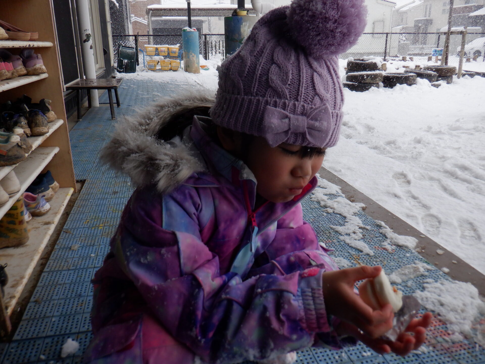 おやつに雪が入ってしまうので、仕方なくテラスで食べました。