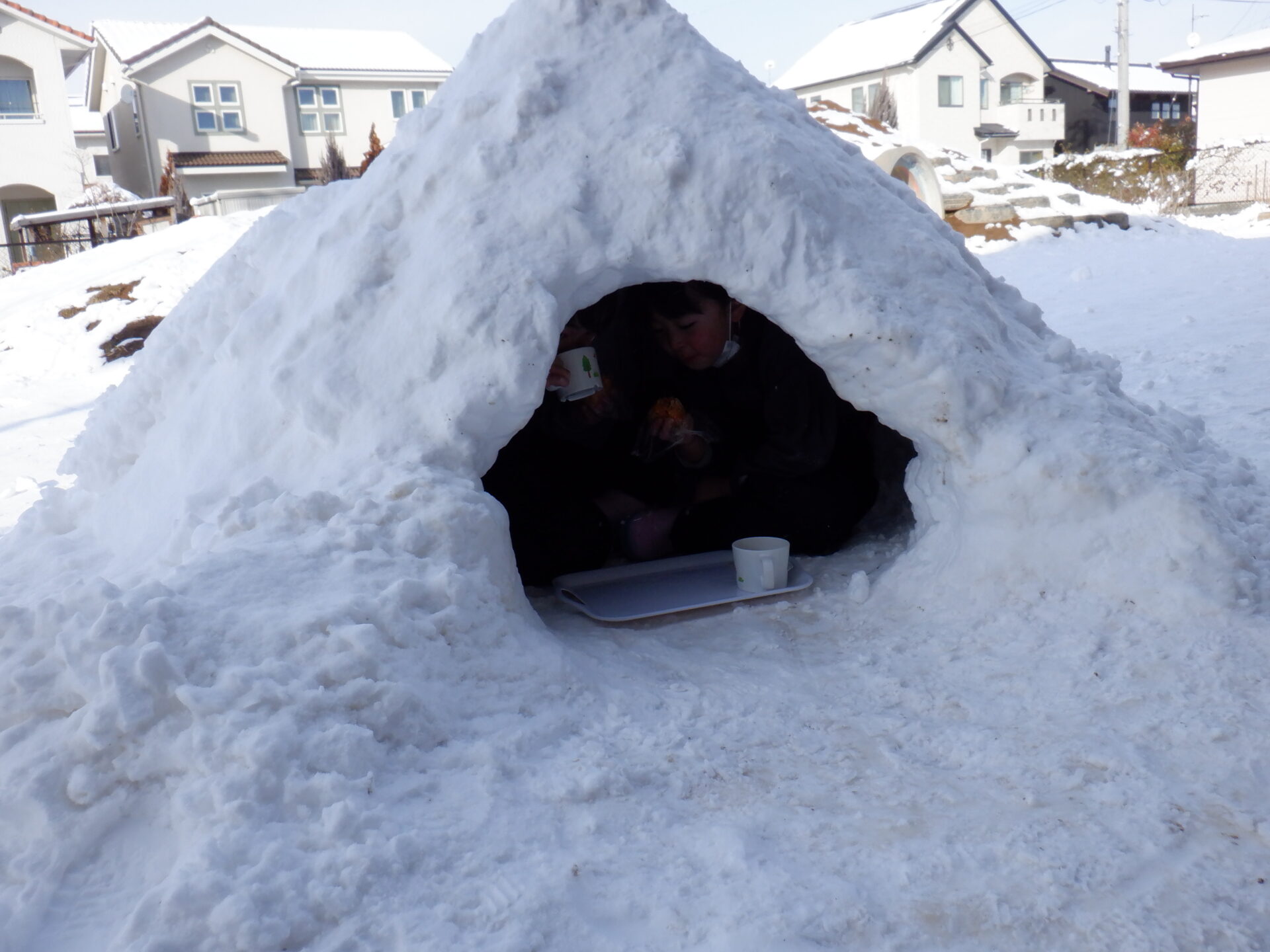 頑張って一から作ったかまくらでおやつを食べようとしたら、