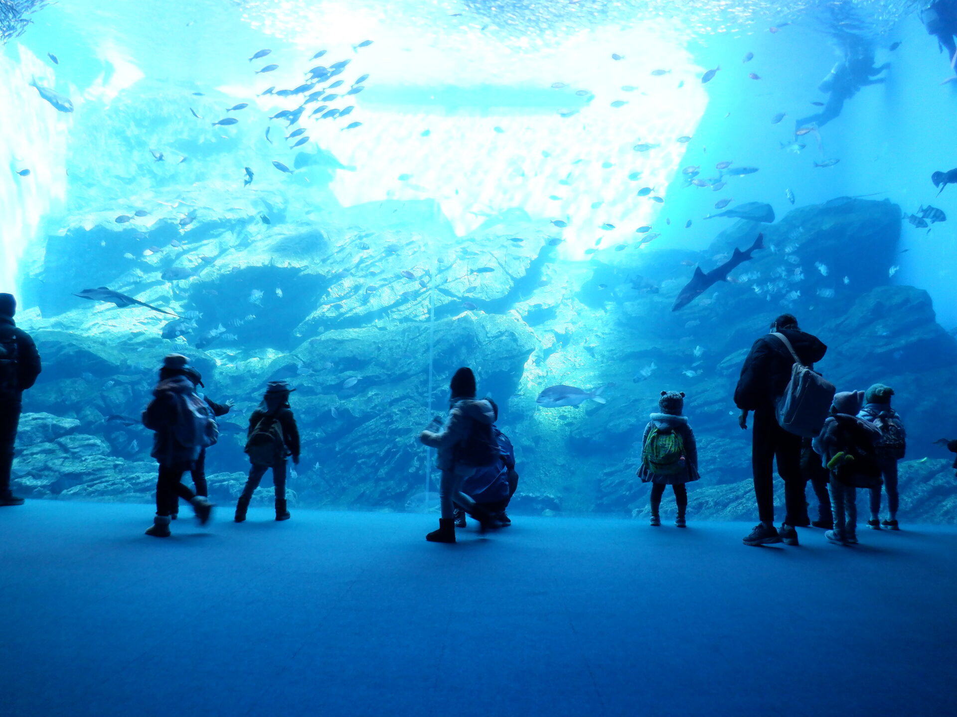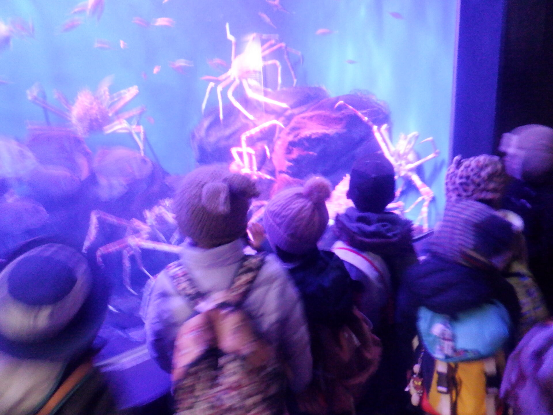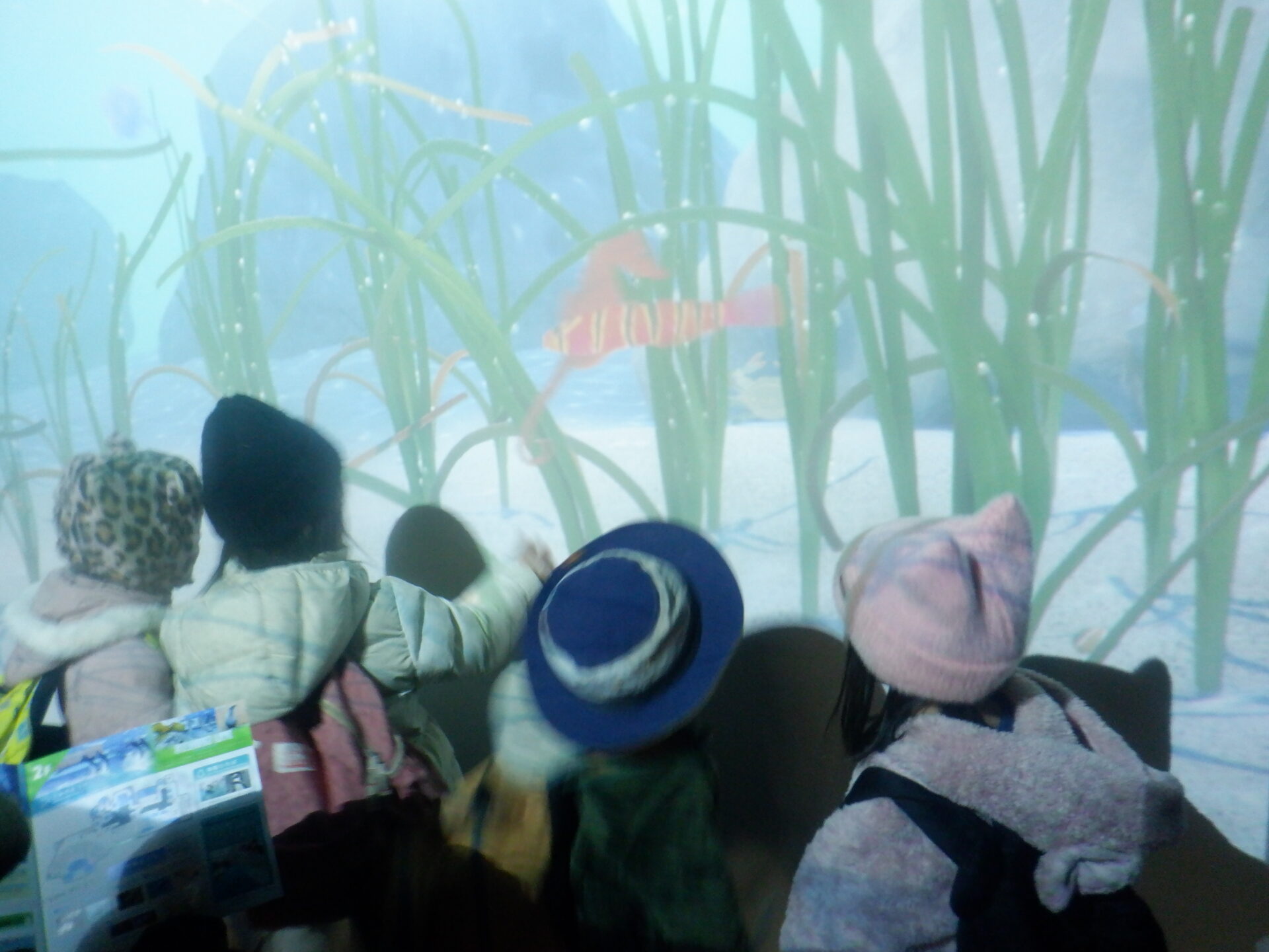 大きな水槽にいる様々な生き物に大興奮の様子…。