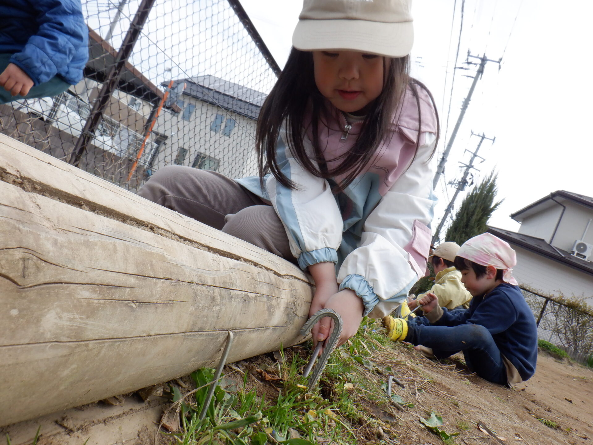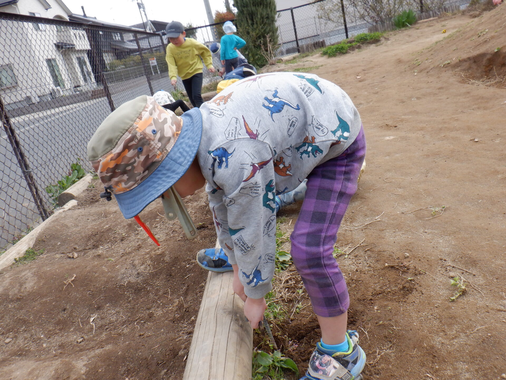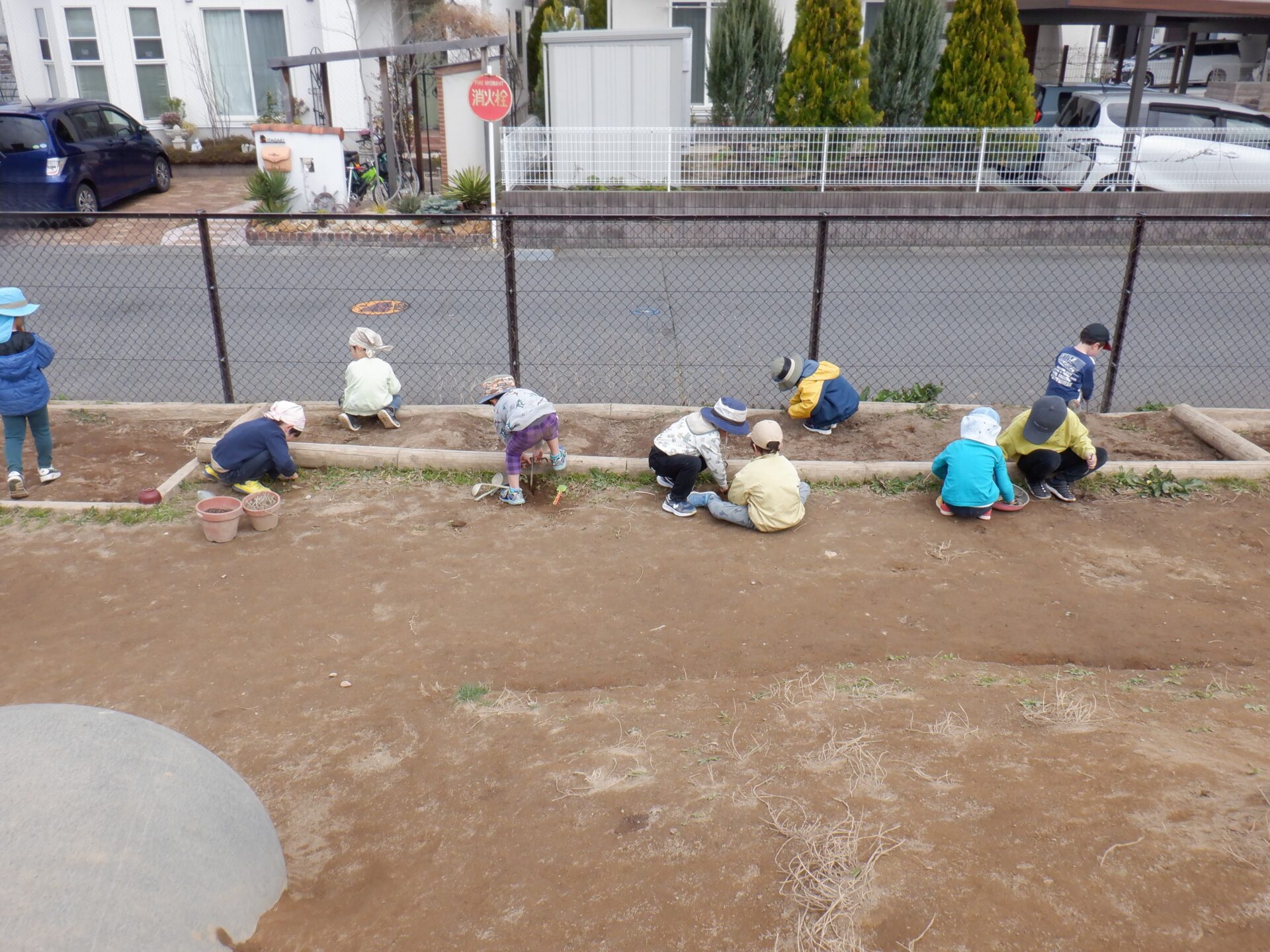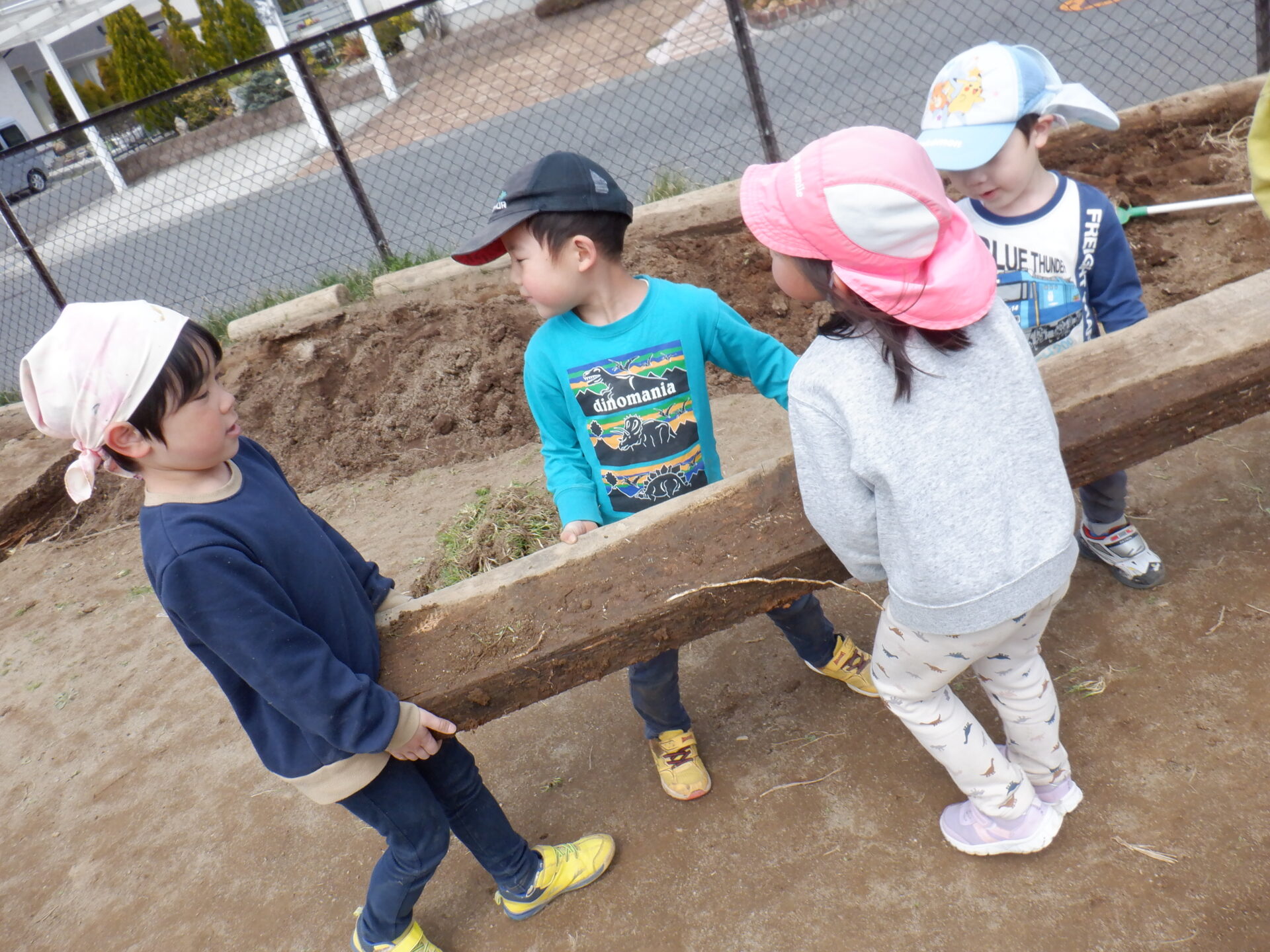 長年使用してきた以上児の畑の枠が、月日と共に壊れてきた為、畑の改造を実行中。