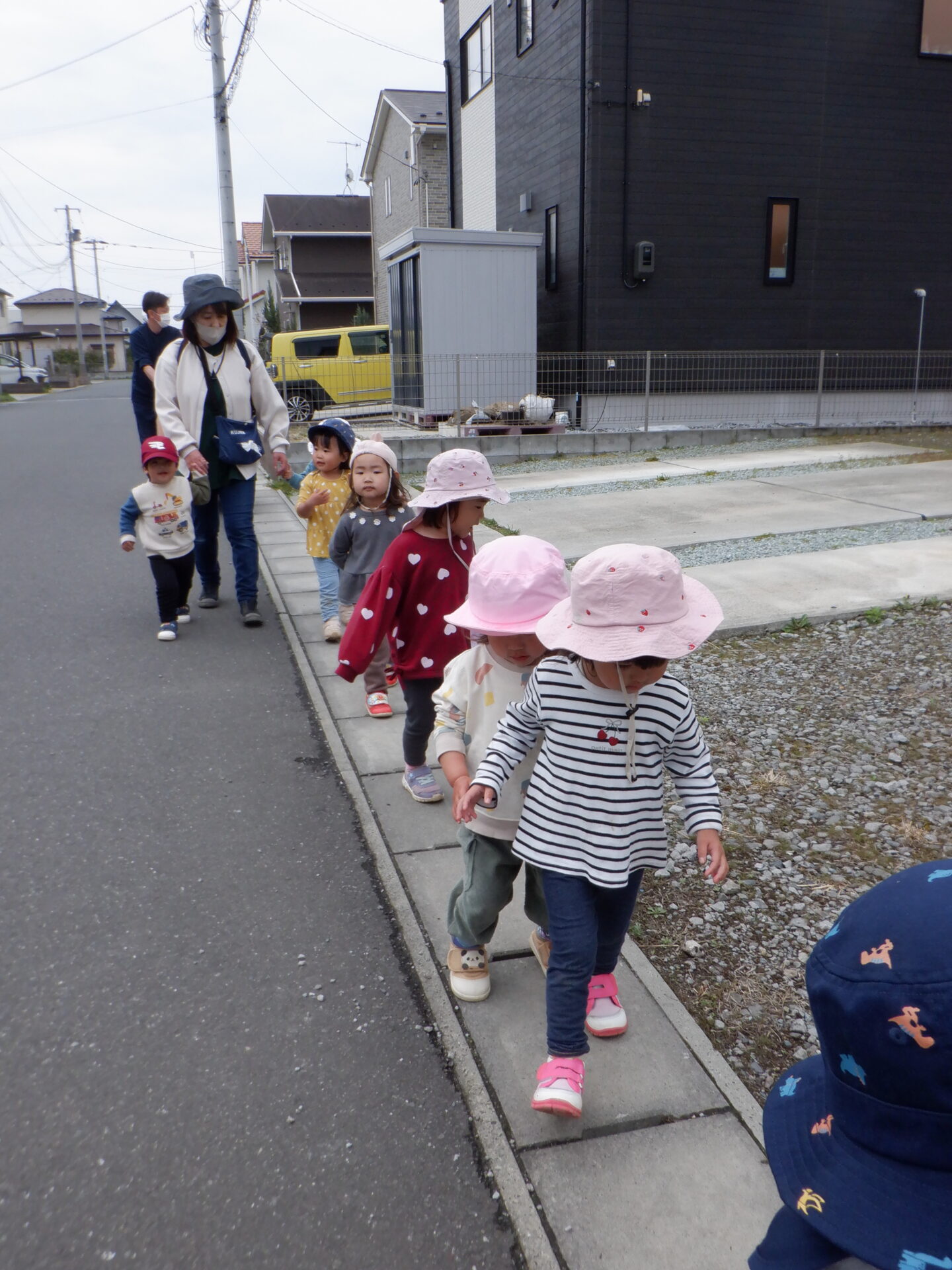 「桜咲いてるよー」と保育士の言葉に笑顔を見せてくれ目的地まで一生懸命歩く姿とても素敵でした。