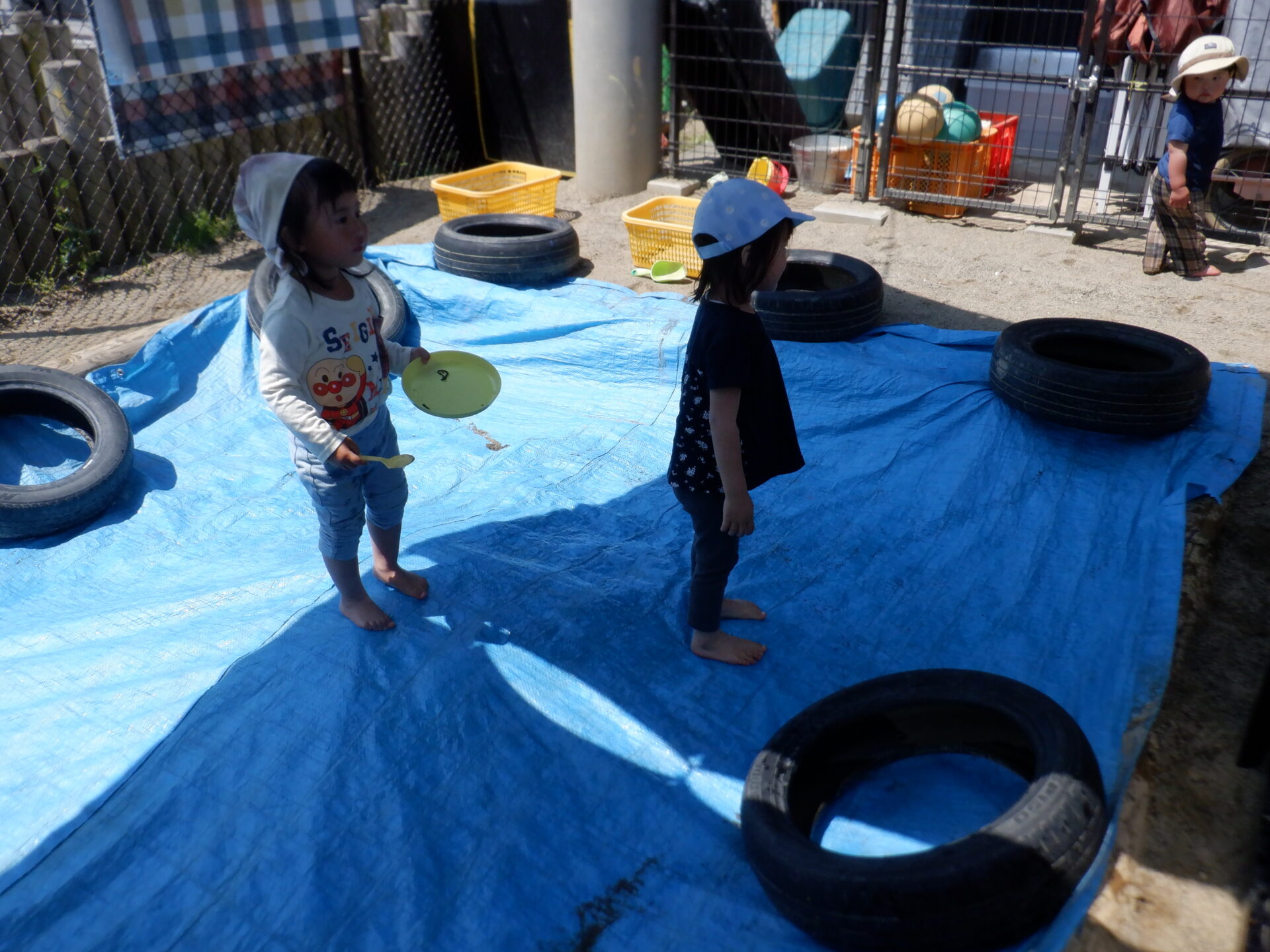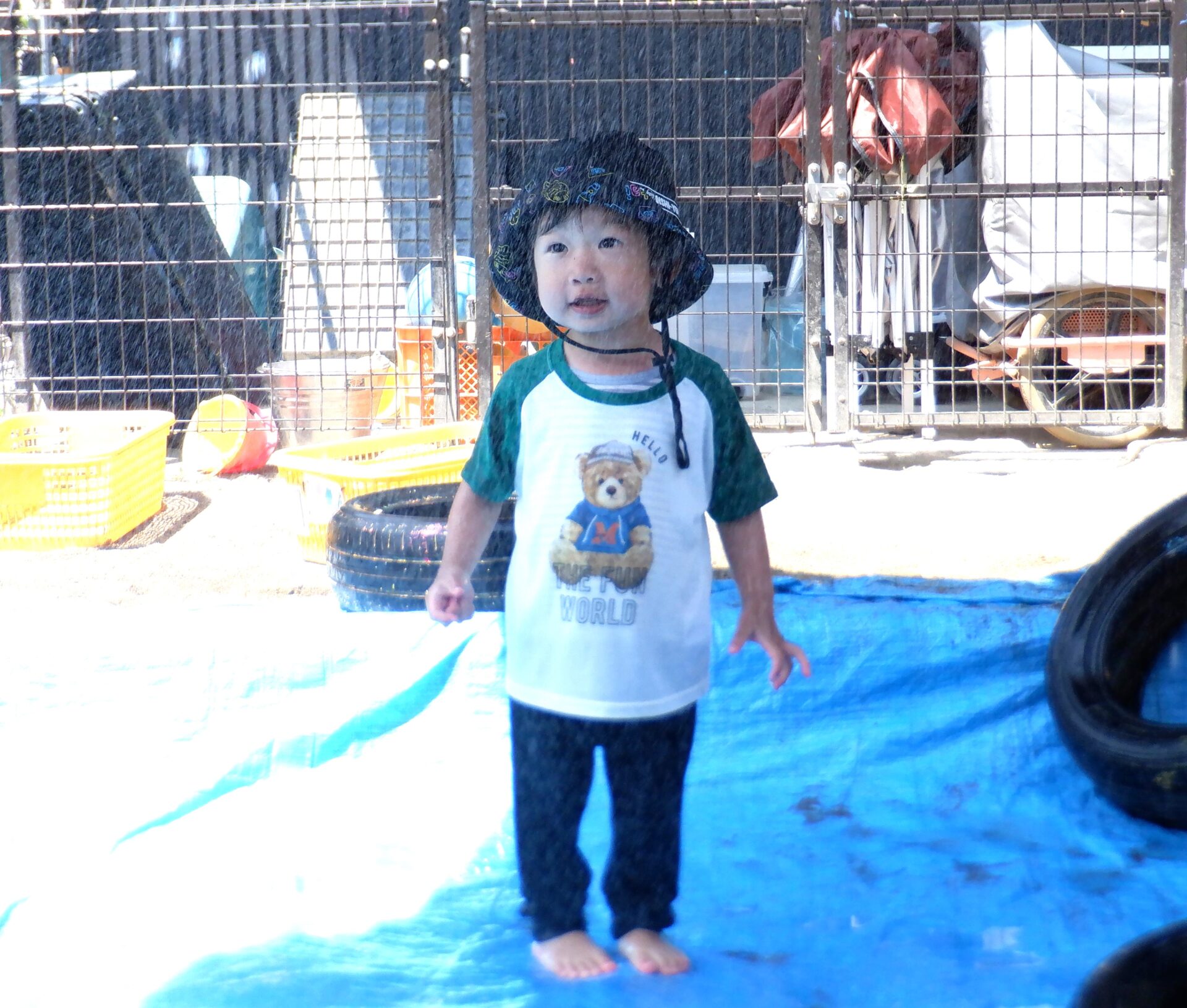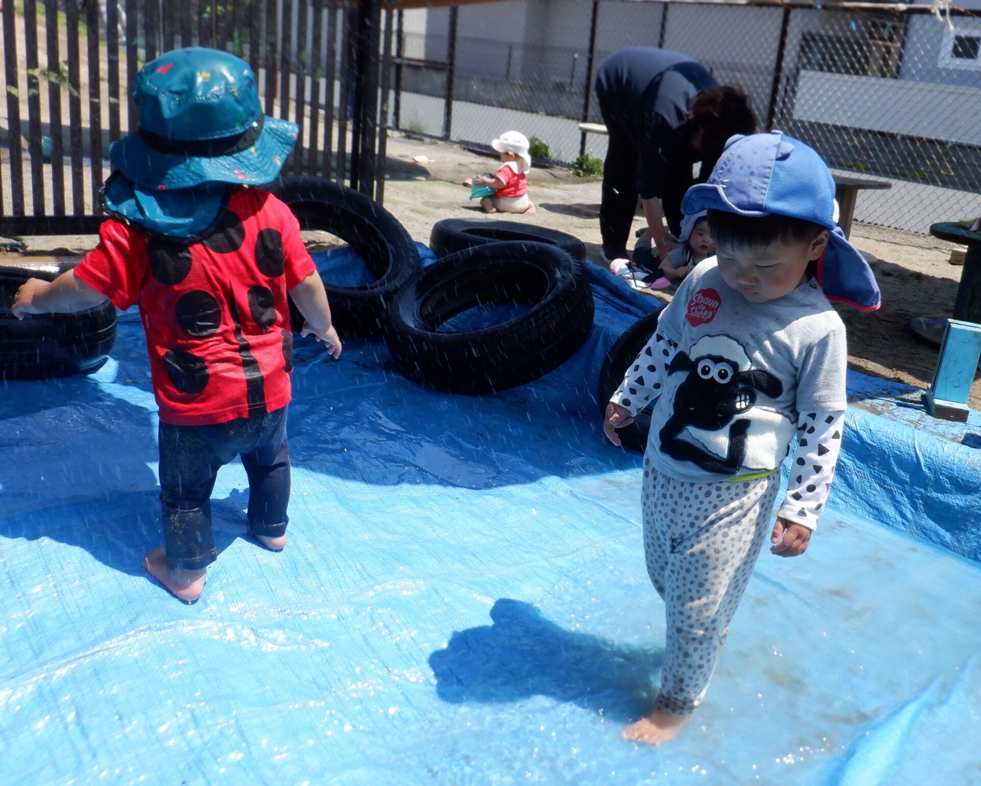 ある気温が高くて暑い日・・・先生が砂場にブルーシートを敷いて何やら準備中・・。