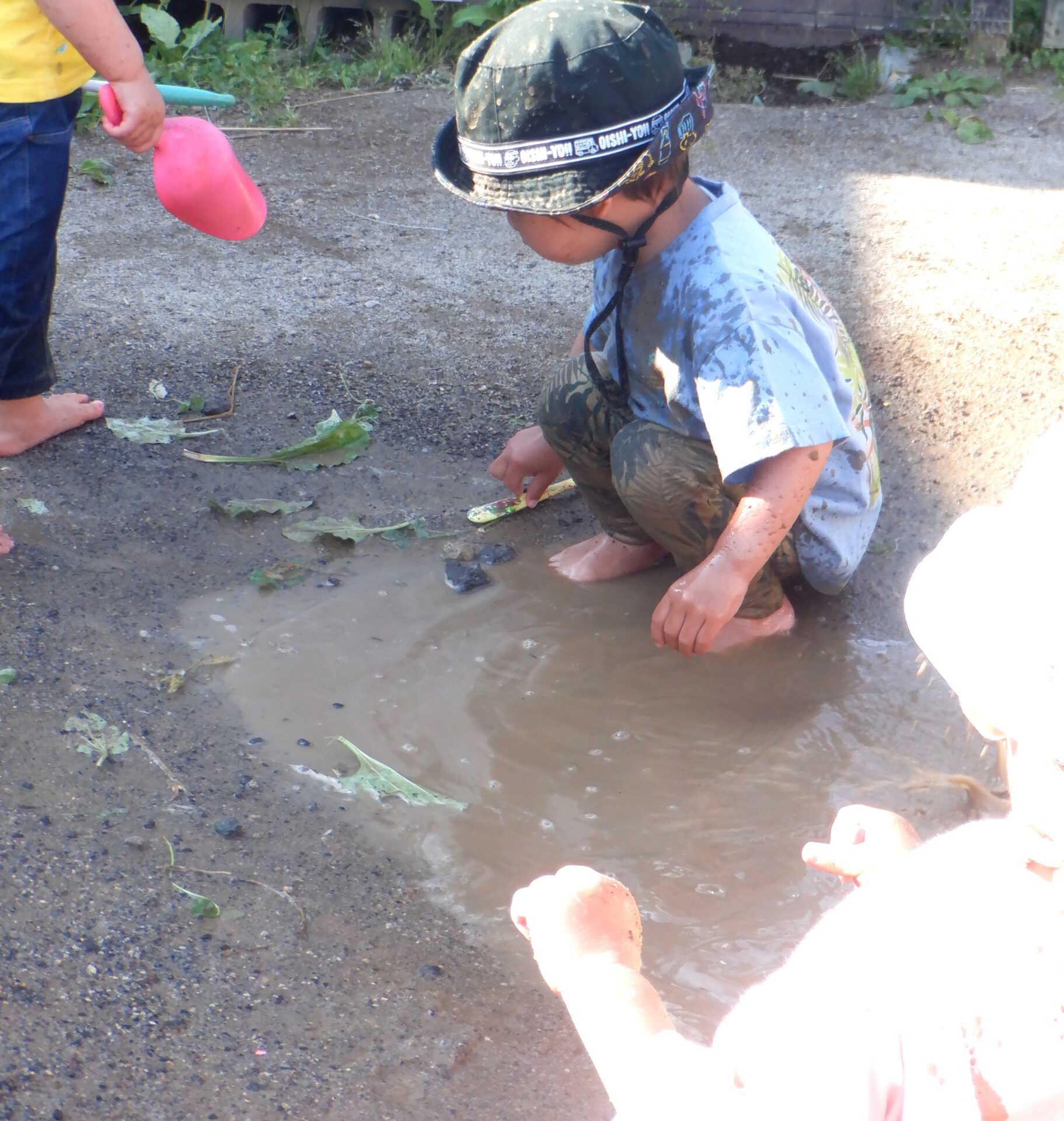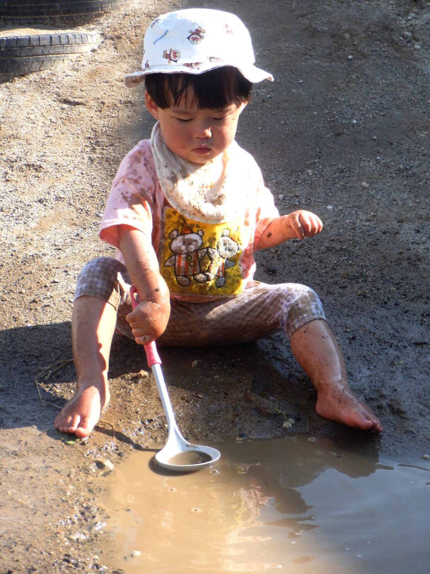 2025.06.06 しずく組(1歳児) ブログ みーつけた 雨が降ってできた水たまり。 発見して、おたま・スプーンを持ってくると・・・。 ダイナミックに!! 顔にかかってもへっちゃら! 楽しかったようで素敵な笑顔が見られました。 一覧へ戻る