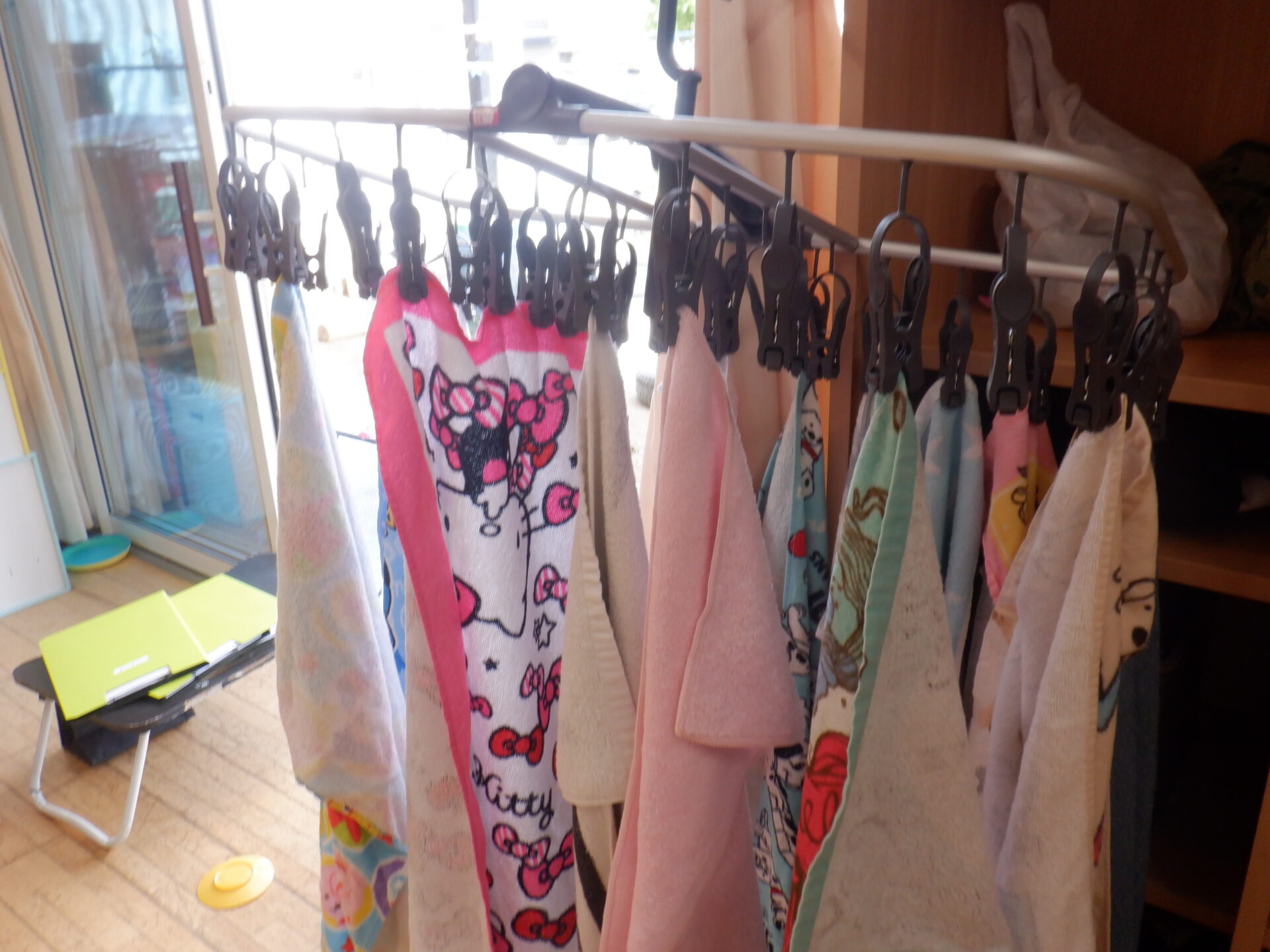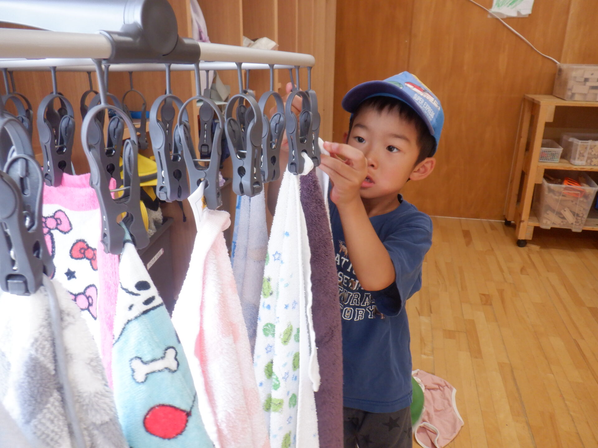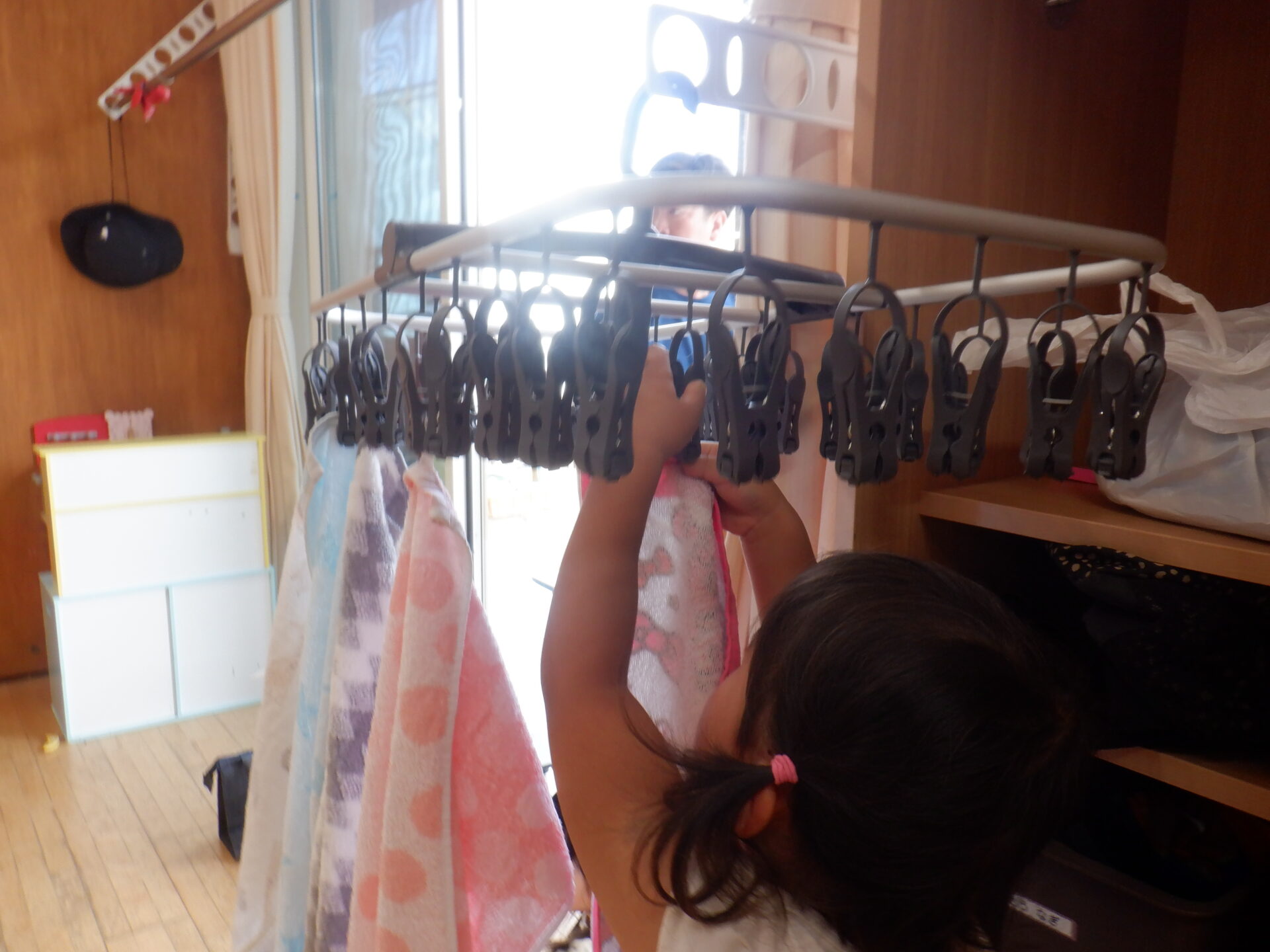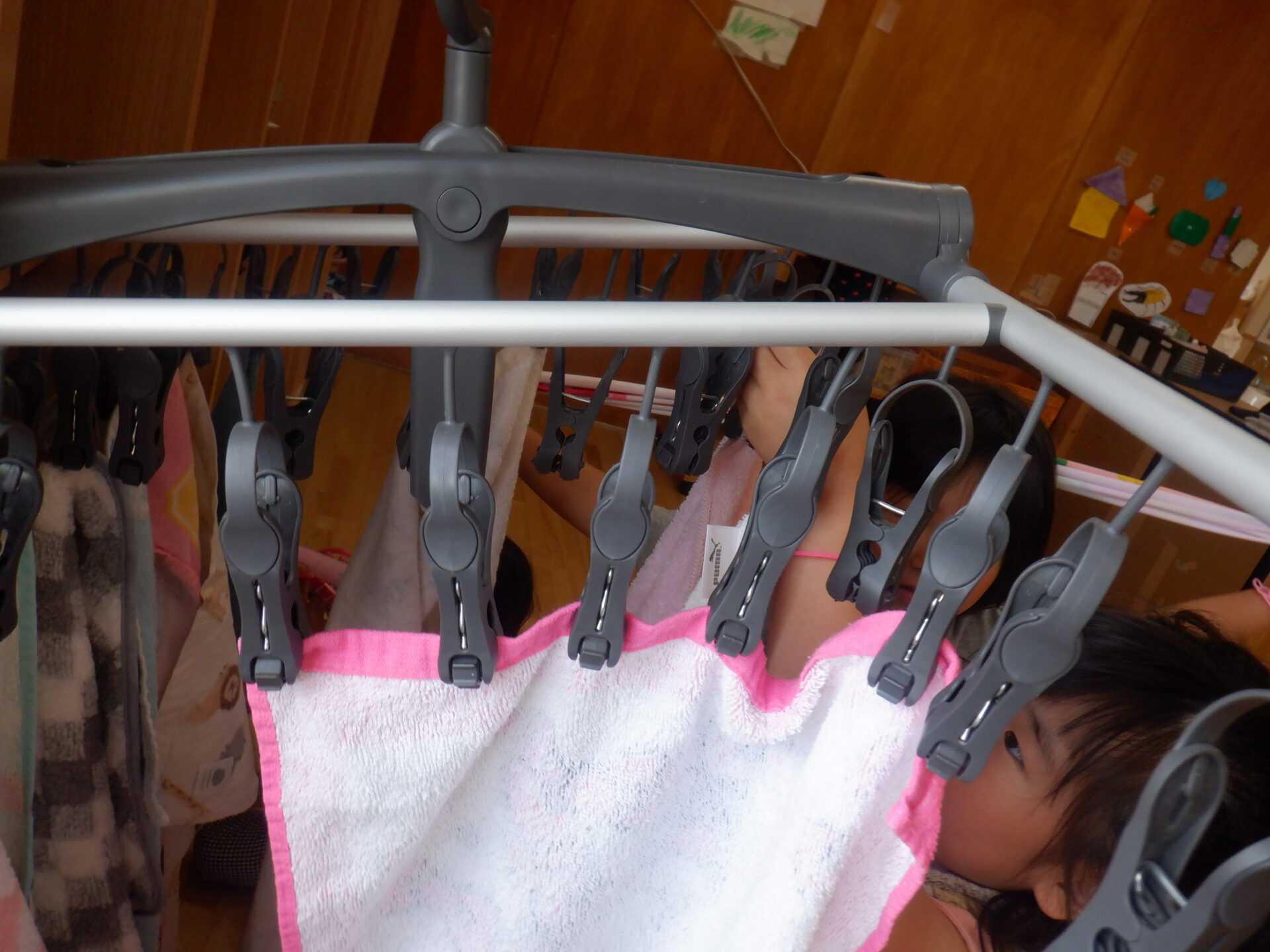 タオルは洗濯ピンチハンガーに自分で掛けますが、