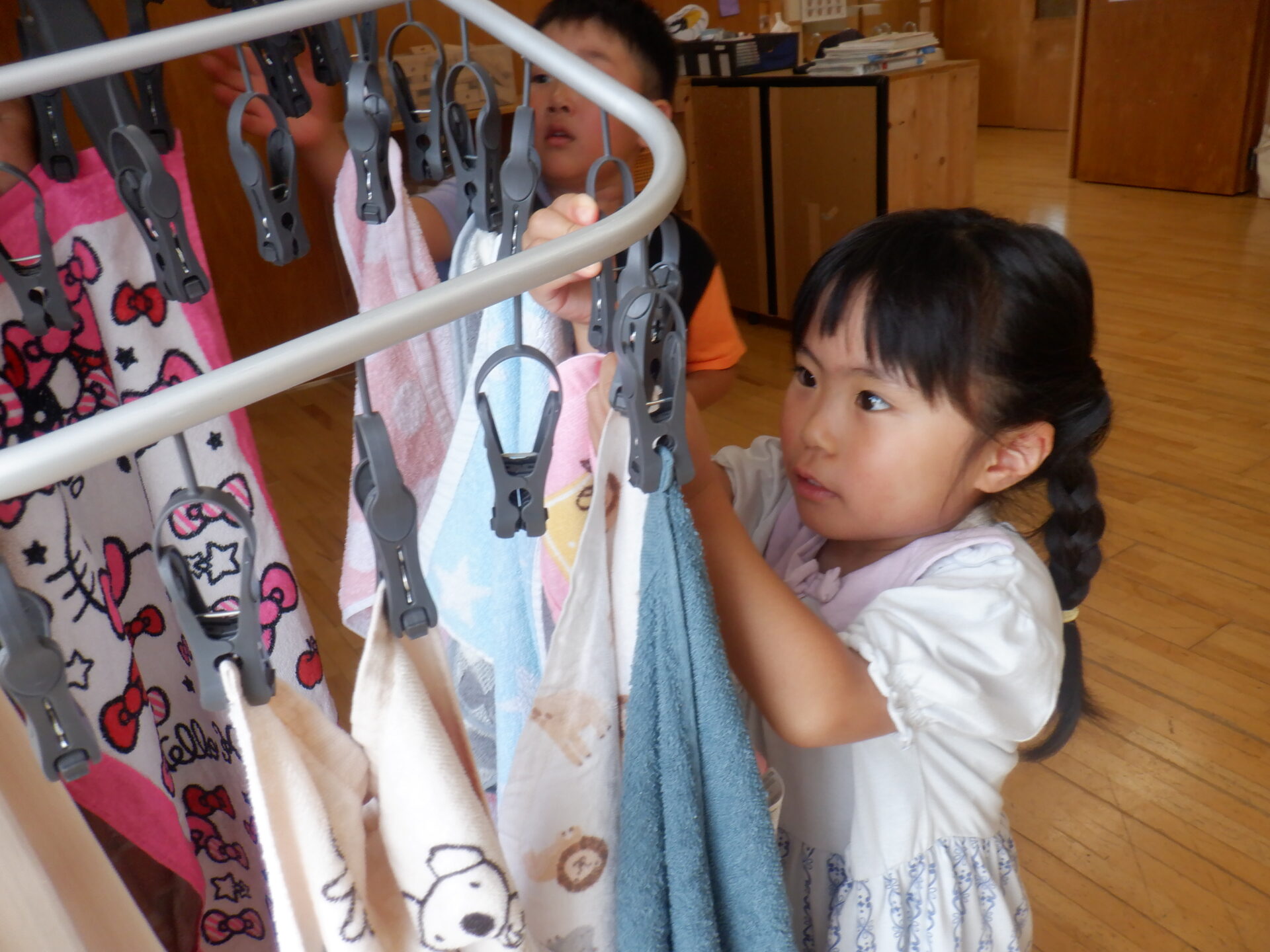 みんな真剣にタオルをかけています。