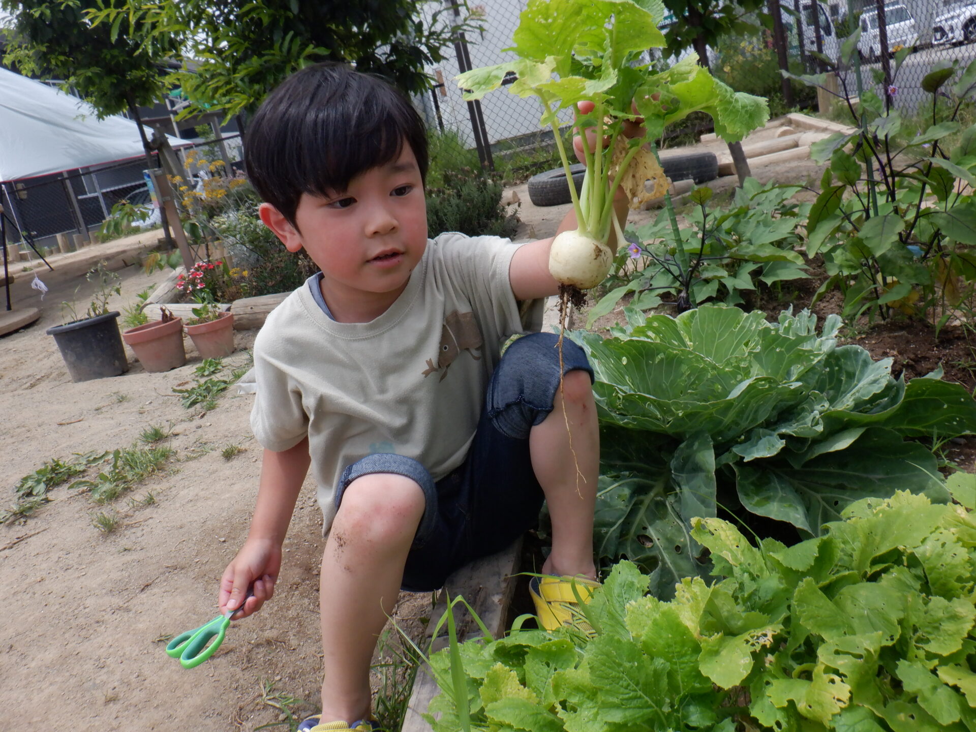 畑の野菜を世話をしていた男の子が