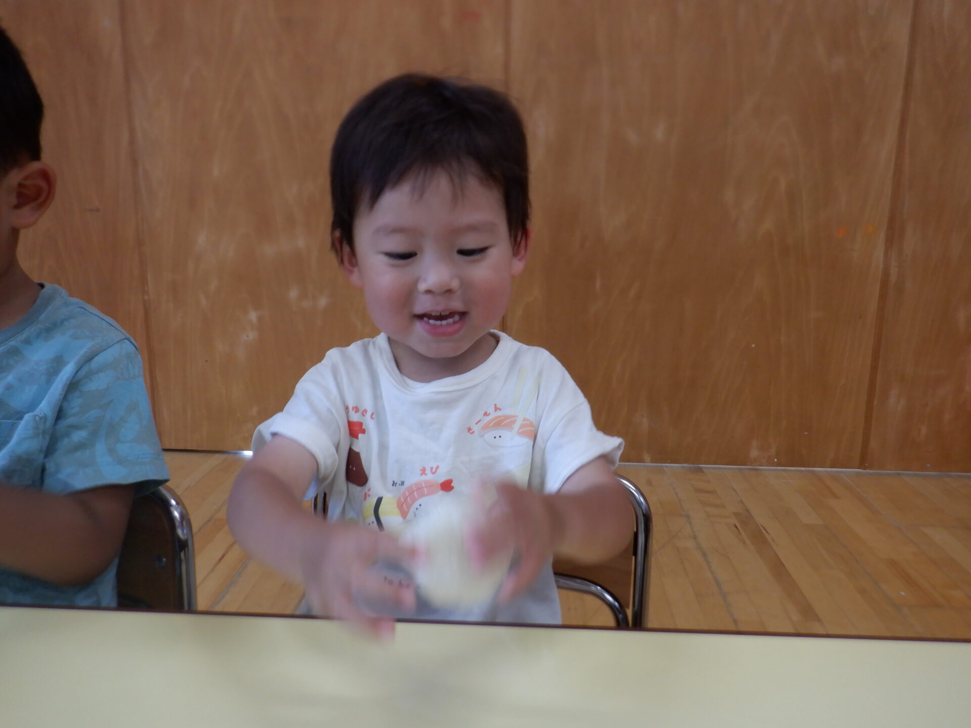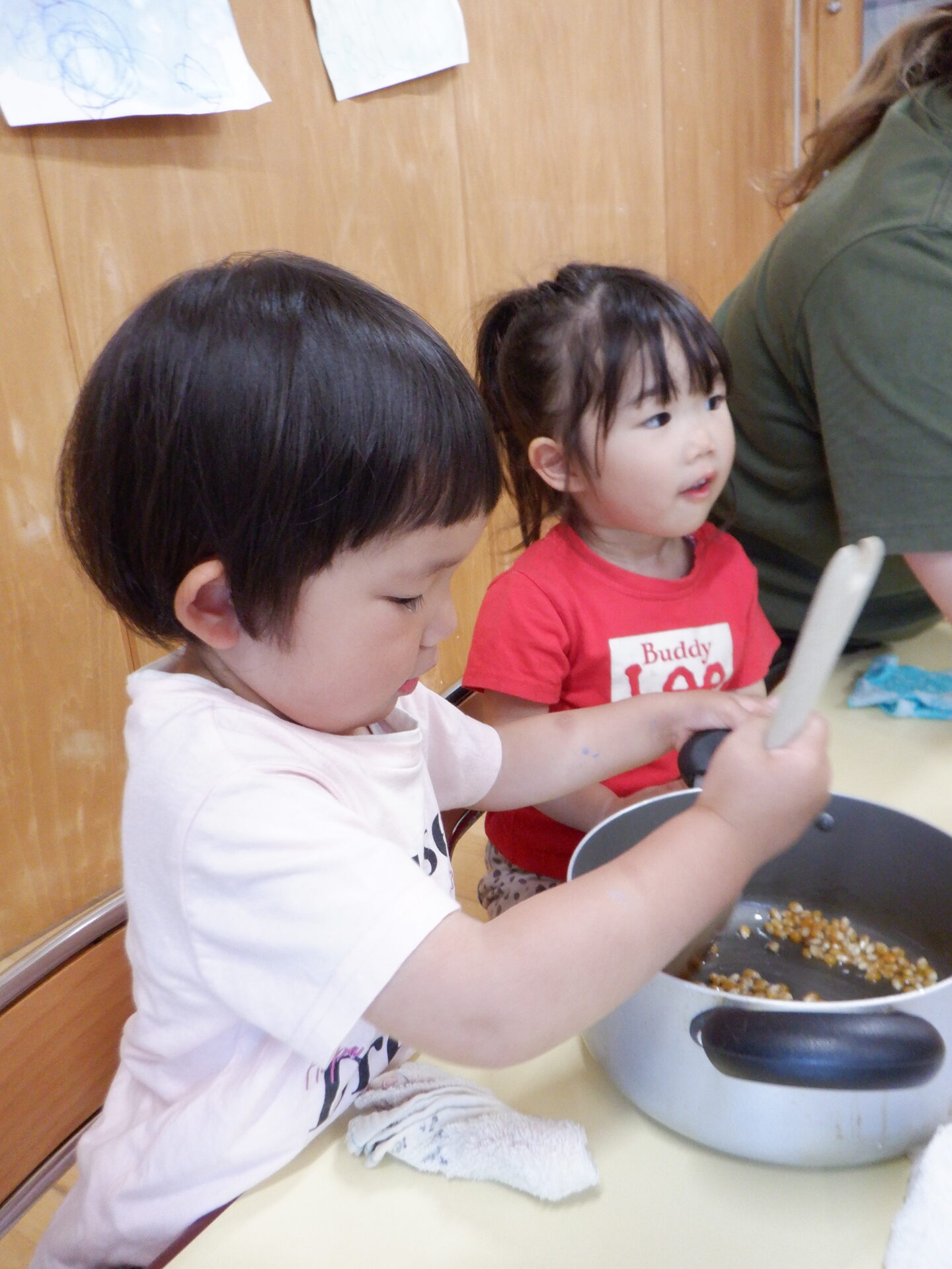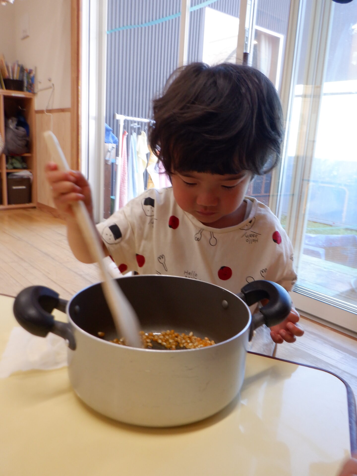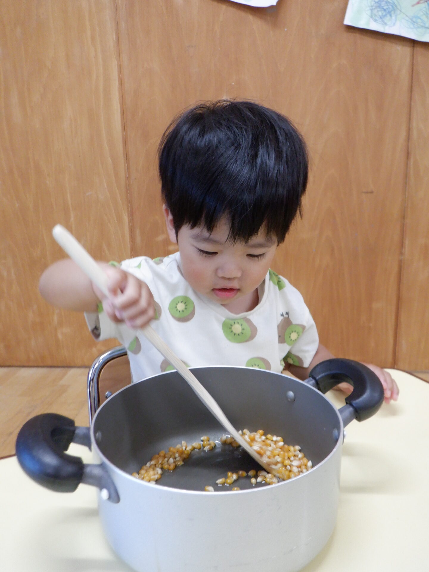 戸外遊びで、白い石集めをして遊んでいて「これポップコーンみたい。」「食べたことあるよ。おいしいよね。」と会話が盛り上がっていたので、本物を作ることに挑戦しましたよ。
