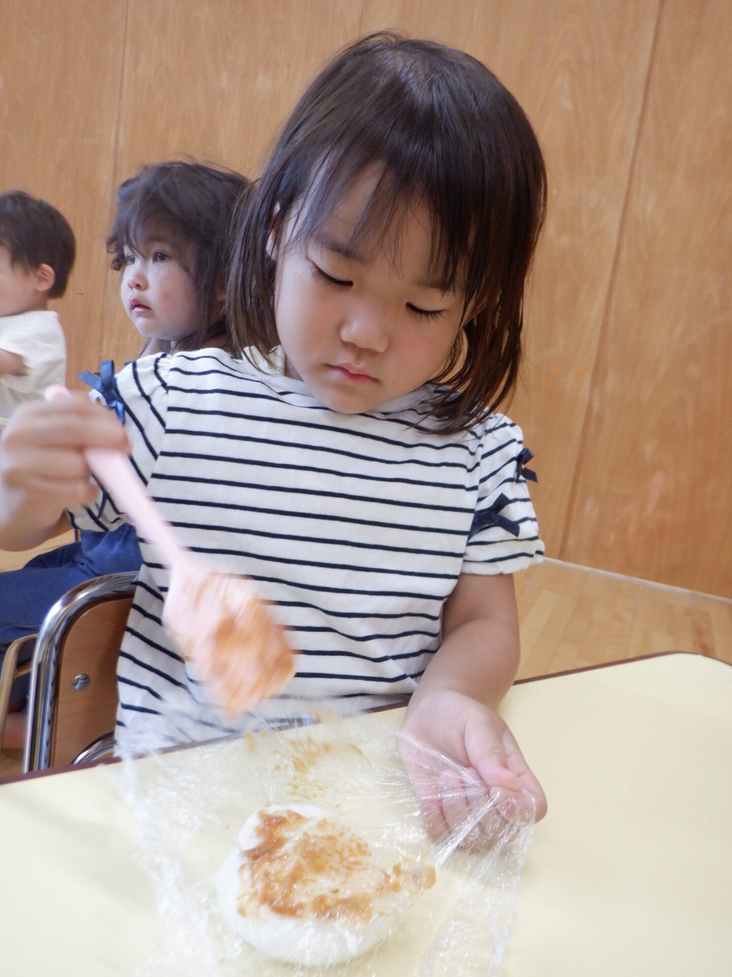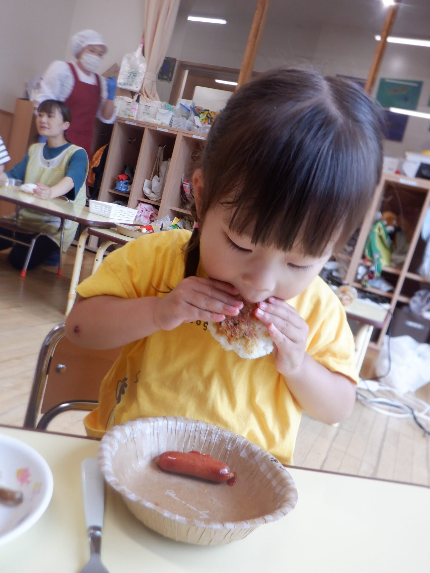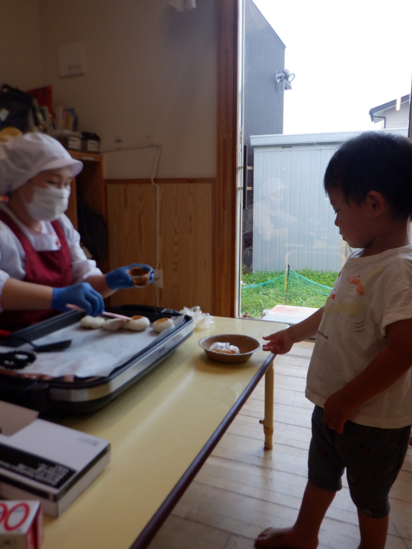 自分たちで握って味噌をぬったおにぎりは、給食の先生に焼いてもらいました。