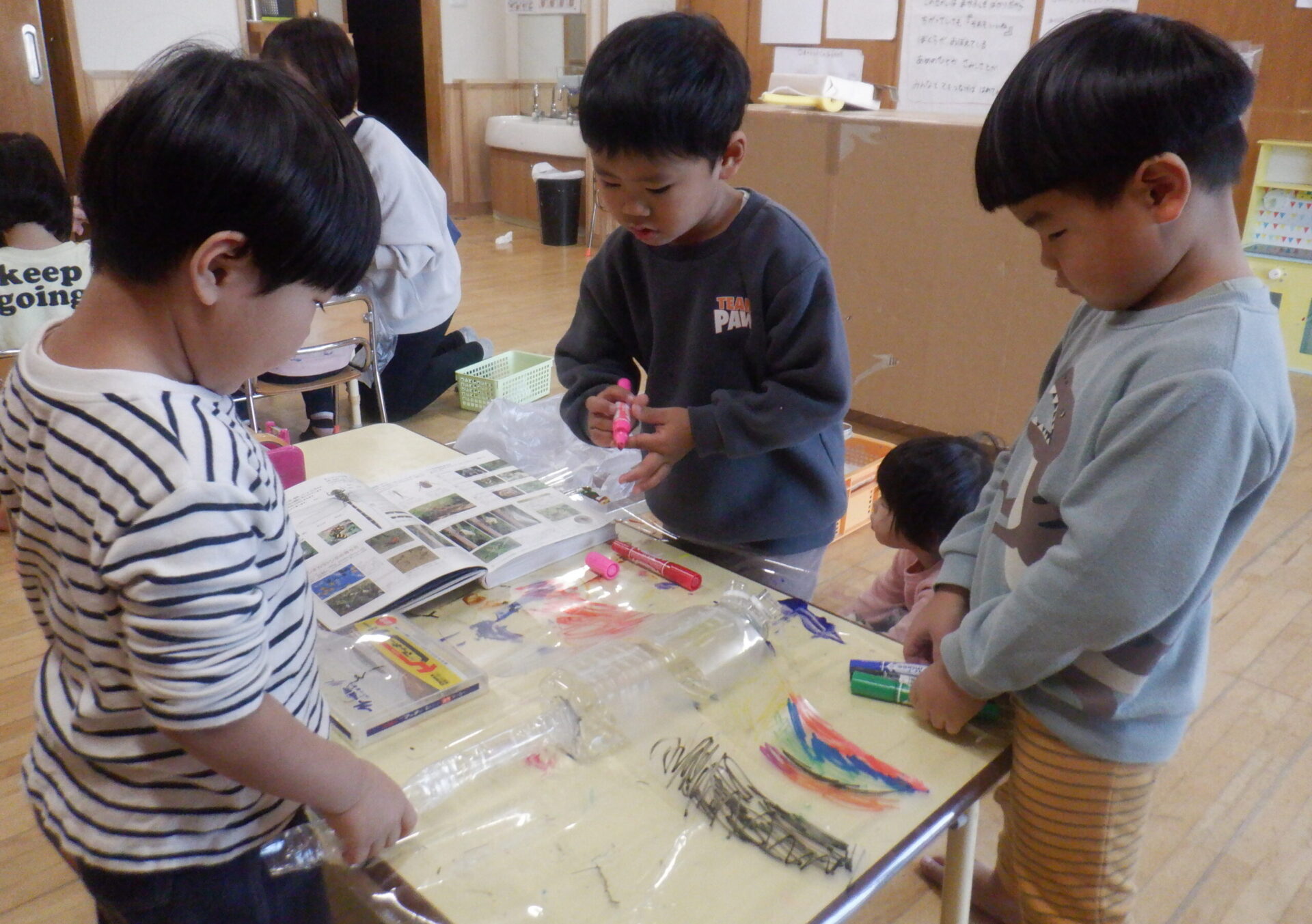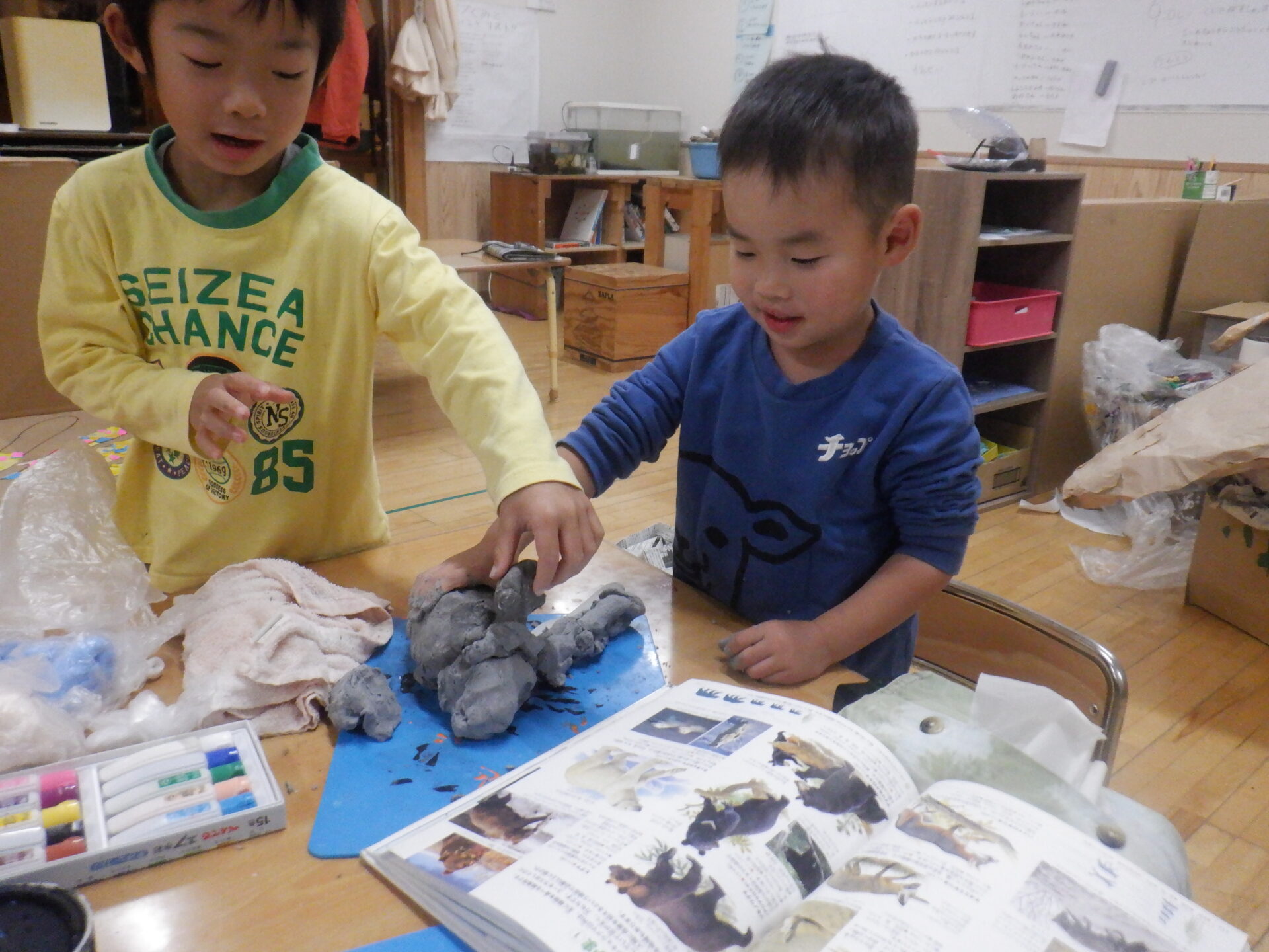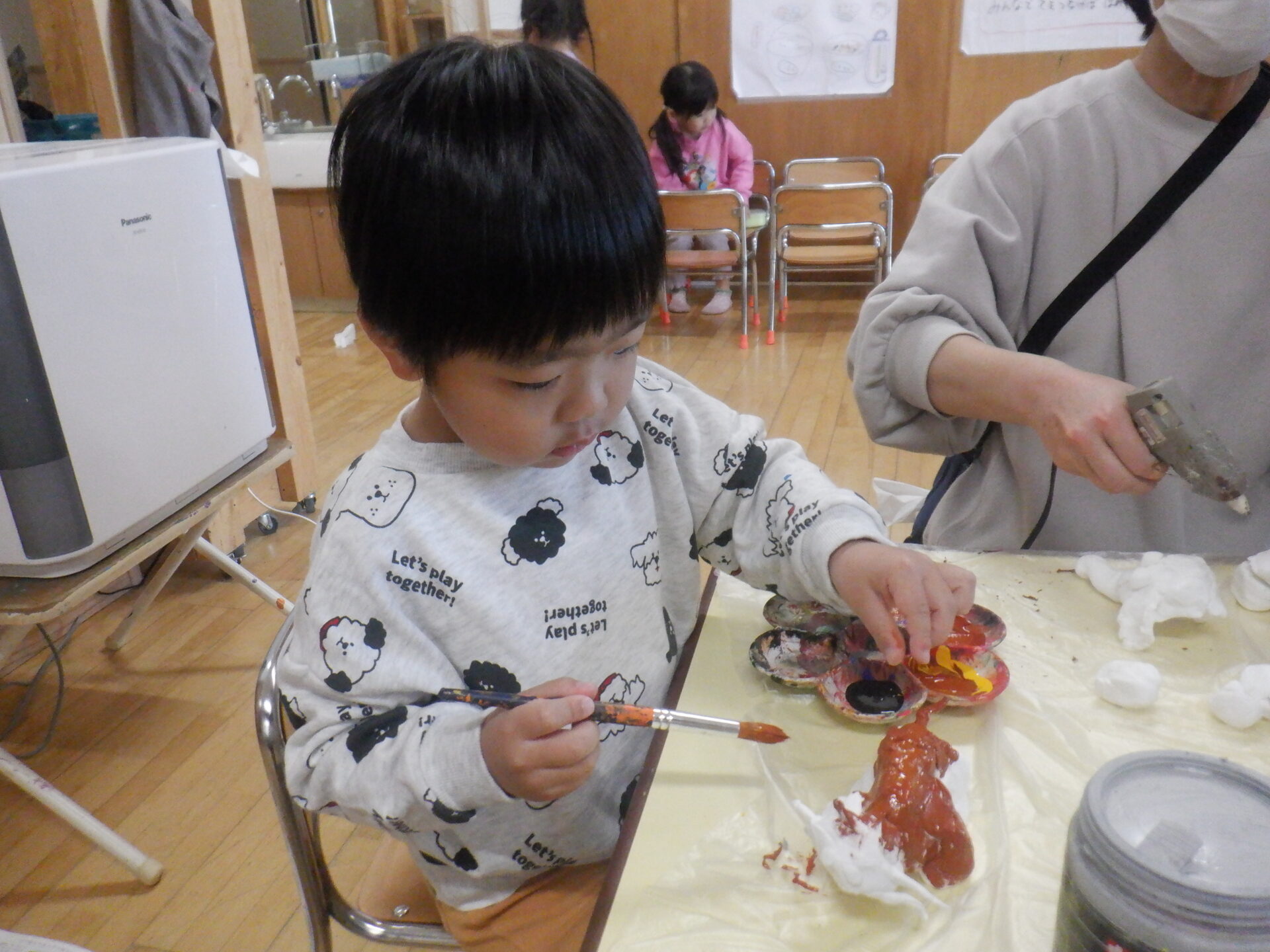 「ここはこうするといいよ」と5歳児クラスのお兄さんに教わりながら好きな物の制作を楽しんでいます。他のクラスからの良い刺激を受けています。