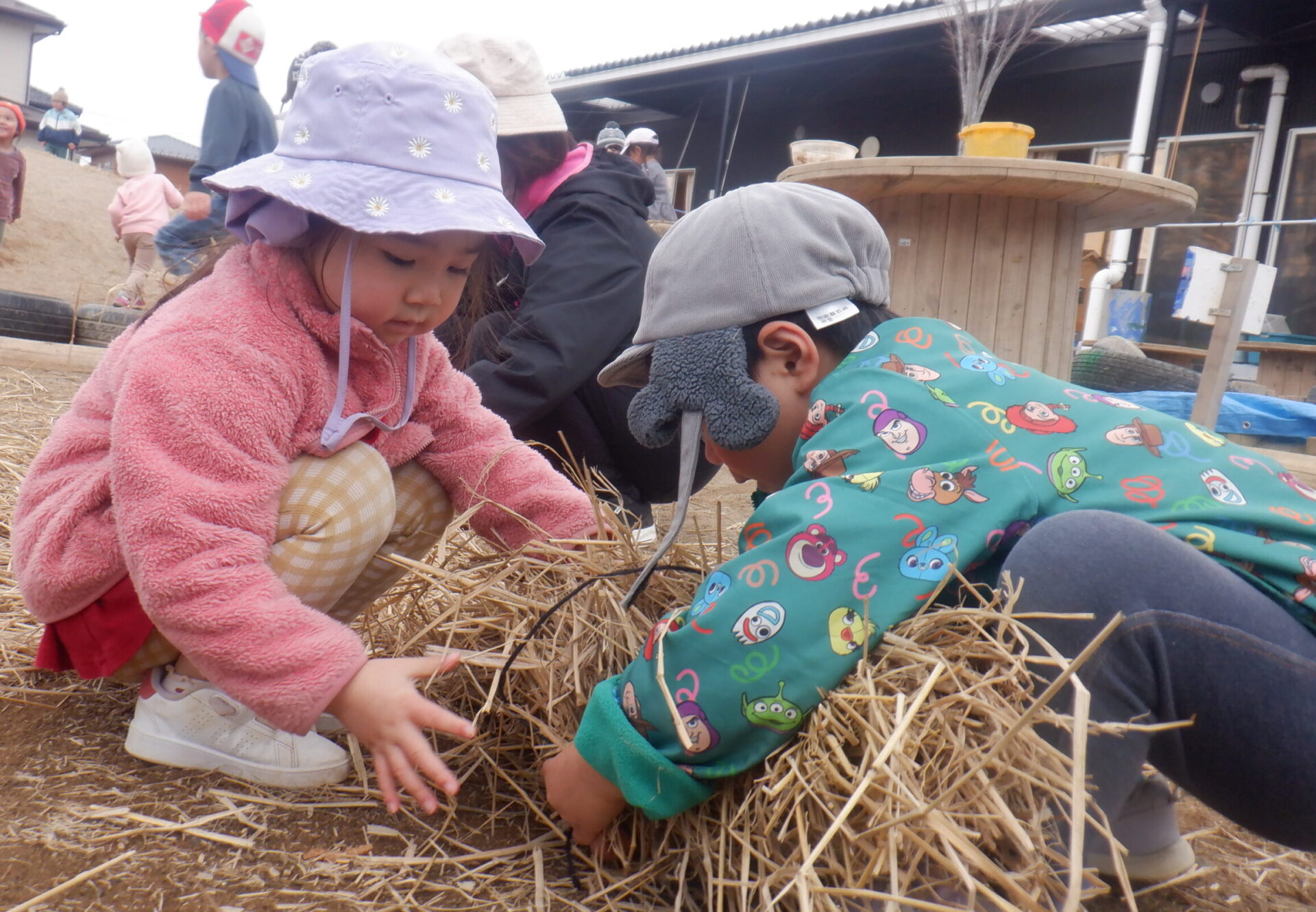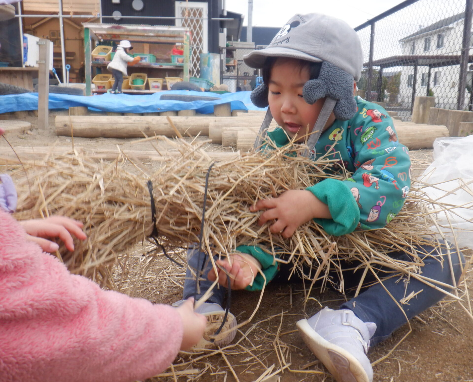 こちらでは『3匹のこぶた』から興味が湧いて”家を作りたい”とわらの家を作っています。