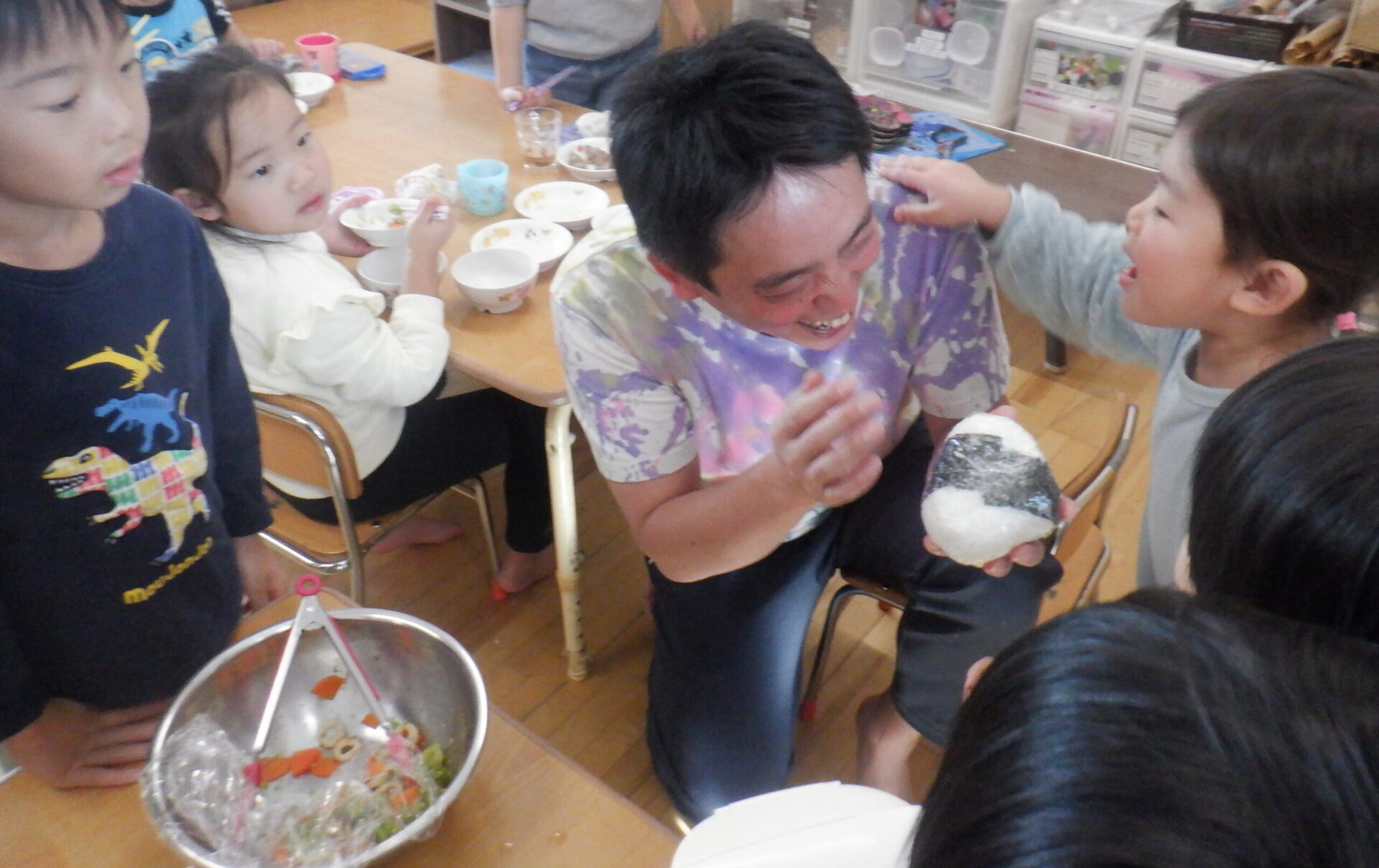 他クラスの先生へごちそうしたいと愛情も大きさもたっぷりな巨大おにぎりをプレゼントしようとにんまり。