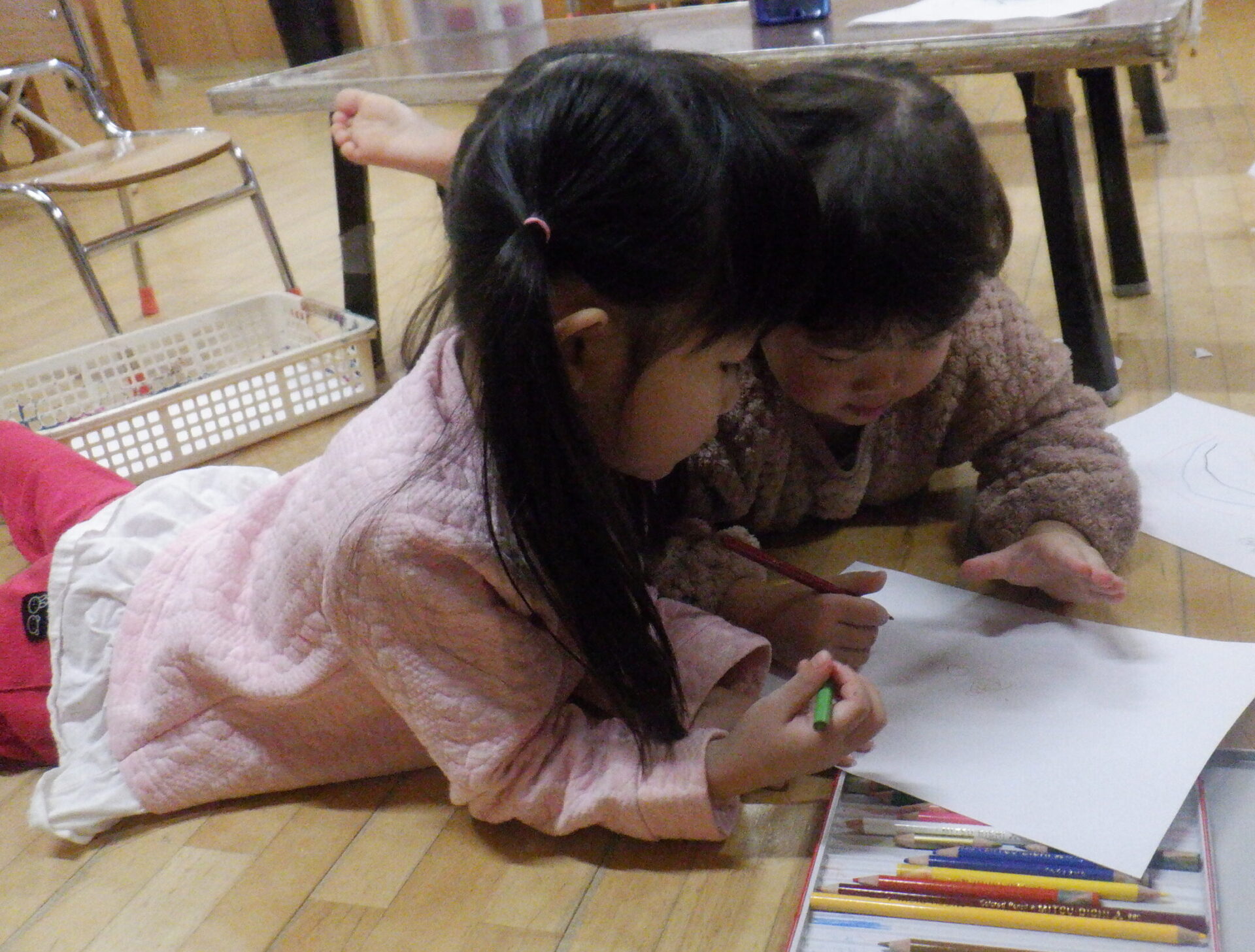 寝転んでリラックスして友だちと一緒に描く。とても楽し気で素敵な光景です。