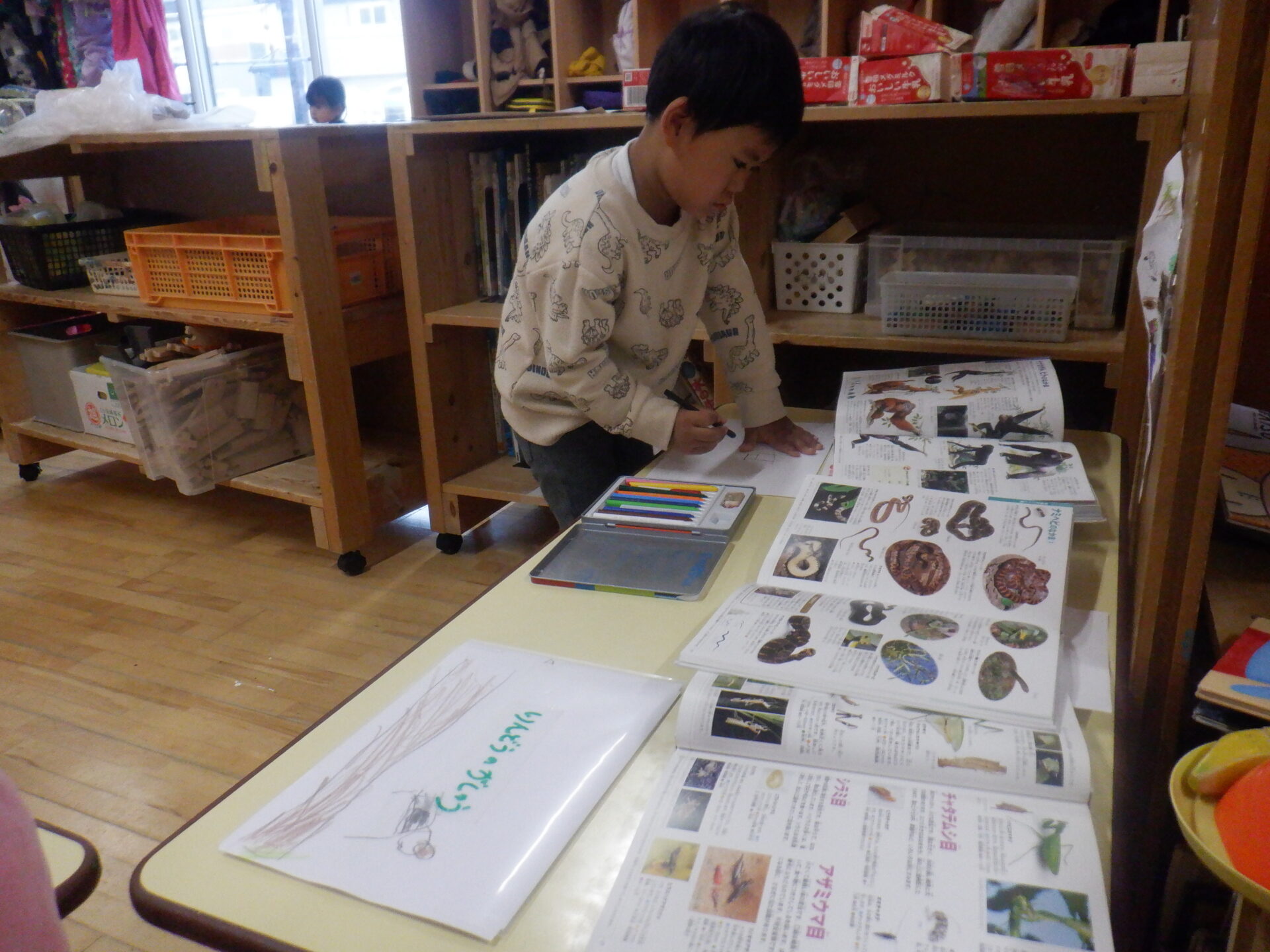 ずらーーーりと図鑑を並べてお絵描き。「お部屋に展示したいから」と自分の絵を見てもらう事を喜んで、特徴をよーく捉えて描いています。
