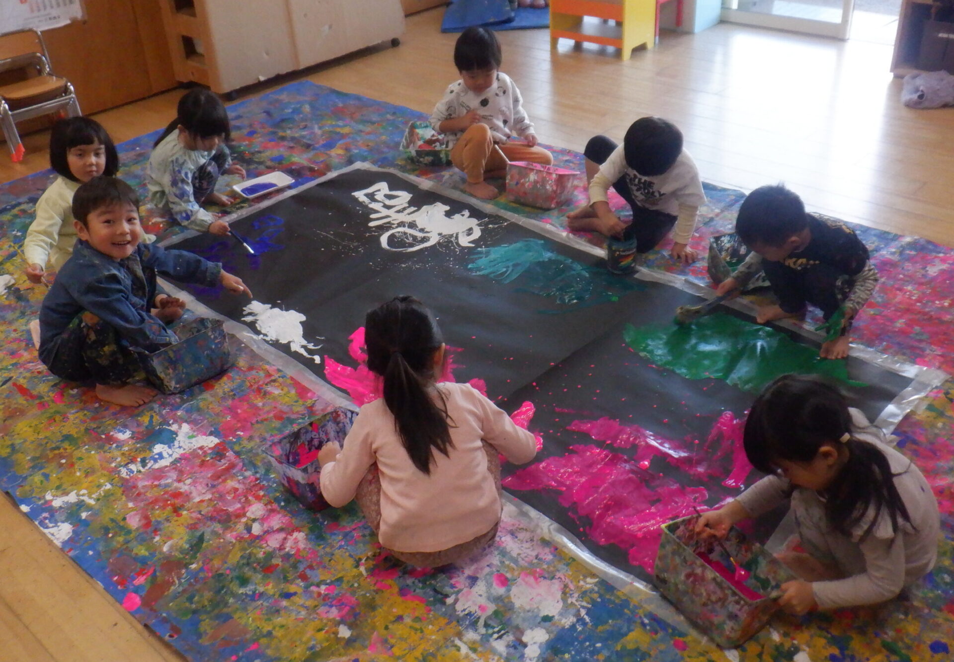 準備も自分達でして、絵の具遊び。好きなカラーで染め上げて、部屋の天井を埋め尽くそうと計画進行中の…宇宙作りを楽しんでいます。