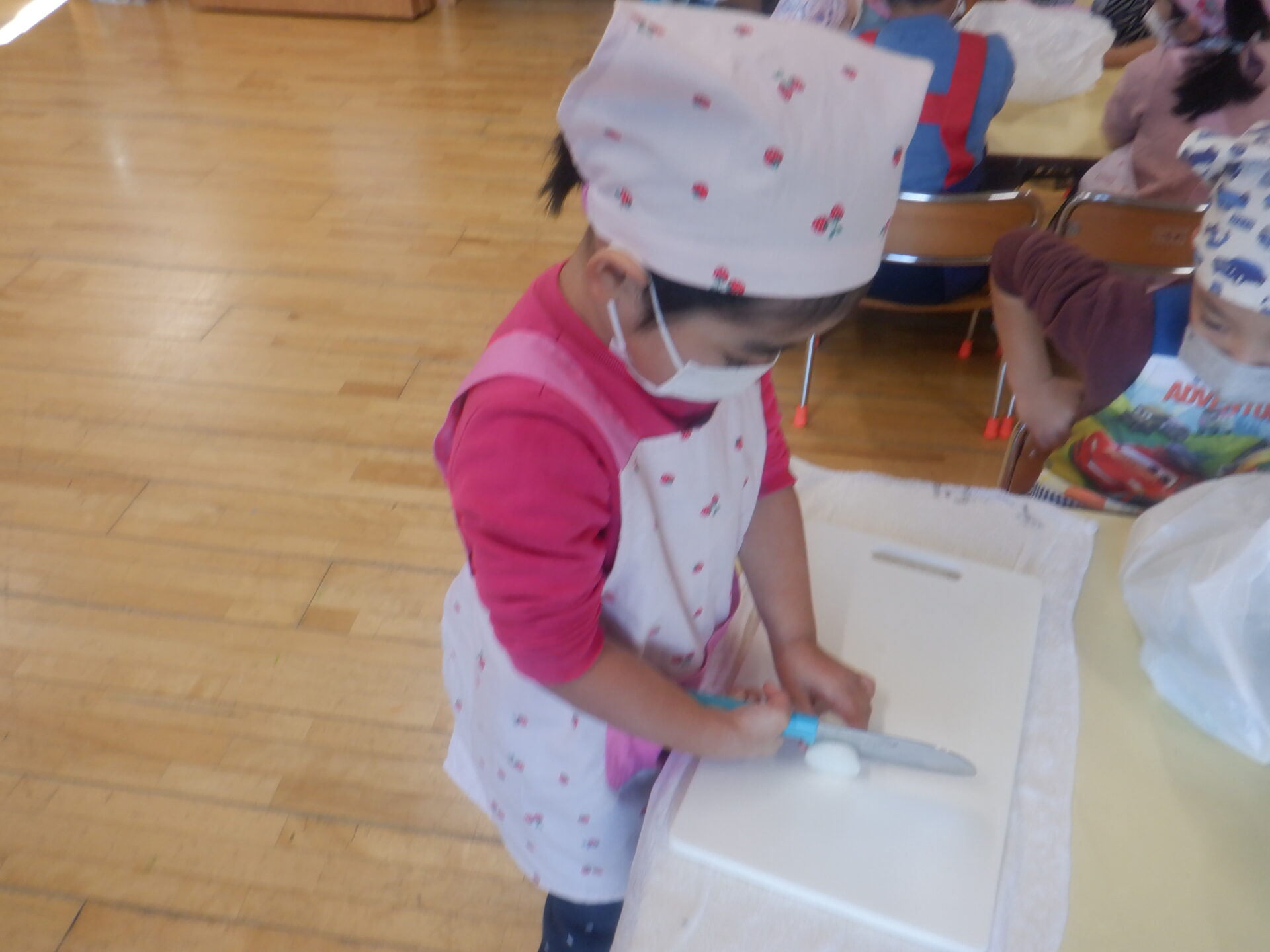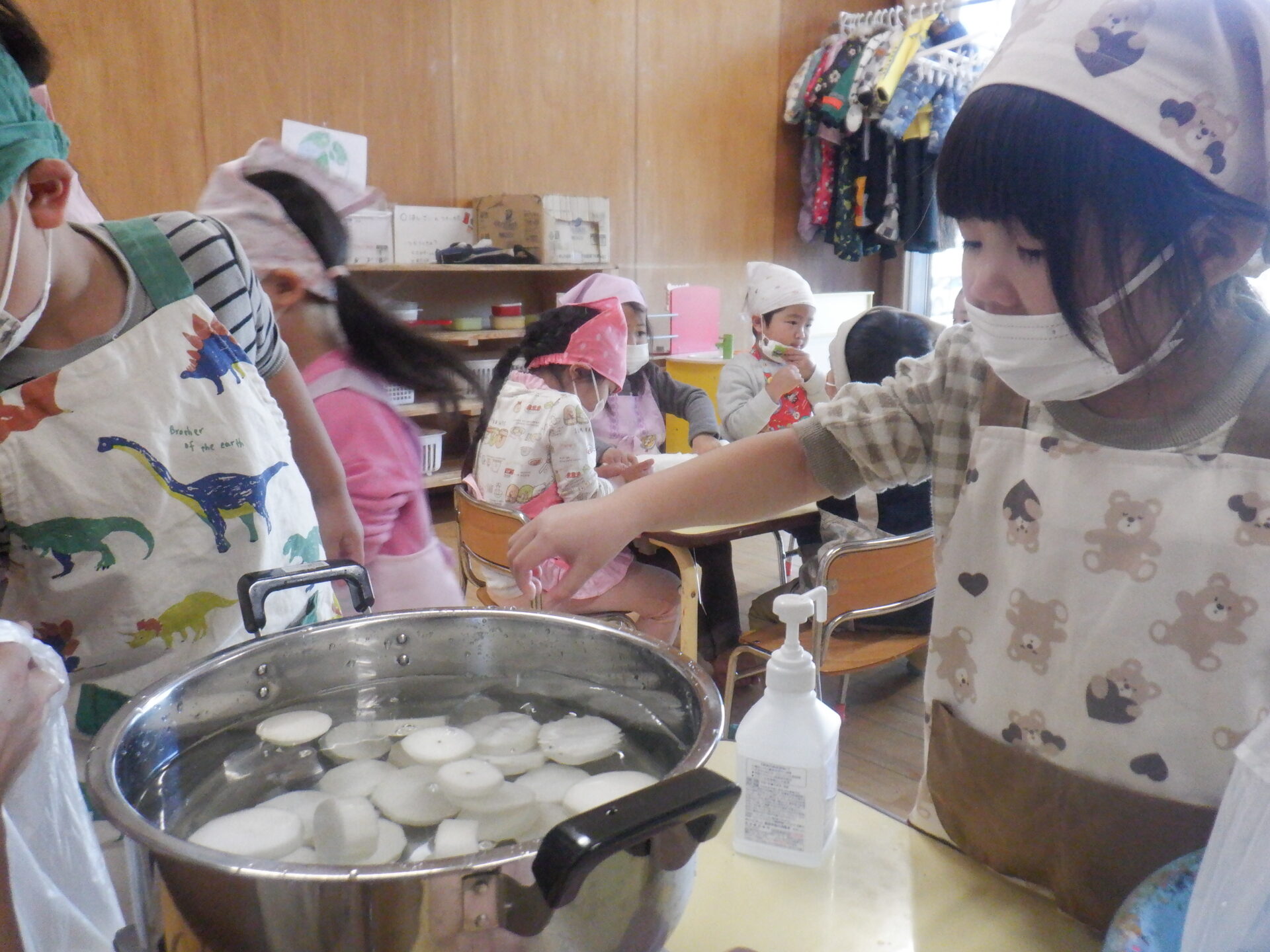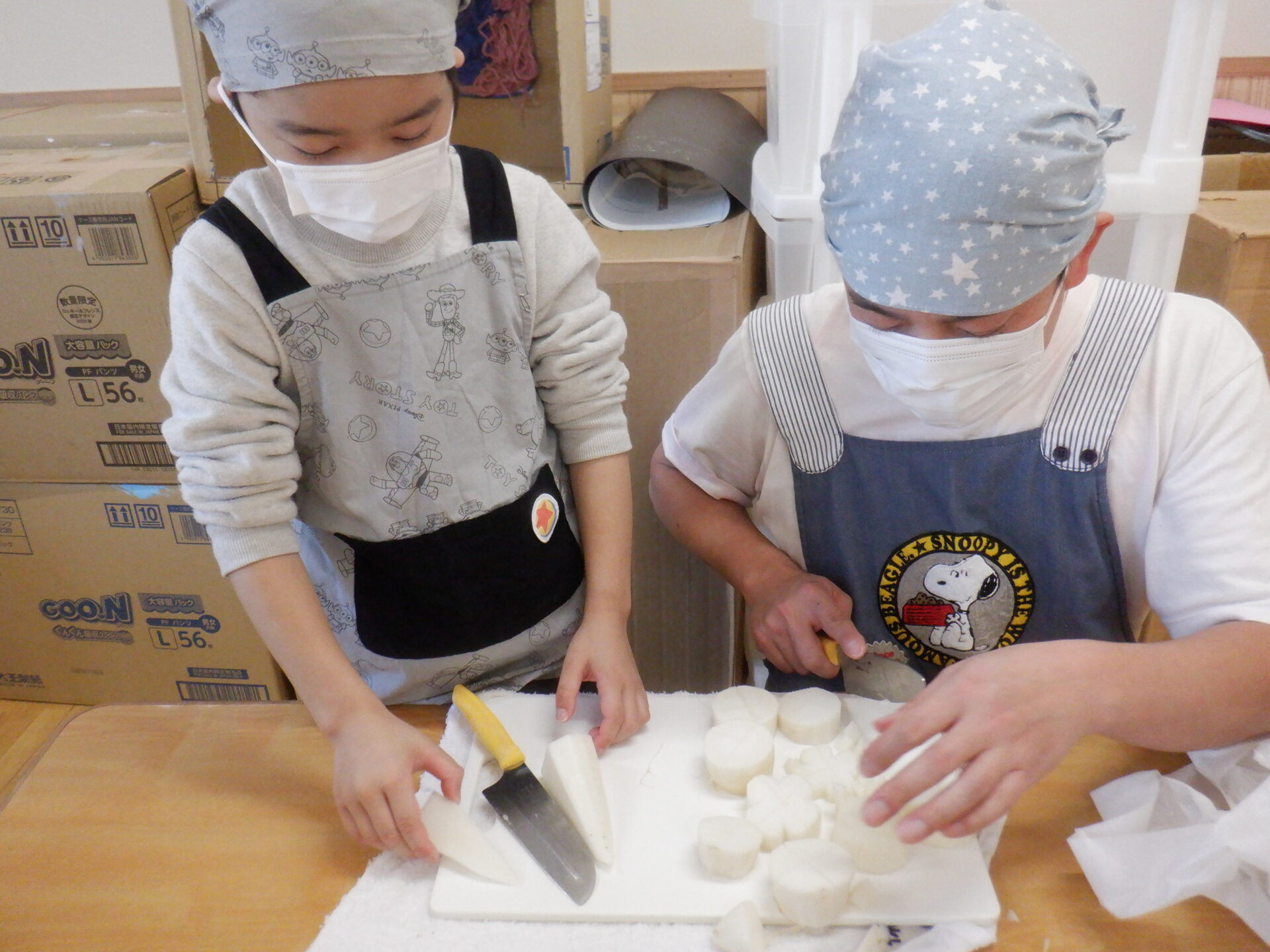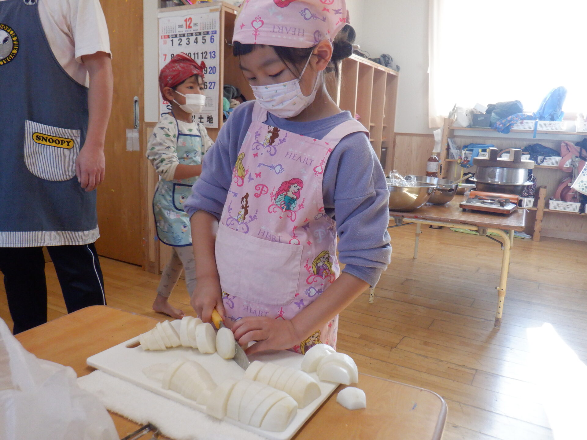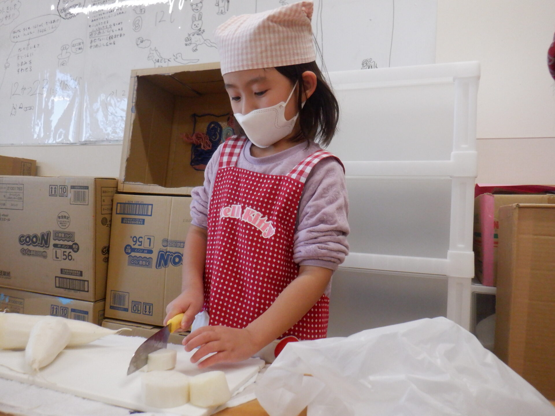 にじ組とひかり組は大根を輪切りに切りました。